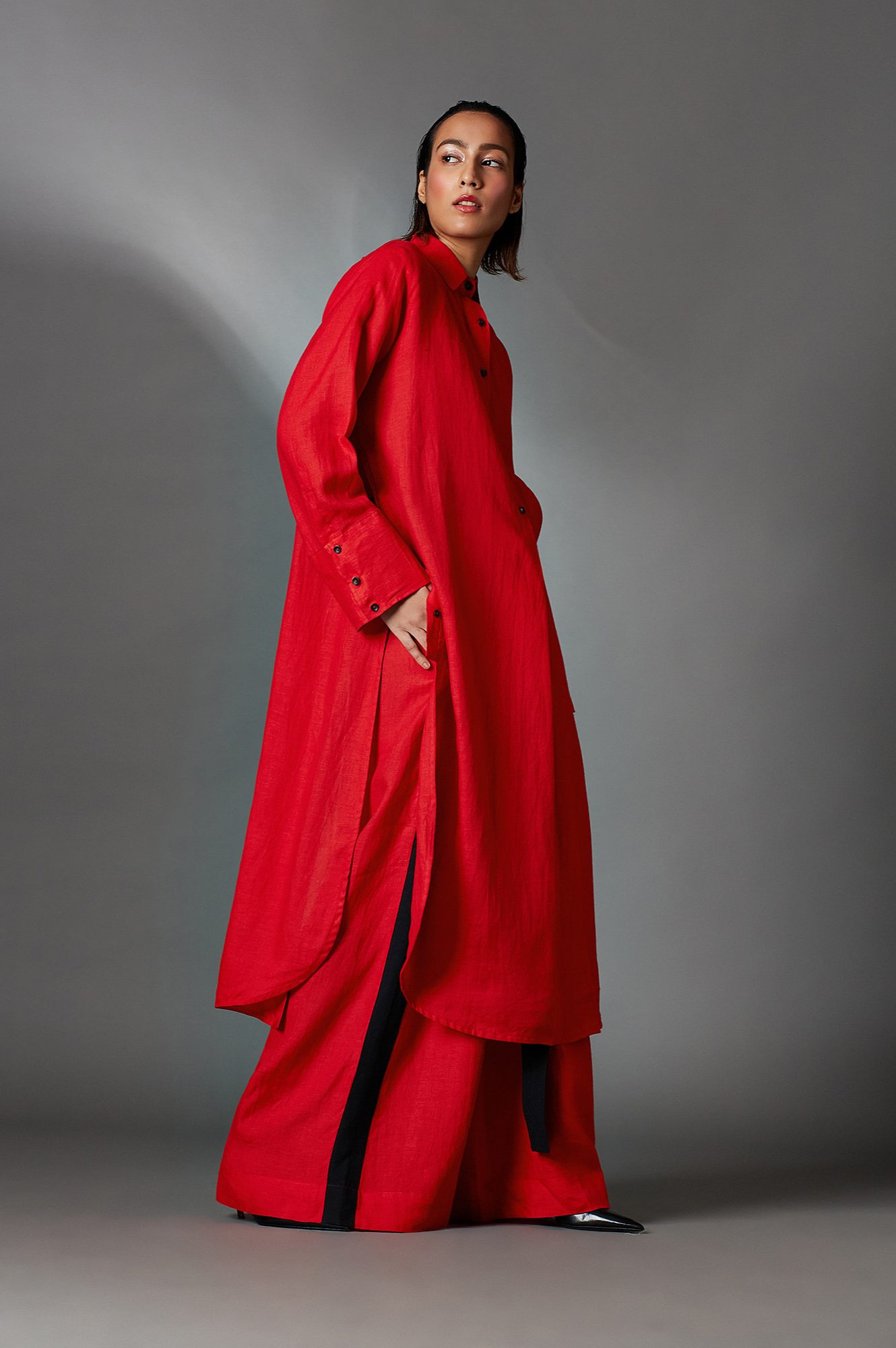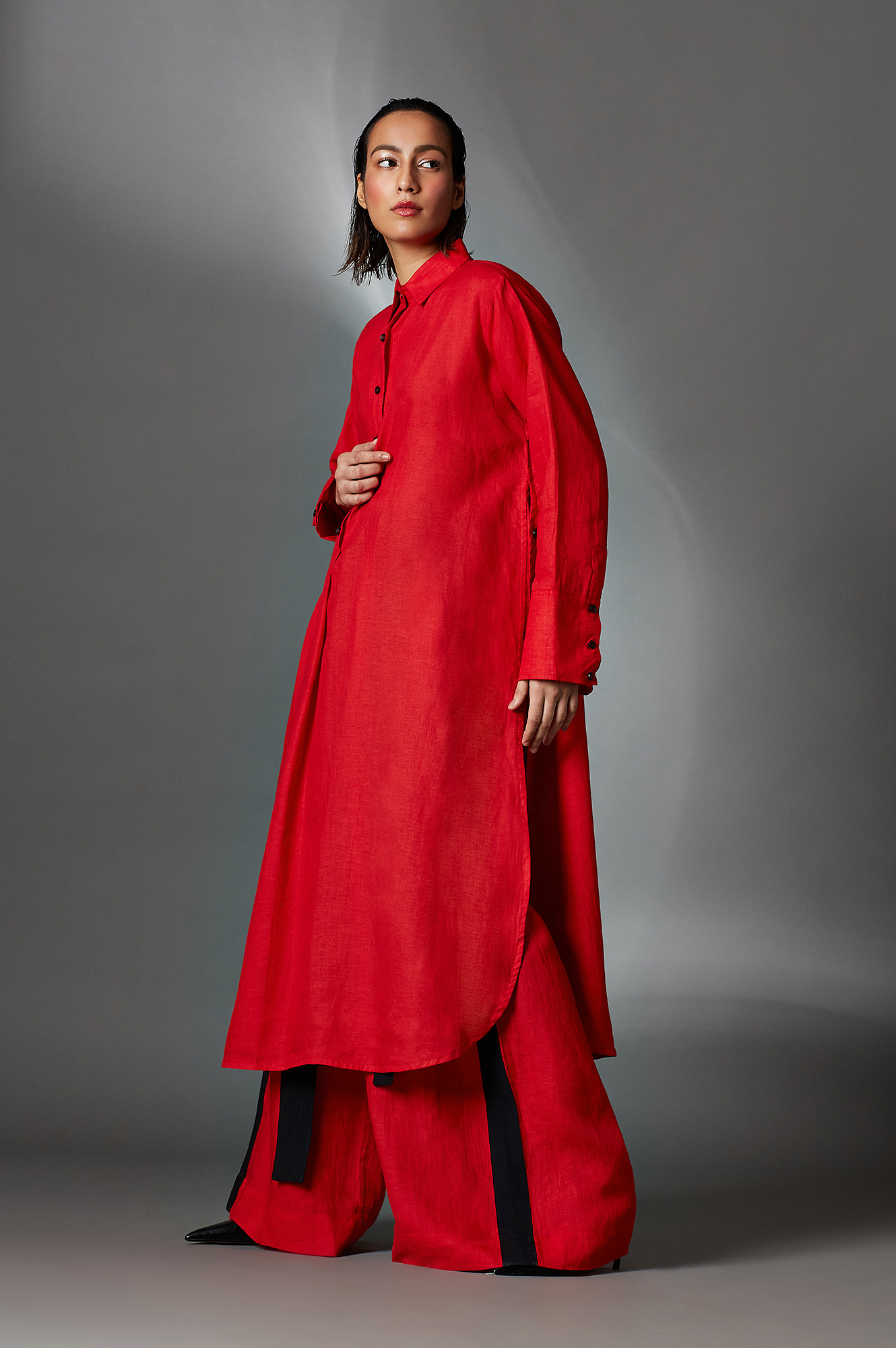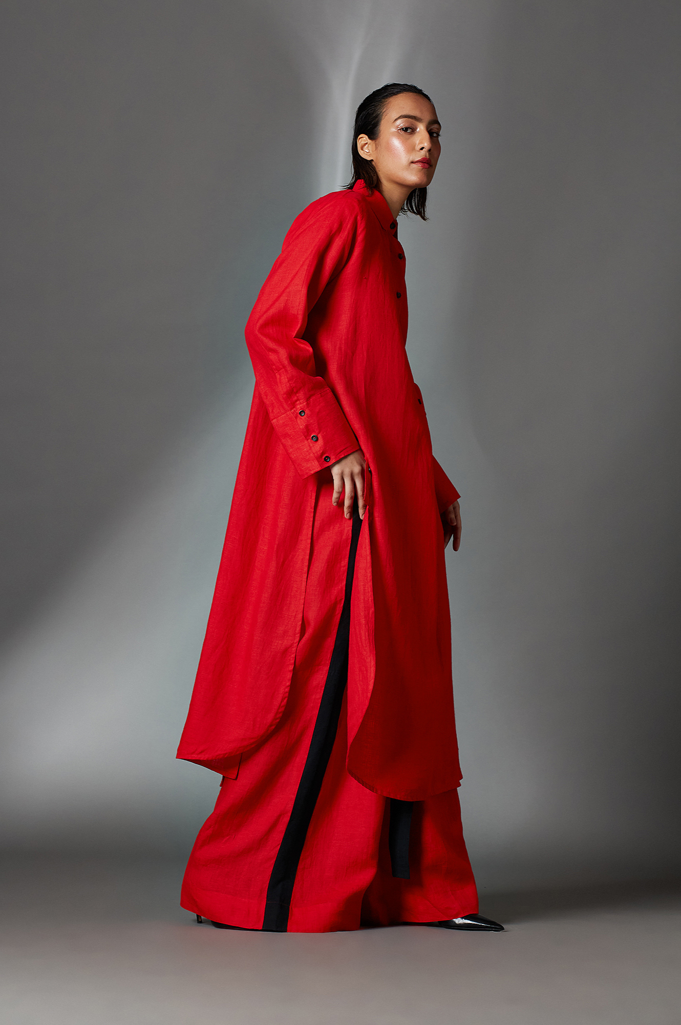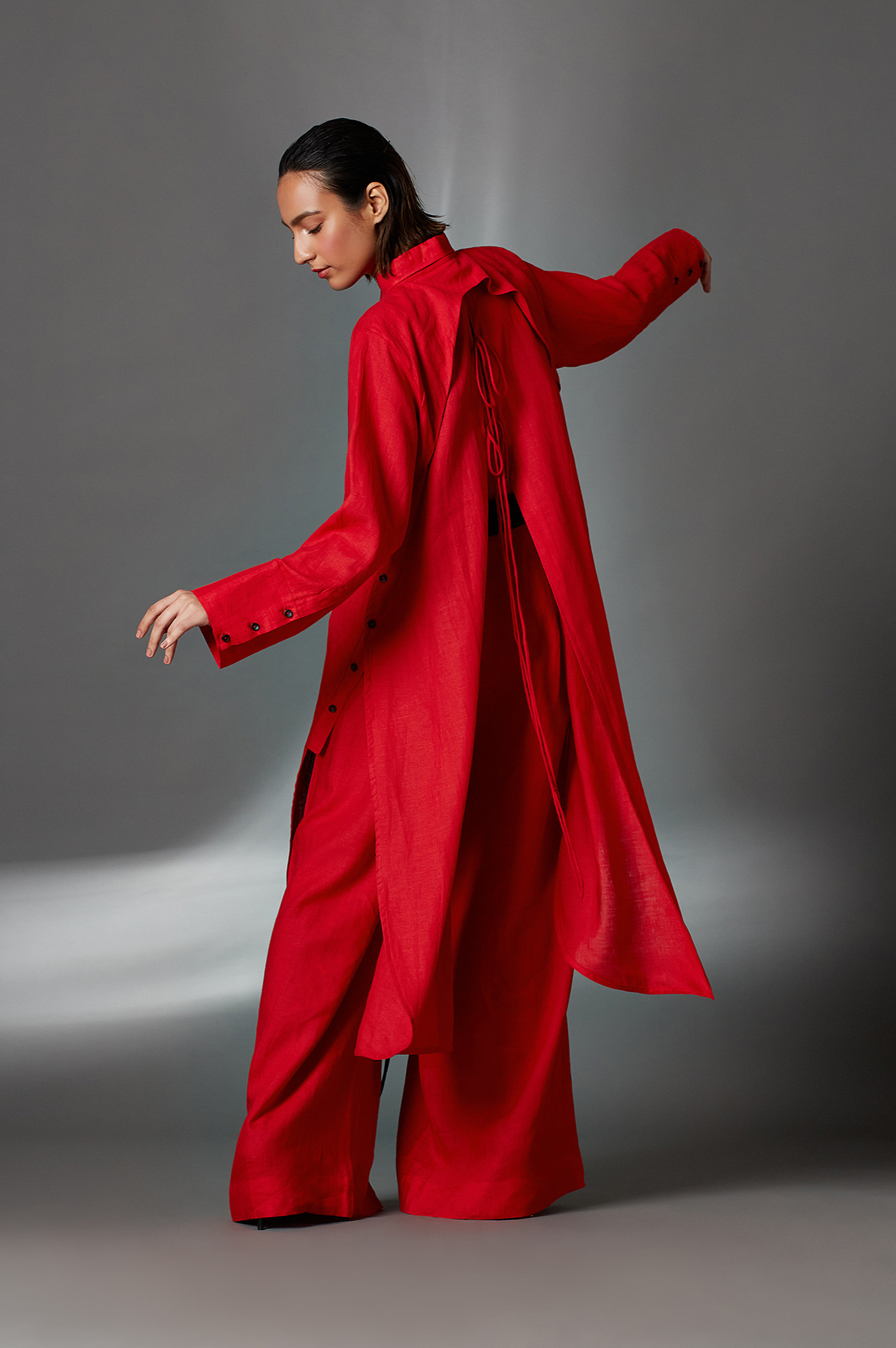 Alvey features a mandarin collar, half-front button-down placket and box pleat detail. Further it has a curved yoke flap and tie-up details at the back.