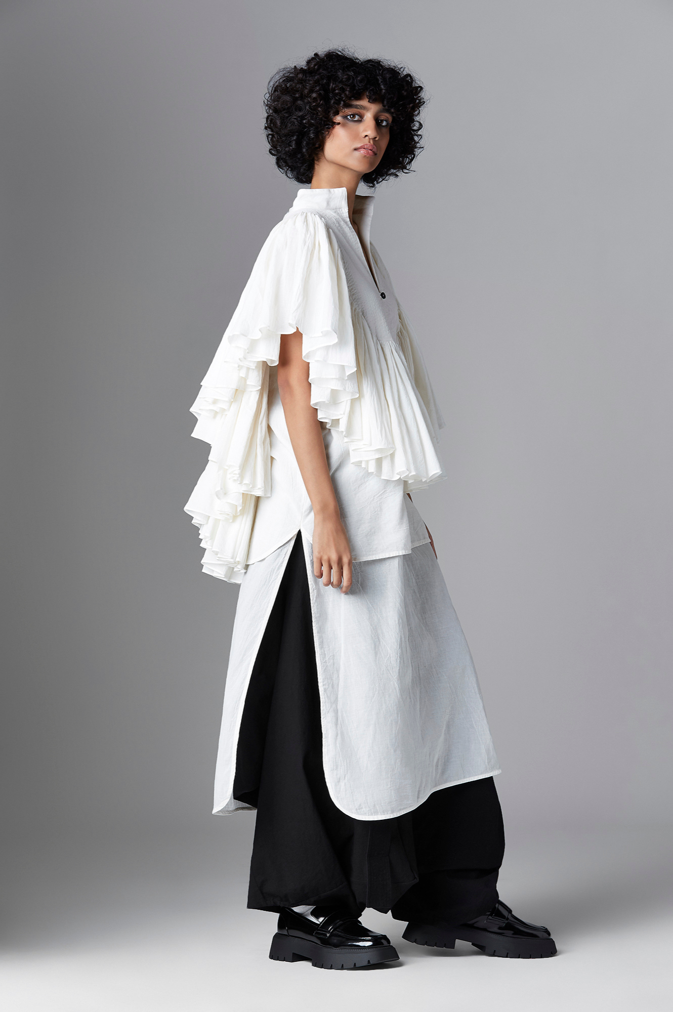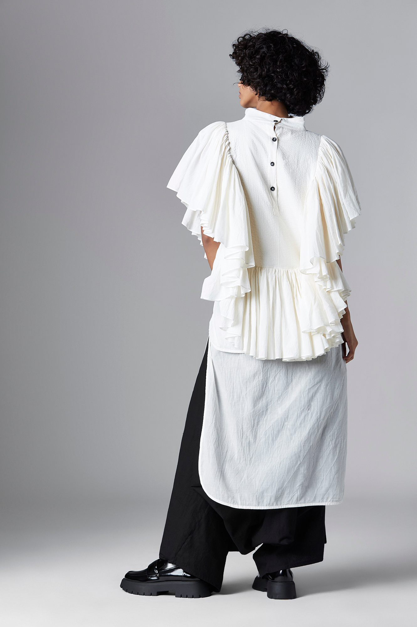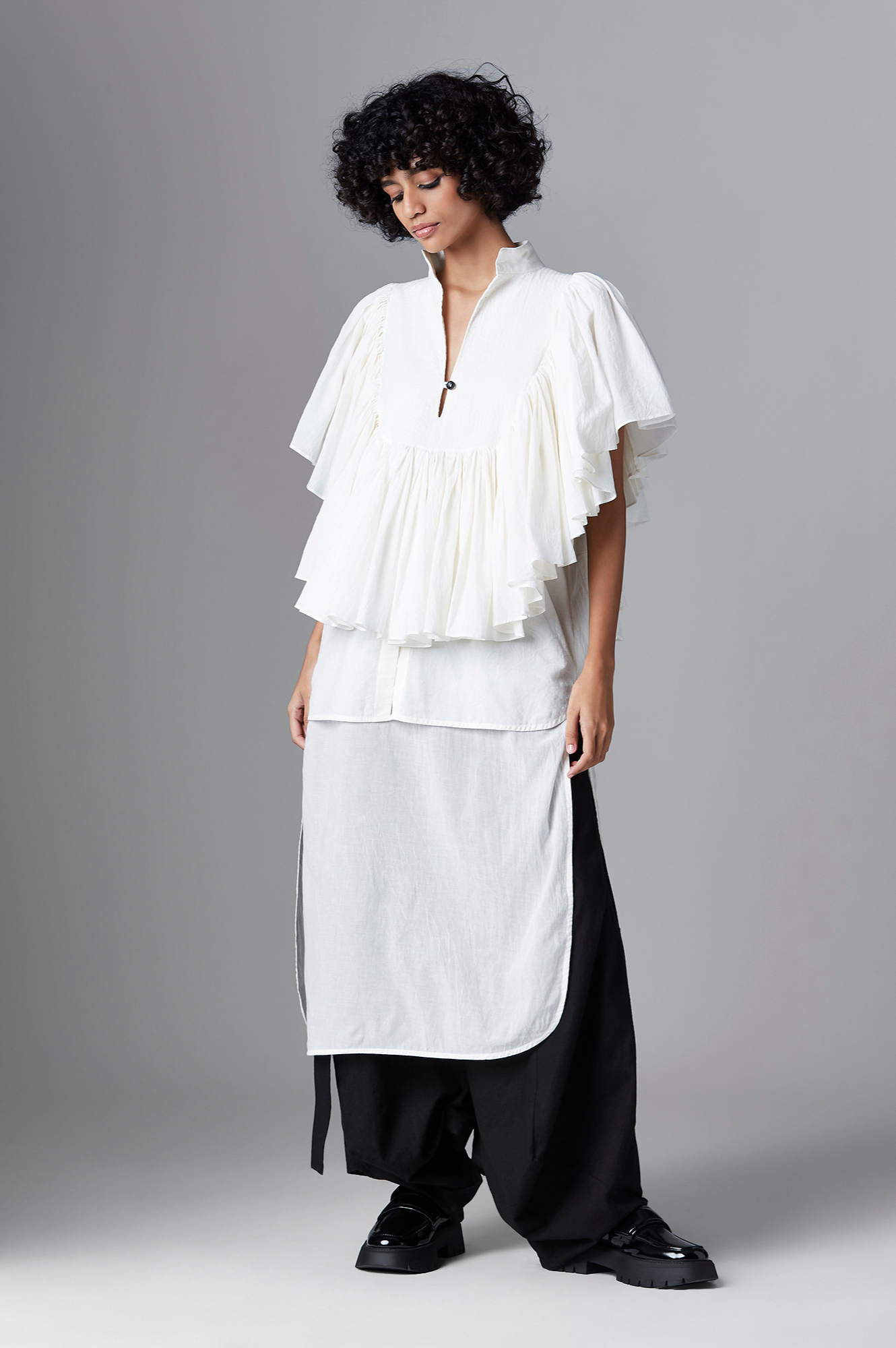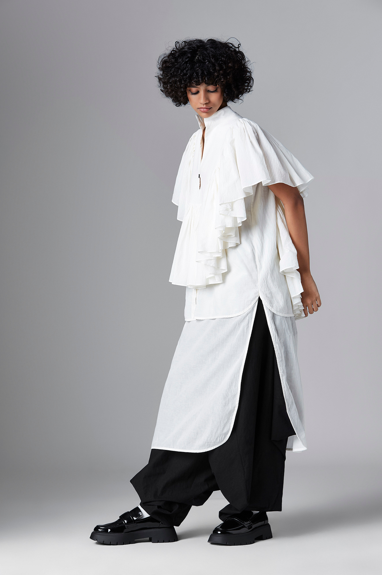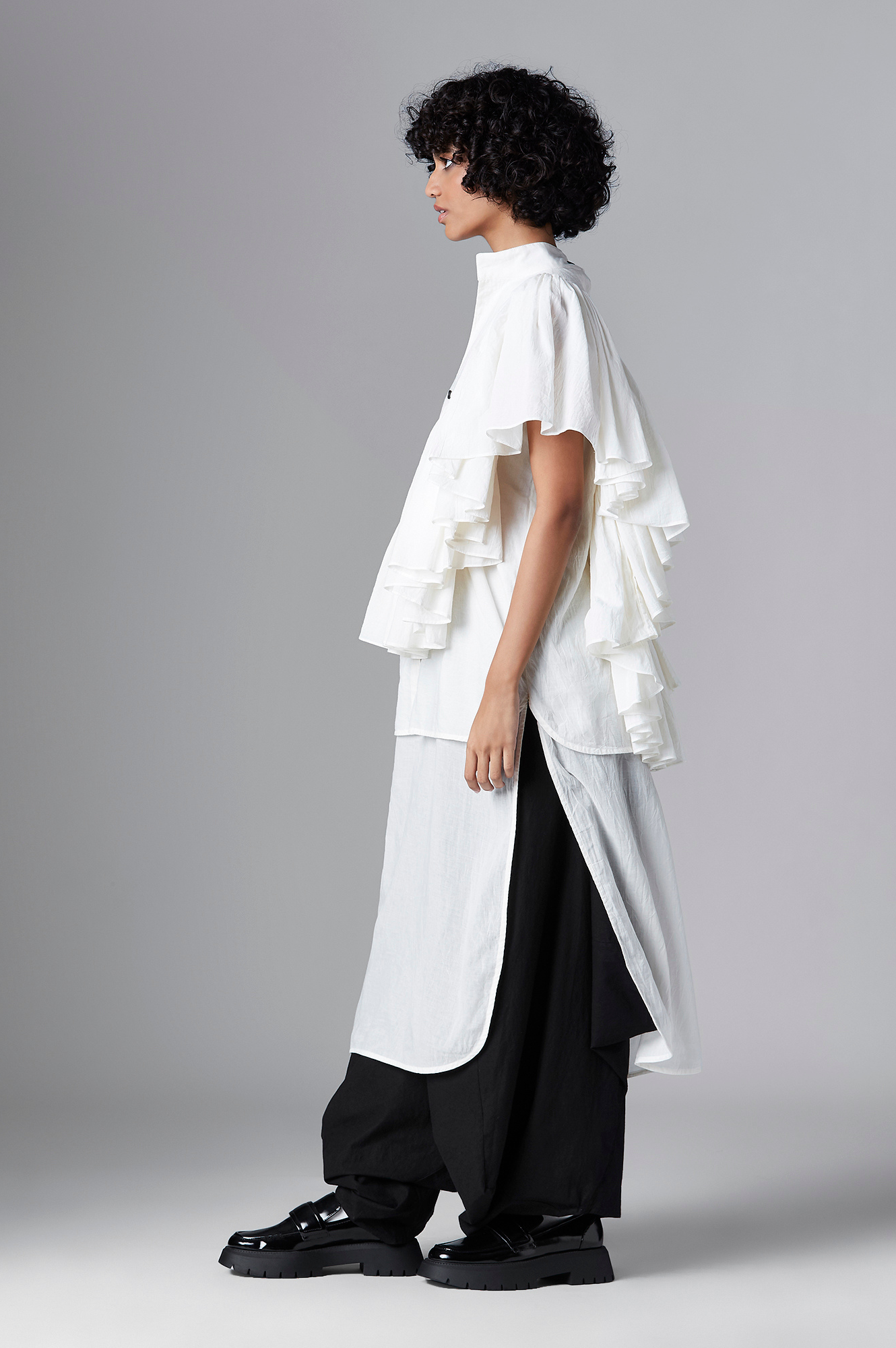 The Amaris shirt has a two-layer style and features a two-piece stand collar, loop and button closure on the front and a half button-down placket at the back. Additionally, it has frills at the front and back yoke.