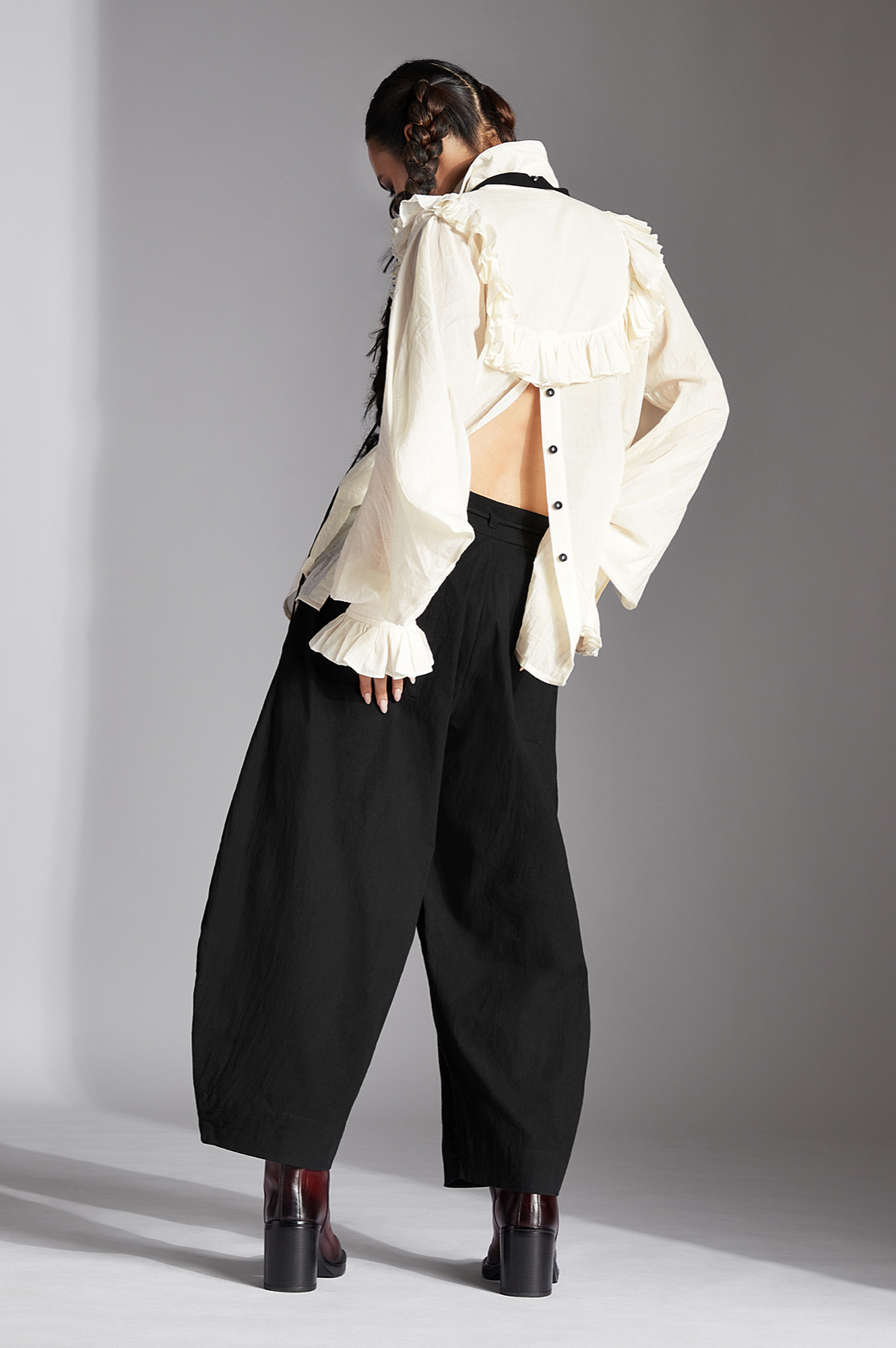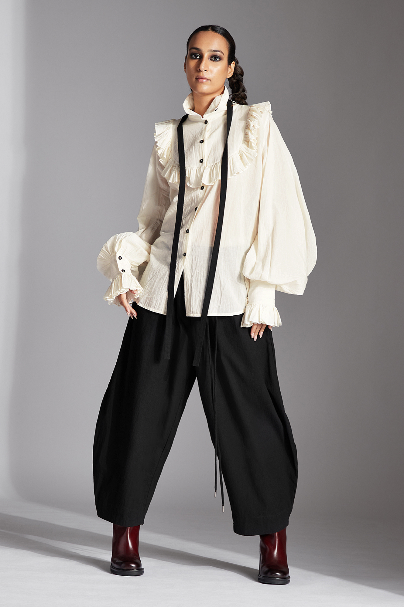 The Amri Shirt has a high collar with detachable black tie, bishop sleeves, ruffles on the front and back yoke and front button down placket. Additionally, it features a half button down placket at the back.