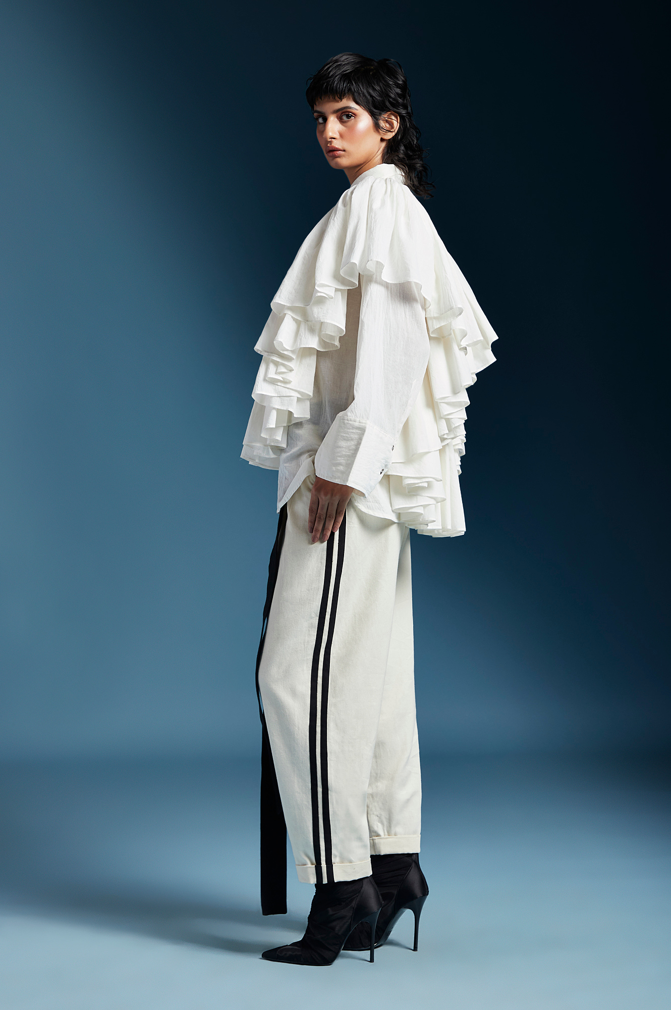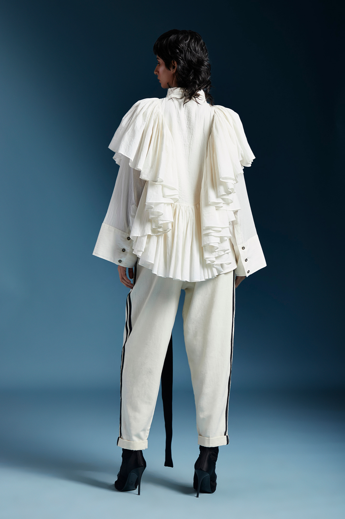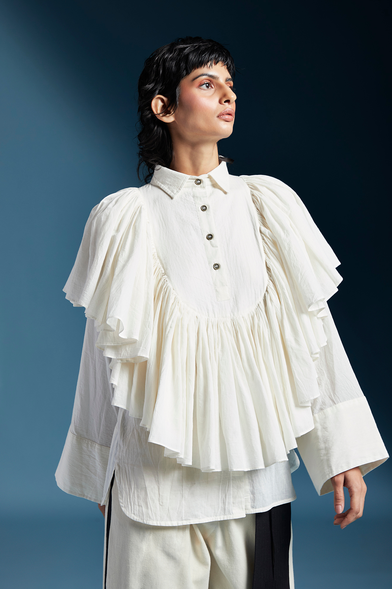 Ana is a high-low shirt with shirt collar, frills at the front and back yoke, A-line sleeves and button placket on the front.