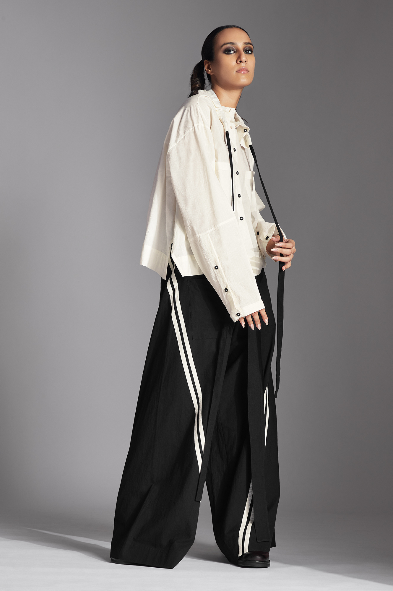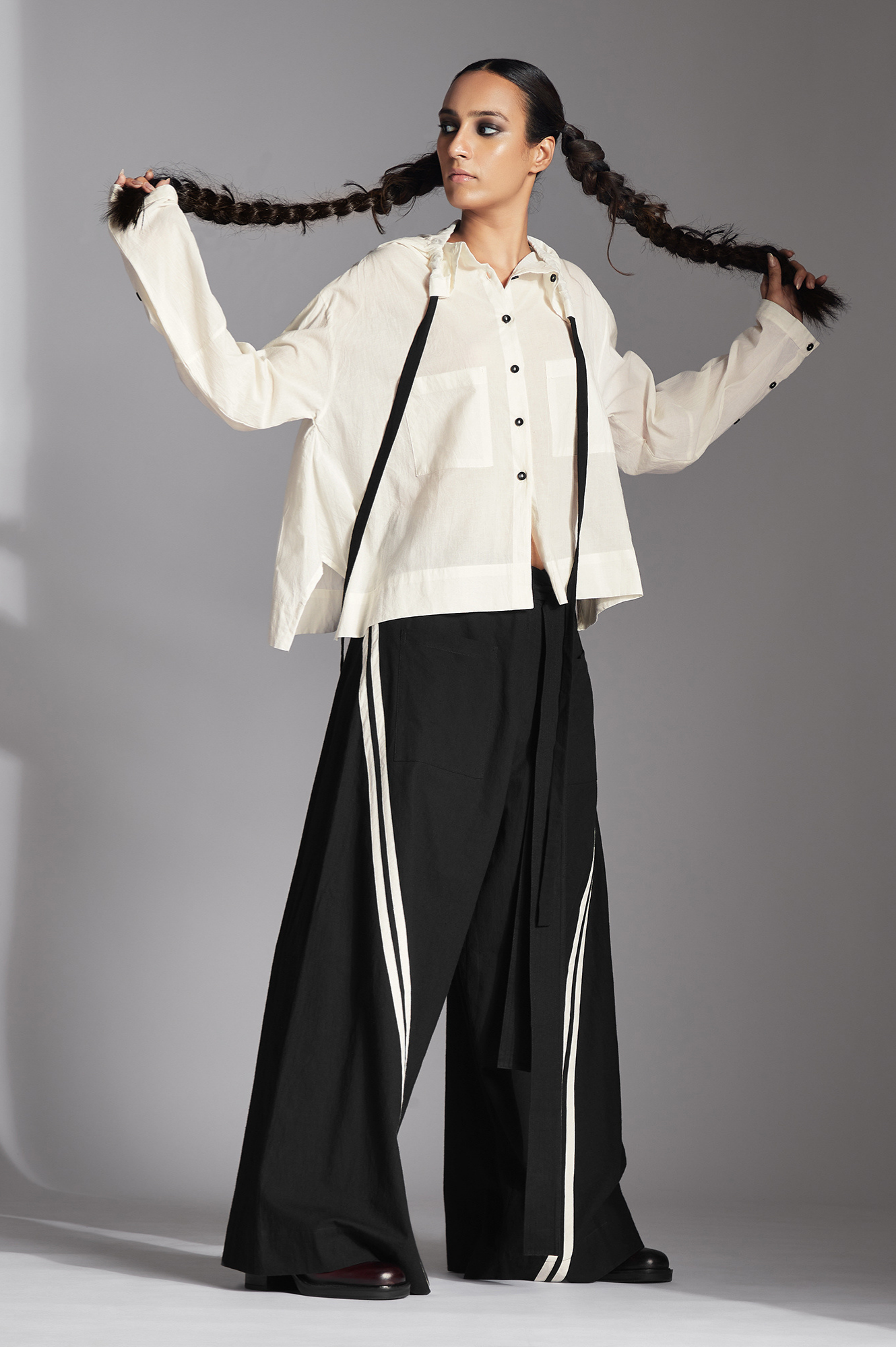 The Arvo shirt exhibits a crop barrel shape with extended adjustable high collar, patch pockets, lantern shaped full sleeves and side slits for ease.