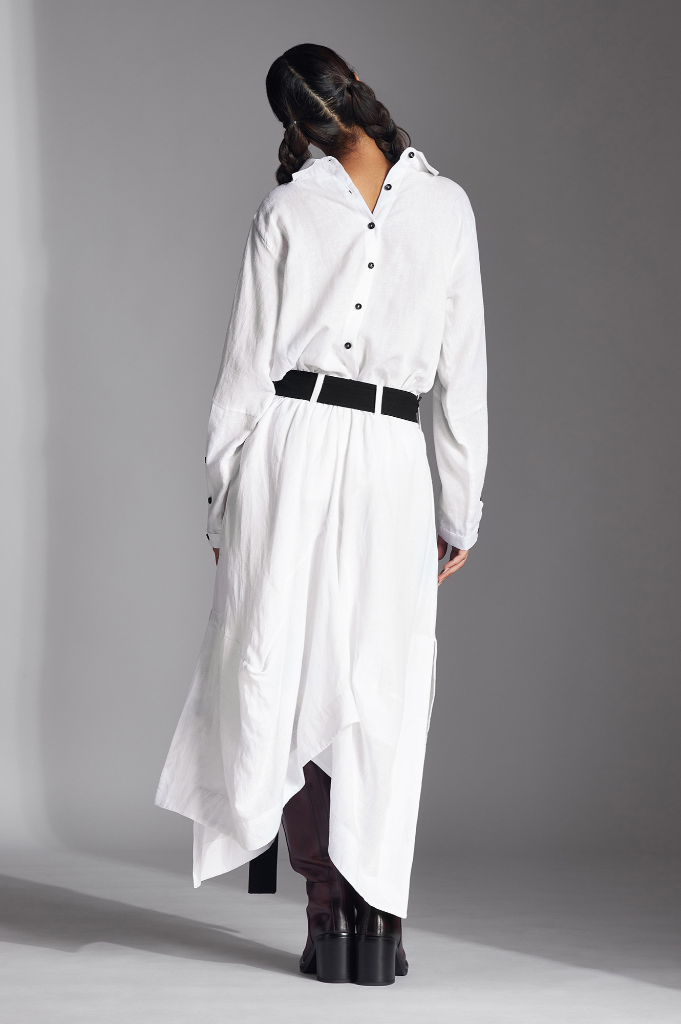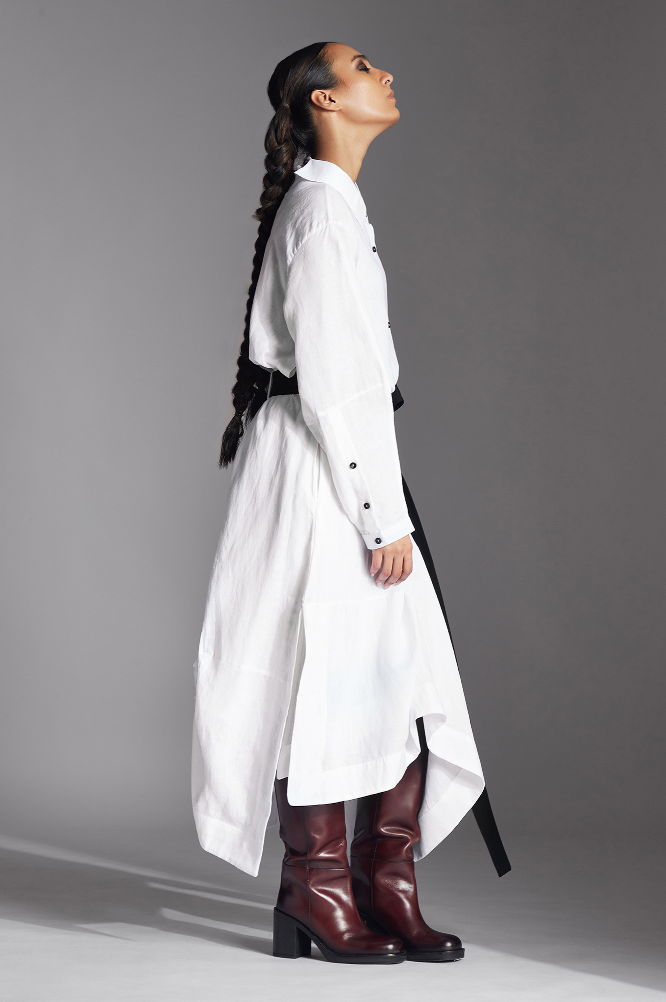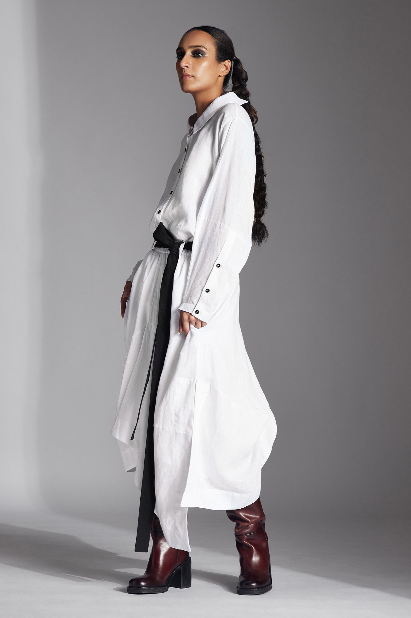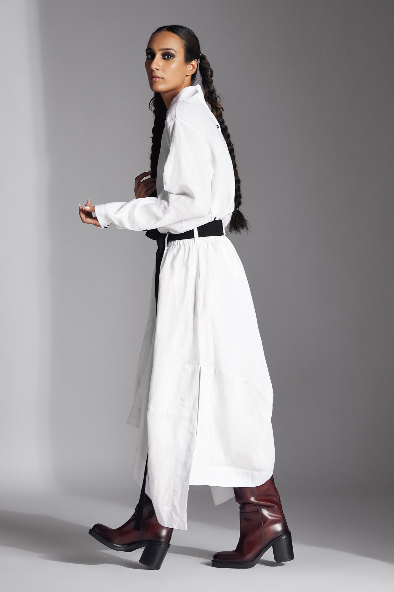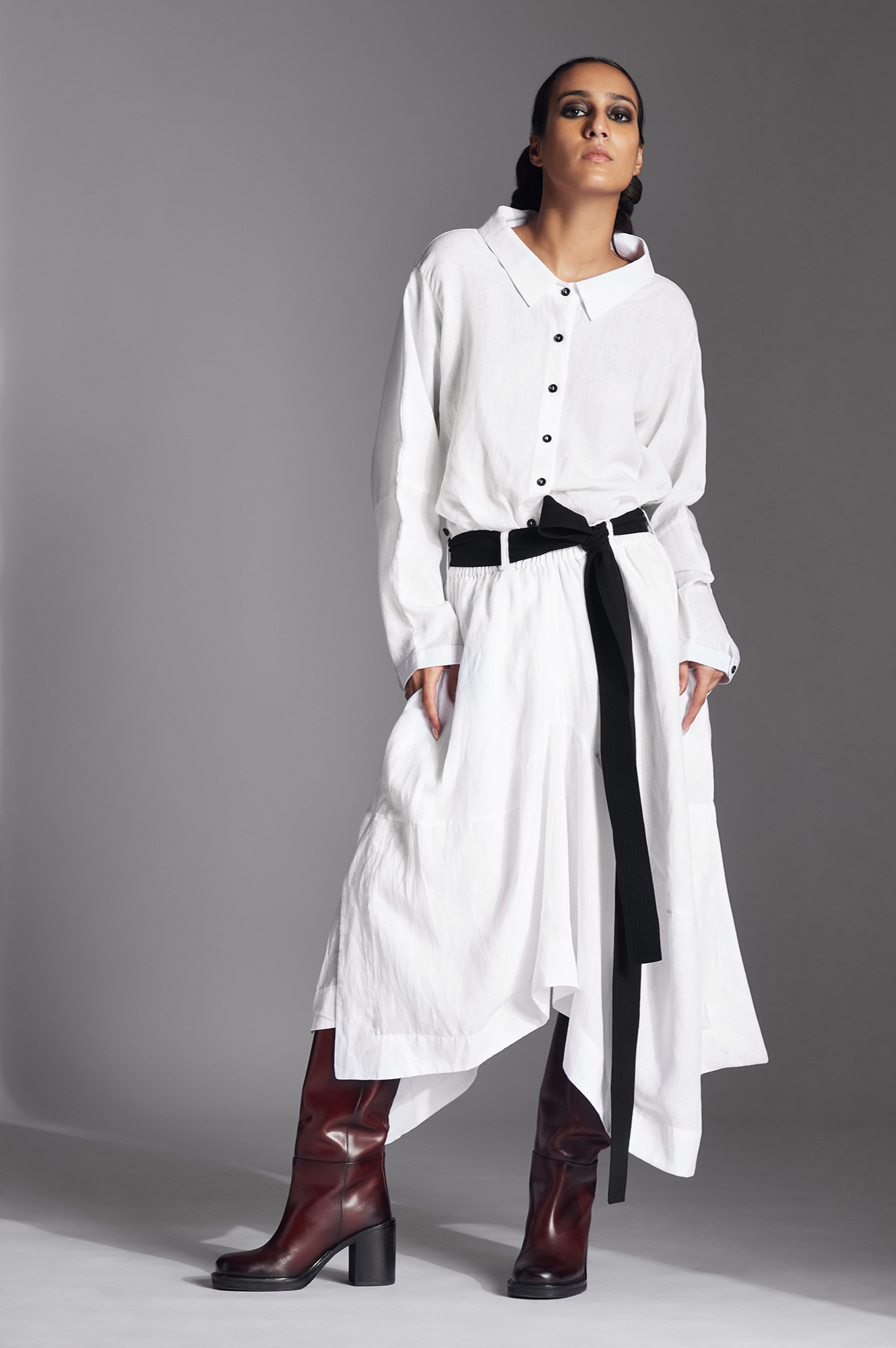 Aspen is an asymmetric dhoti skirt that features an elasticated waistband, in-seam pockets, loops and a self belt.