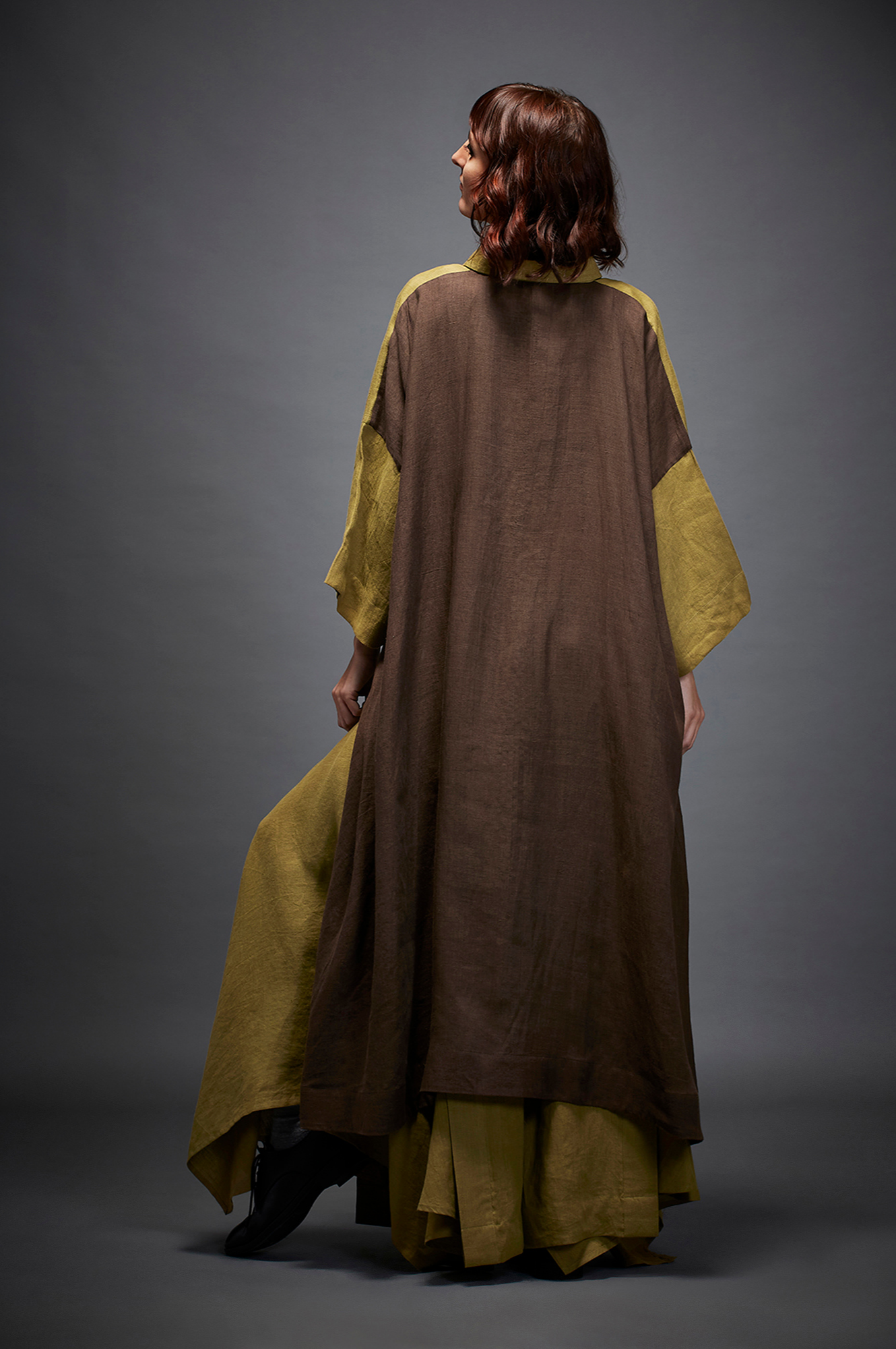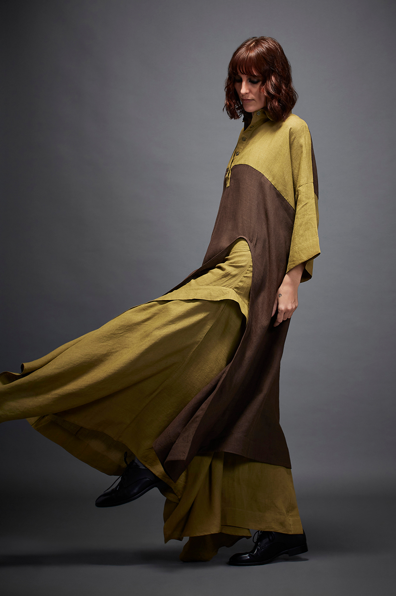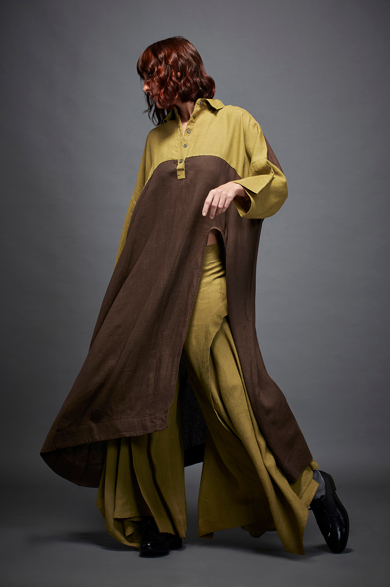 Avril features a shirt collar, half front button down placket, box sleeves and curved slit at the front.