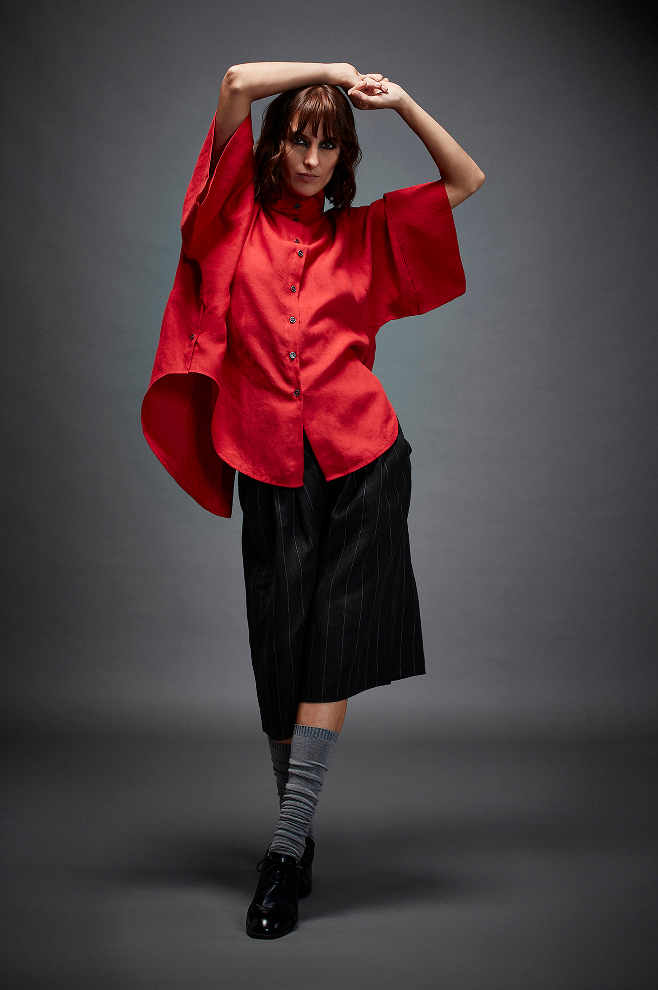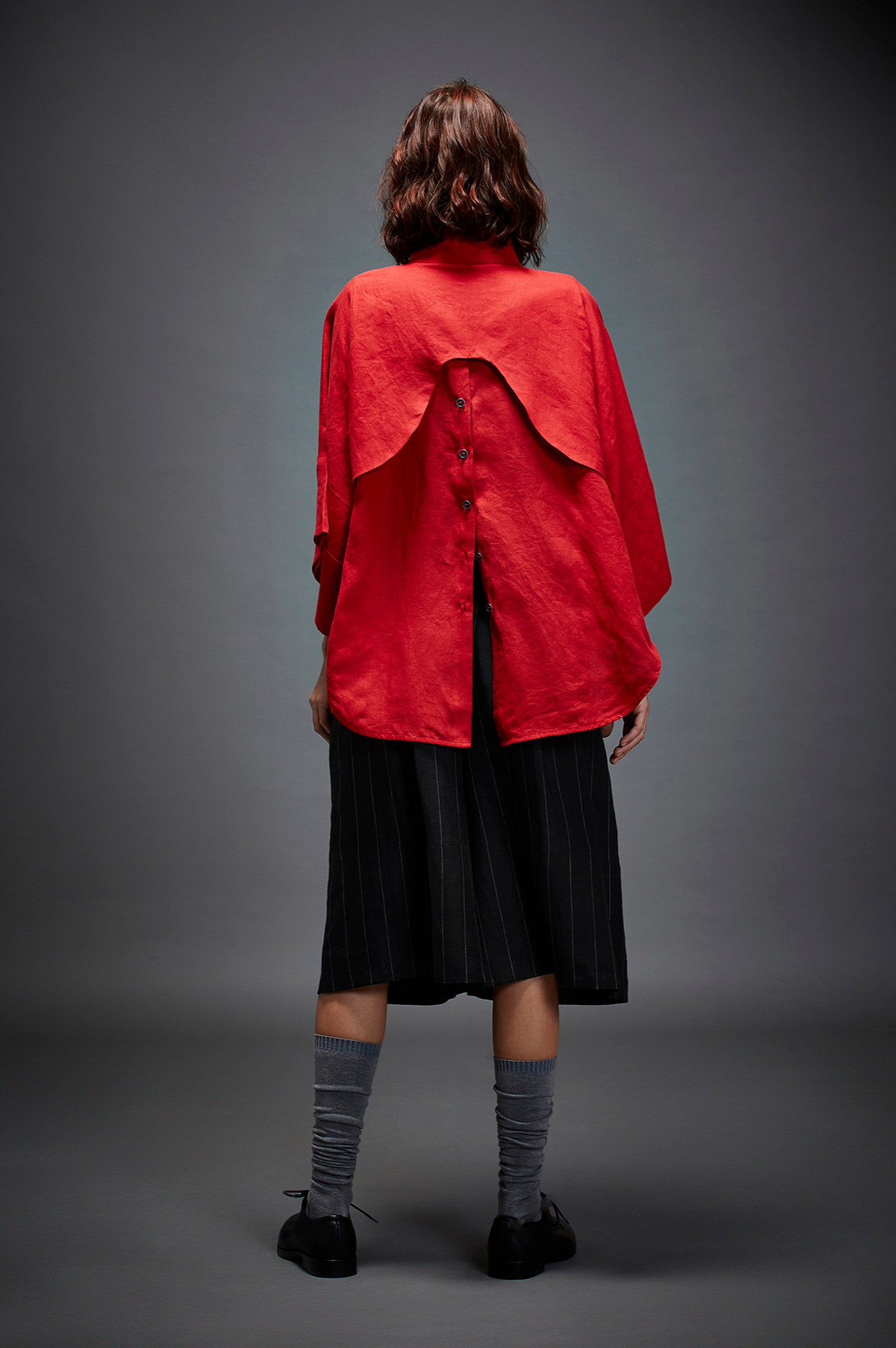 Camille features a high collar, exaggerated box sleeves with piping, curved back flap and back button down placket.