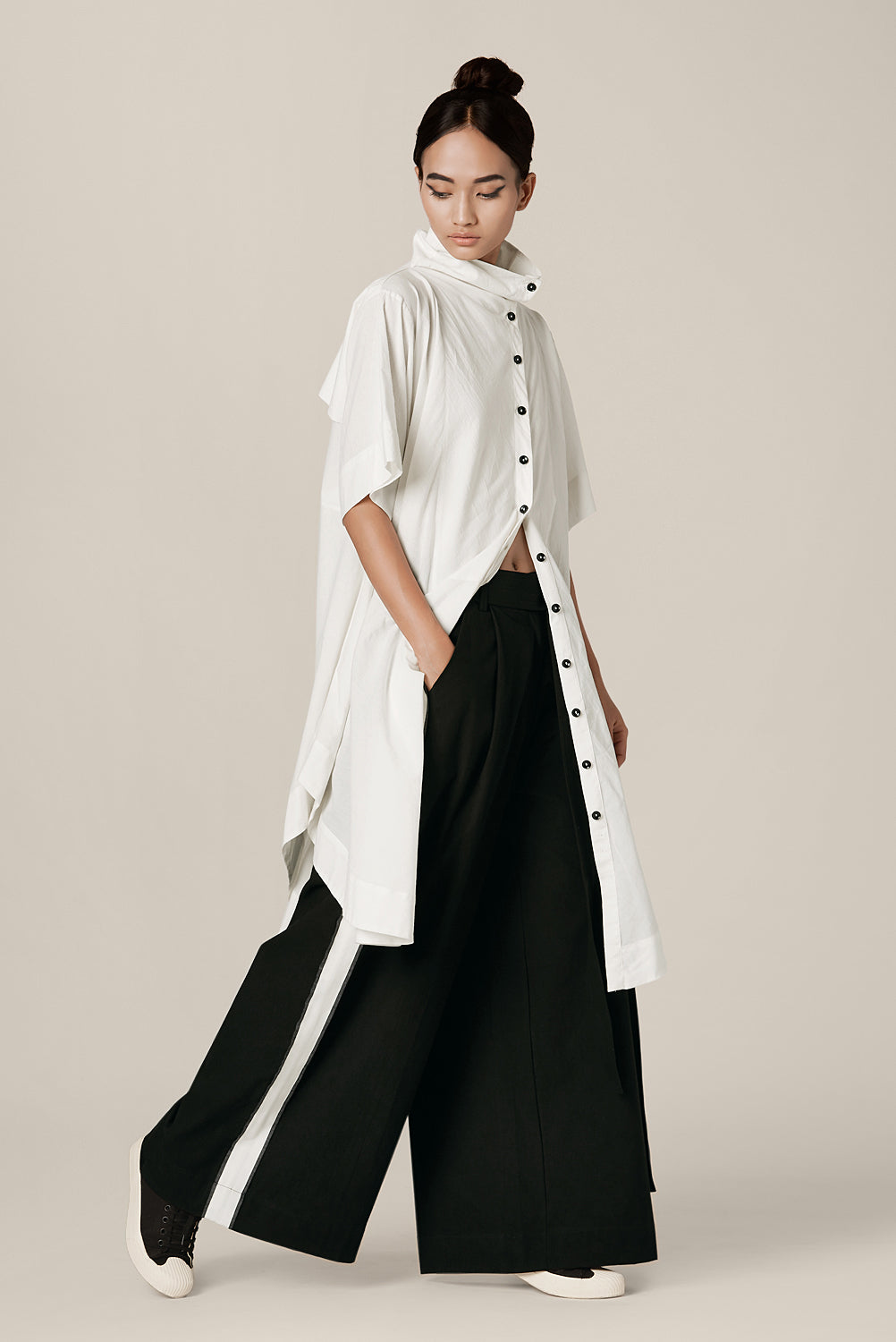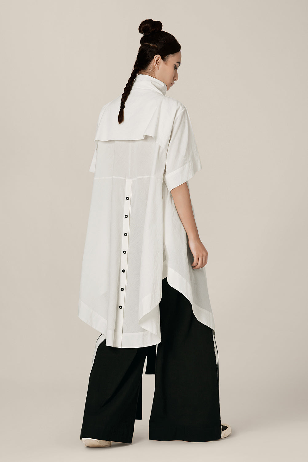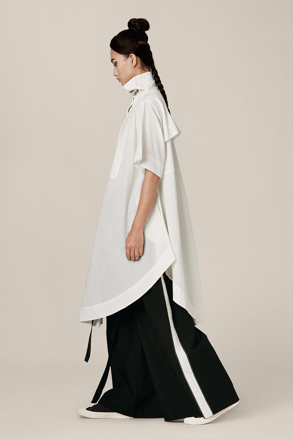 Courtney is a circular shirt dress that has an uneven high collar, box sleeves and a half button down placket at the back.