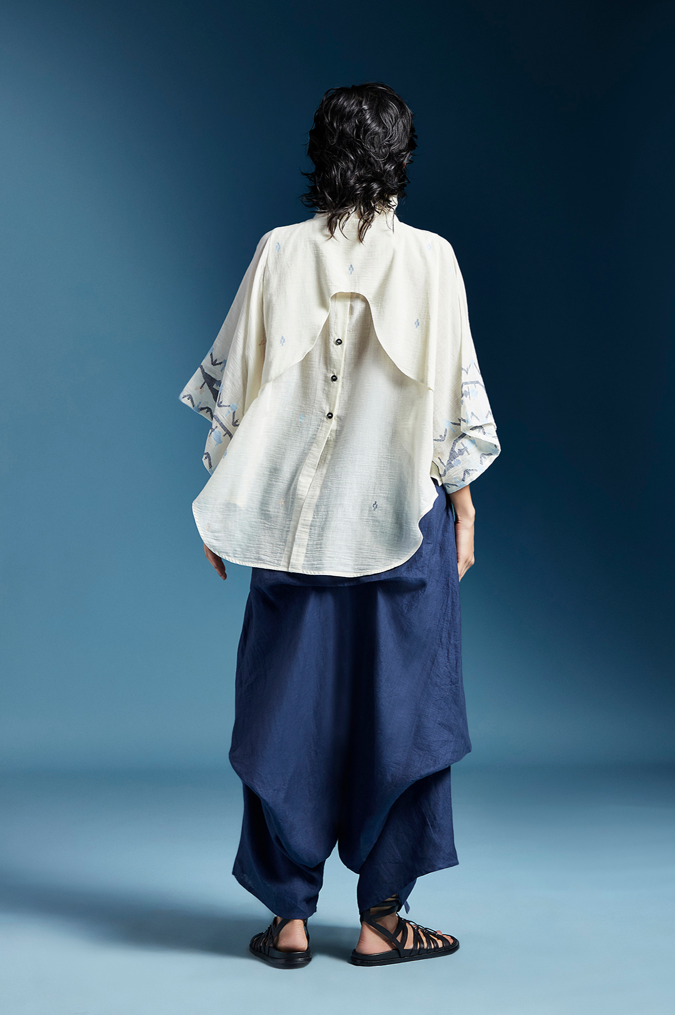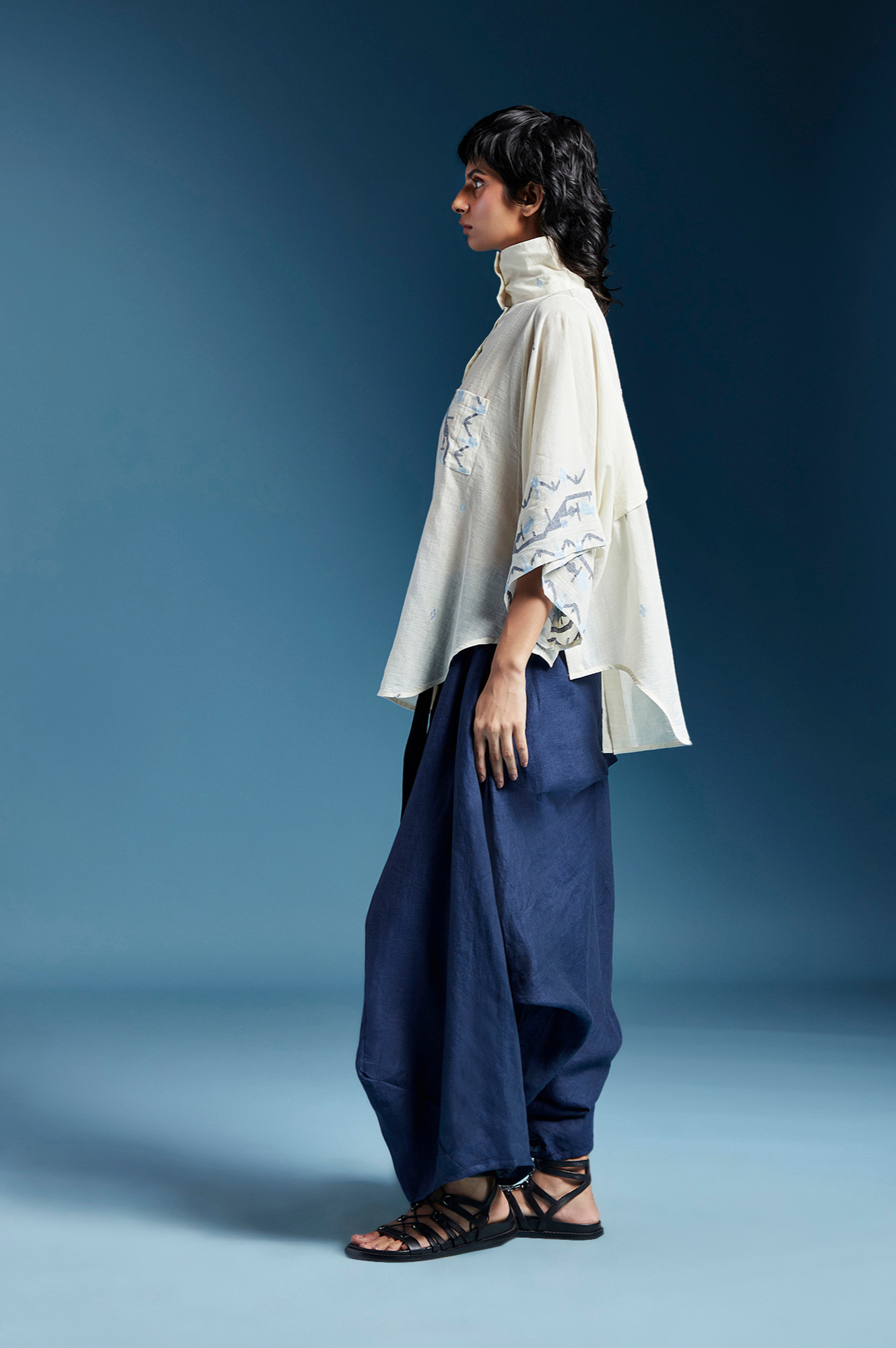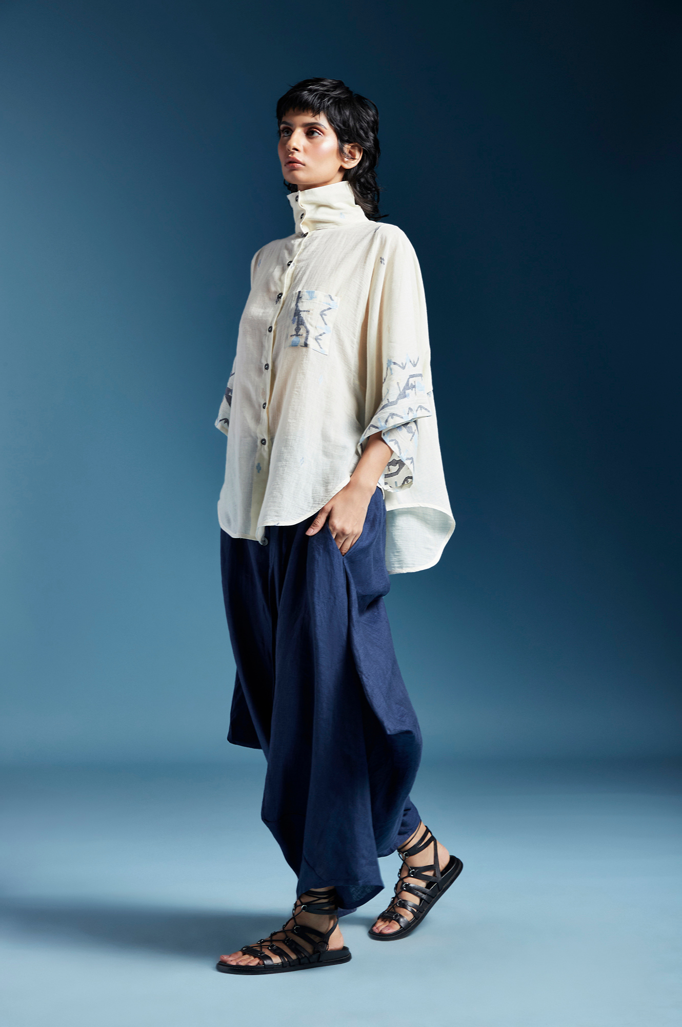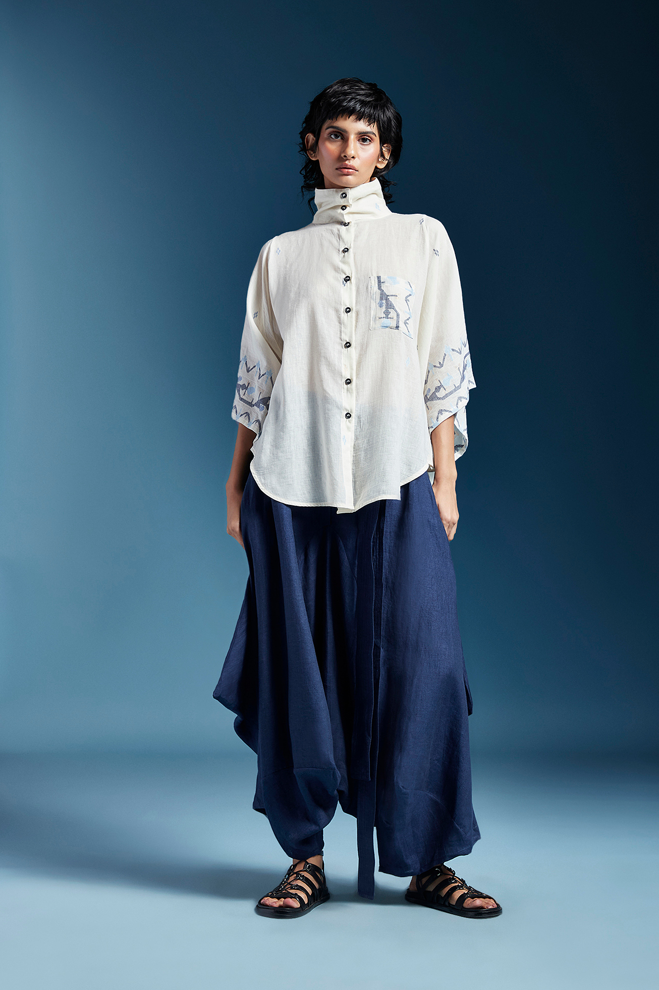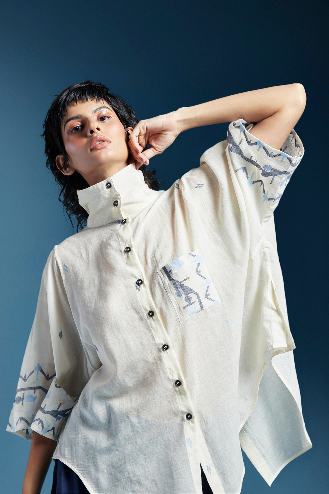 Dela is an oversized shirt which features a high collar, exaggerated box sleeves, curved back flap and buttons on the front and back.