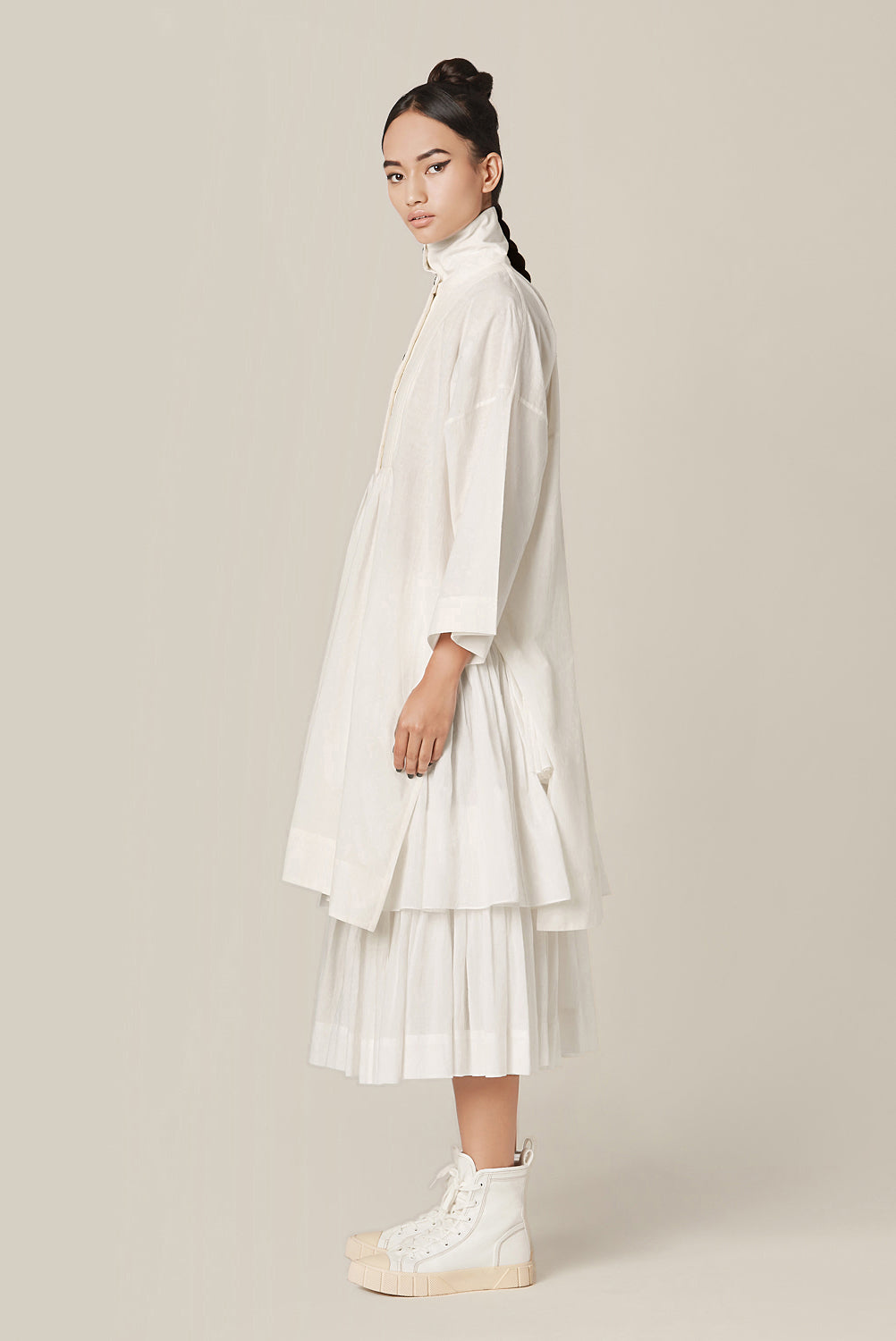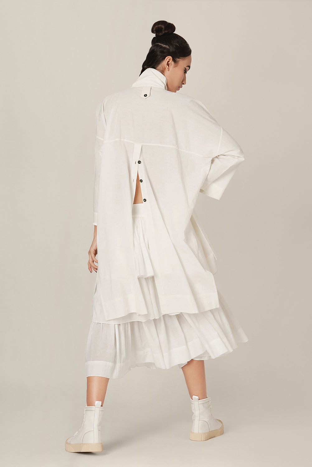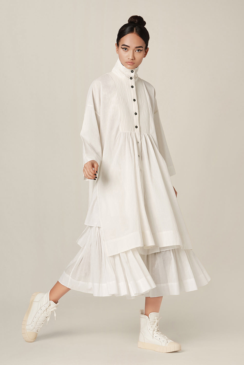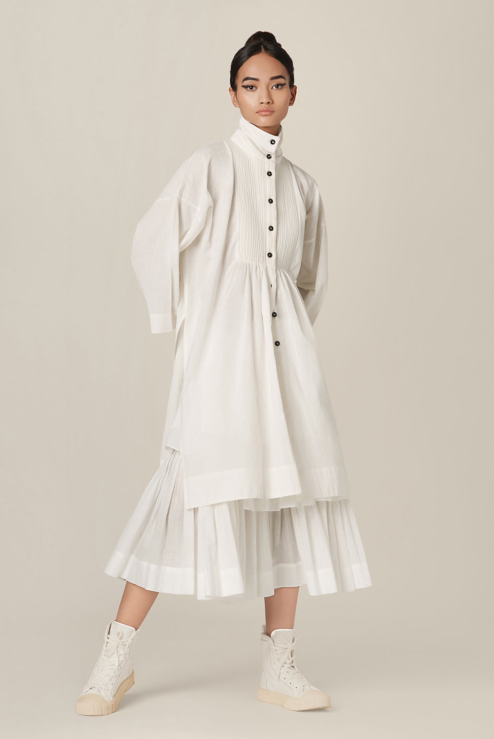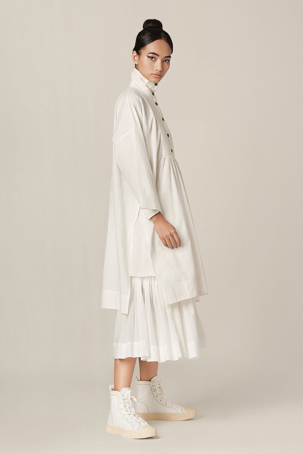 Delilah shirt features a quilted yoke, high collar, drop shoulder box sleeves and a button down placket at the front and back.