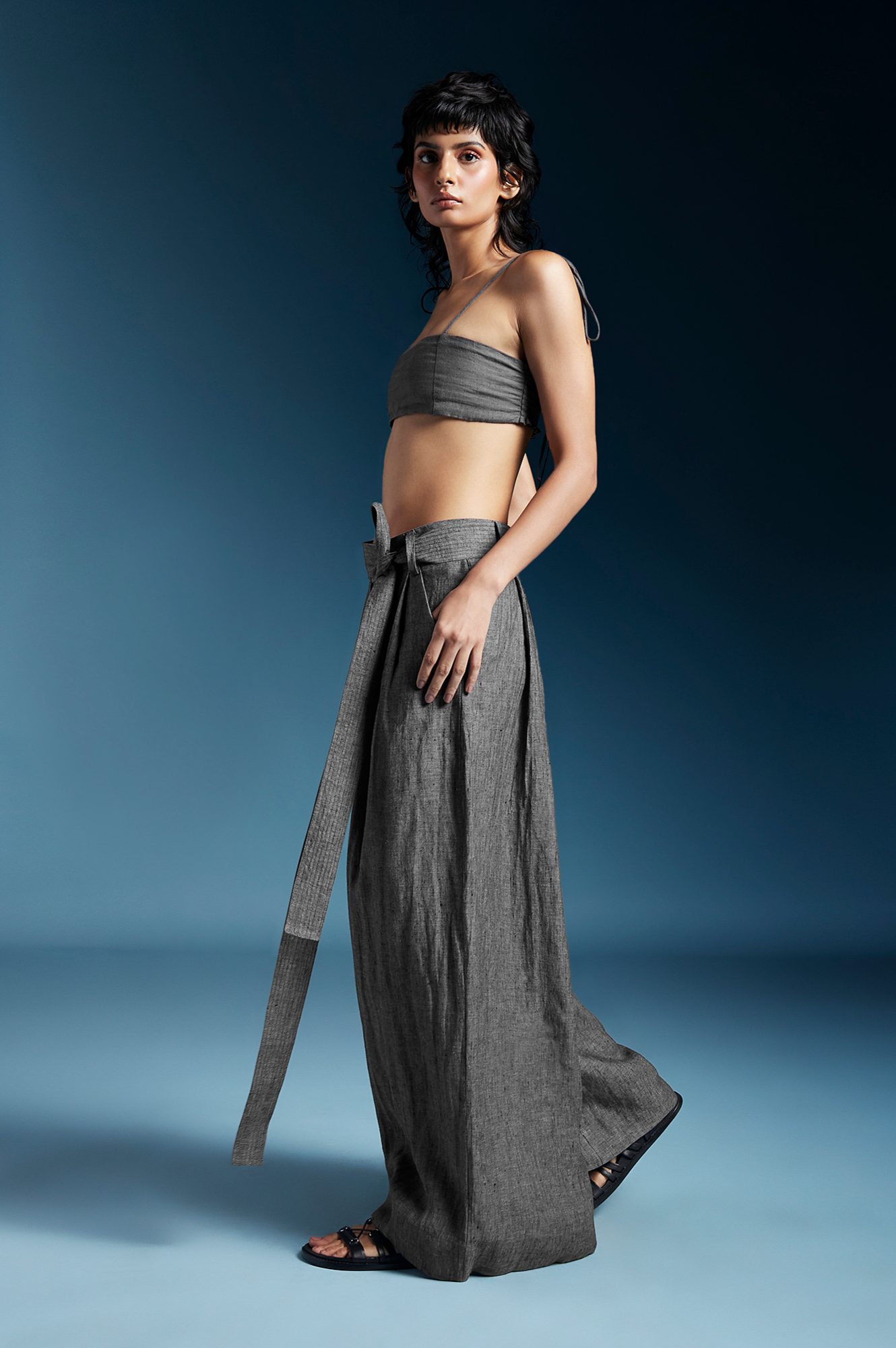 Skye is a pair of double pleated trousers with cross pockets and self belt.