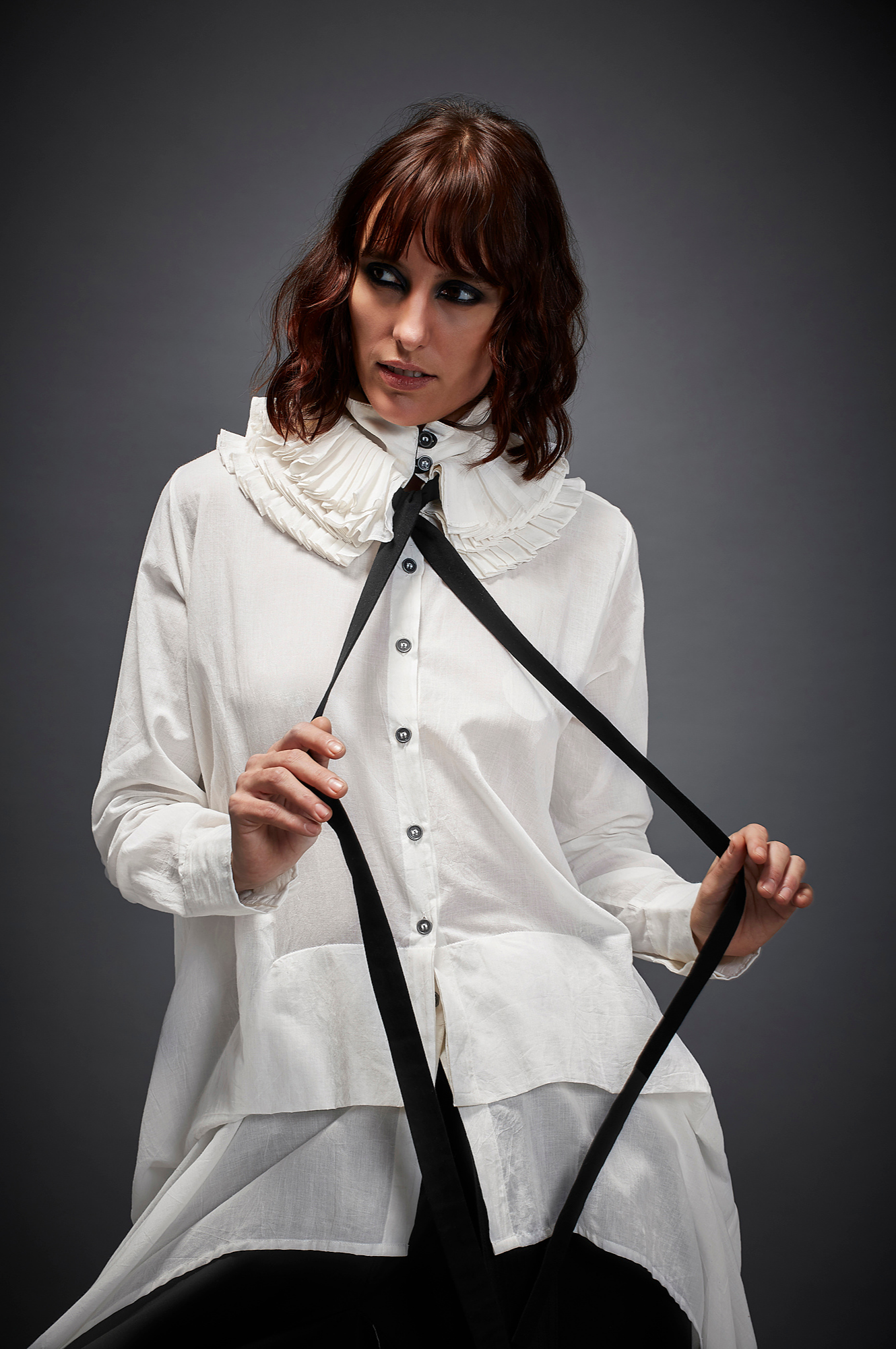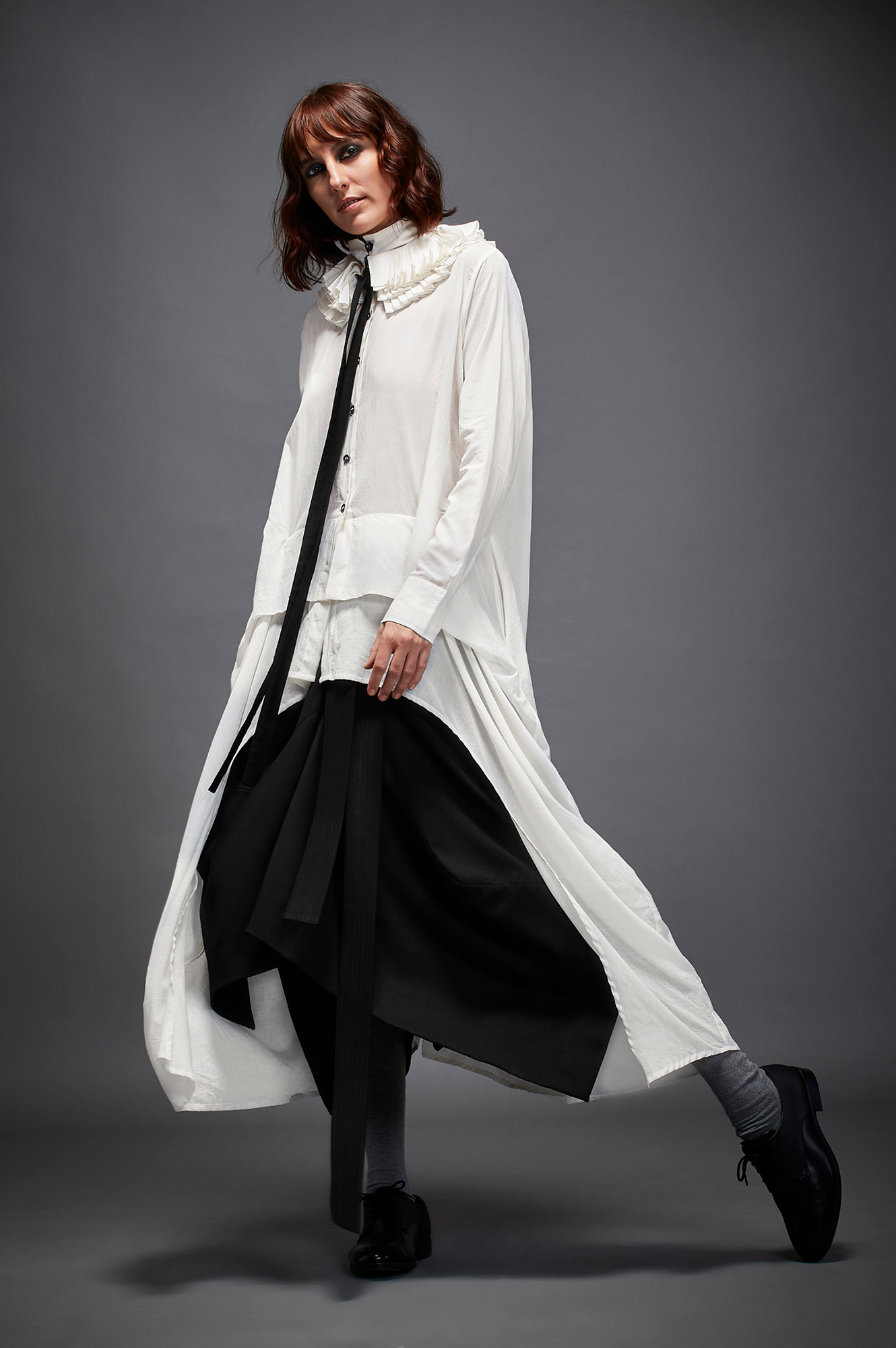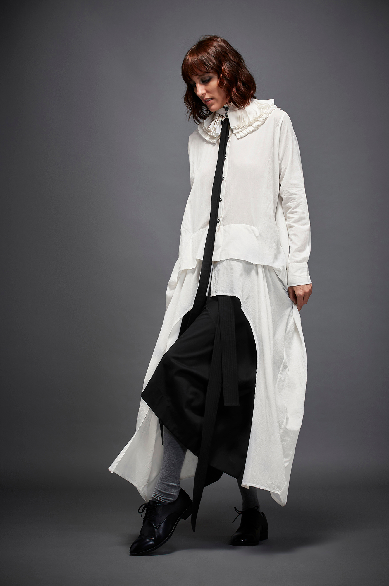Emma features a high-low style with an uneven front and back length, pleated collar, narrow full sleeves and a half uneven fold at the back along with a slit.