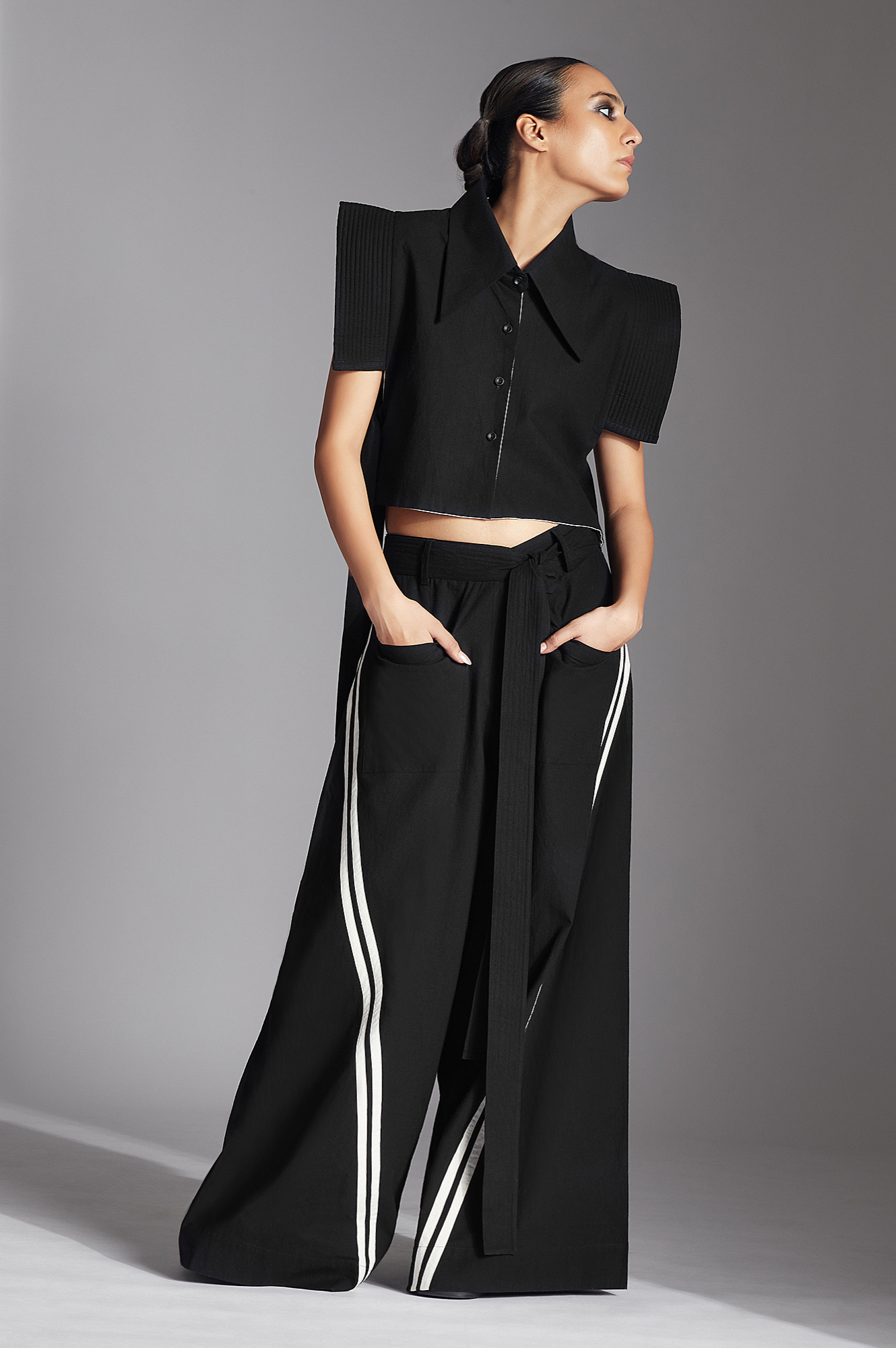 Emy is a short overlay which features a pointed collar, shoulder extensions with quilted details and side tie-ups.