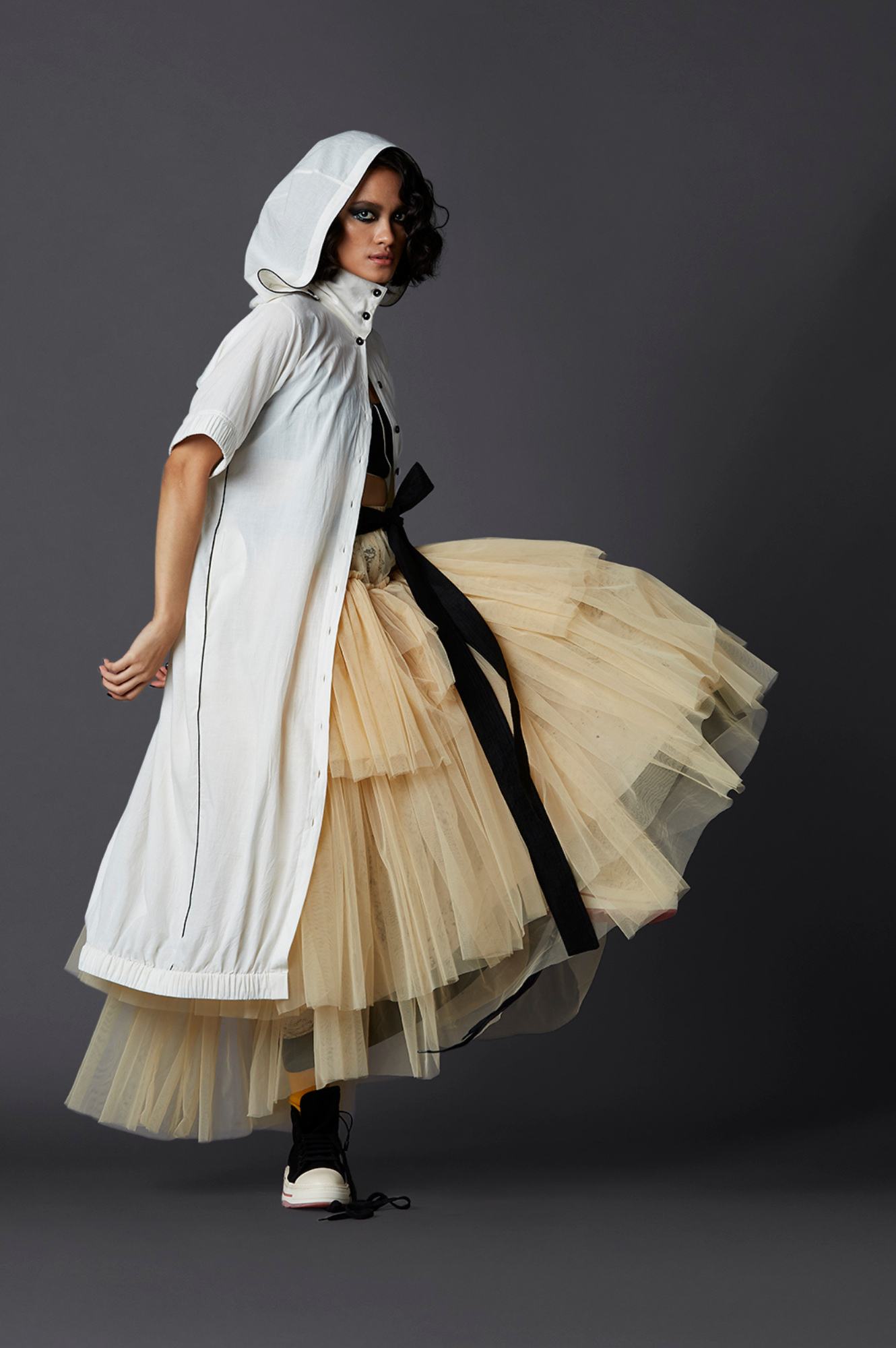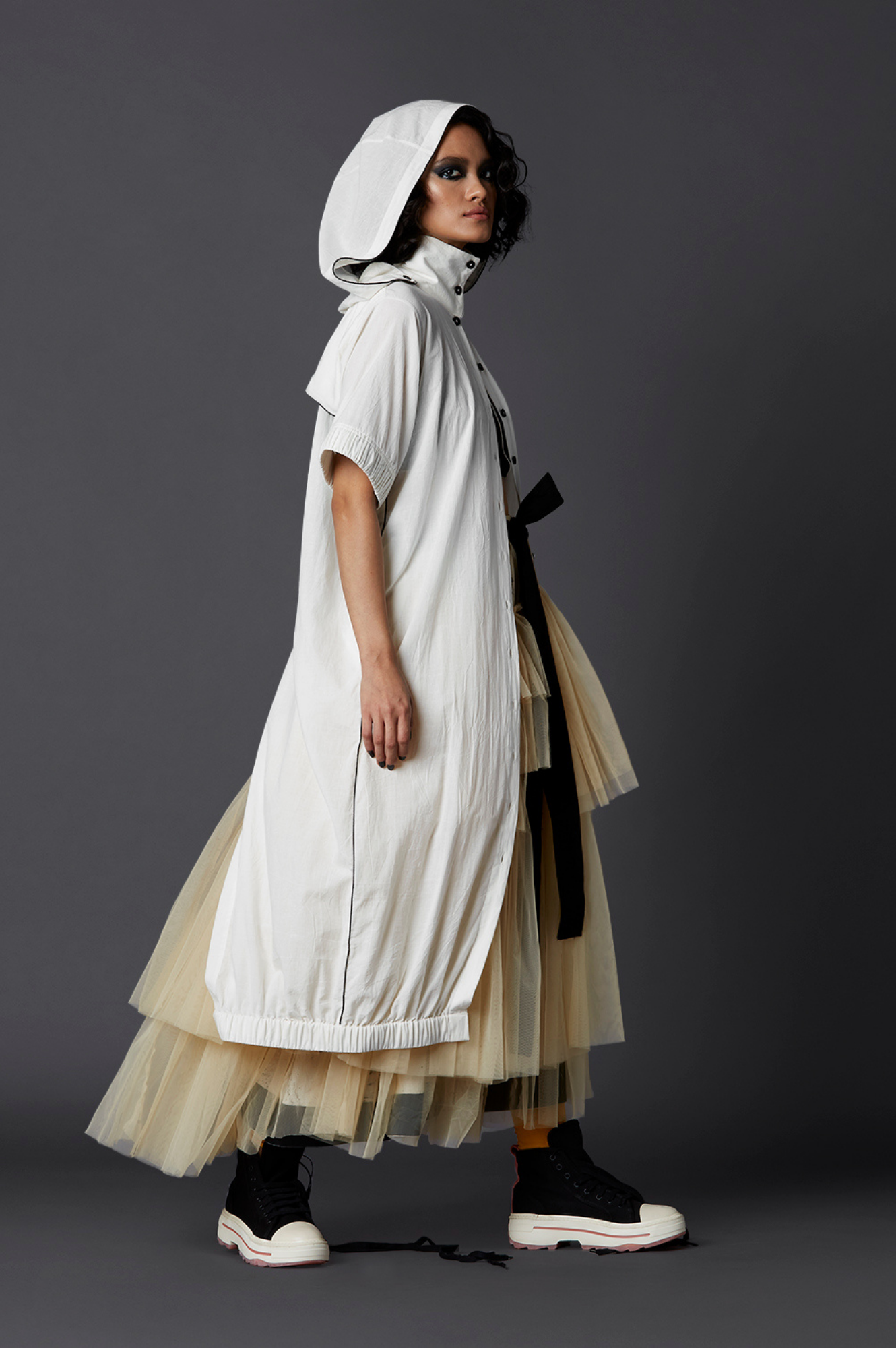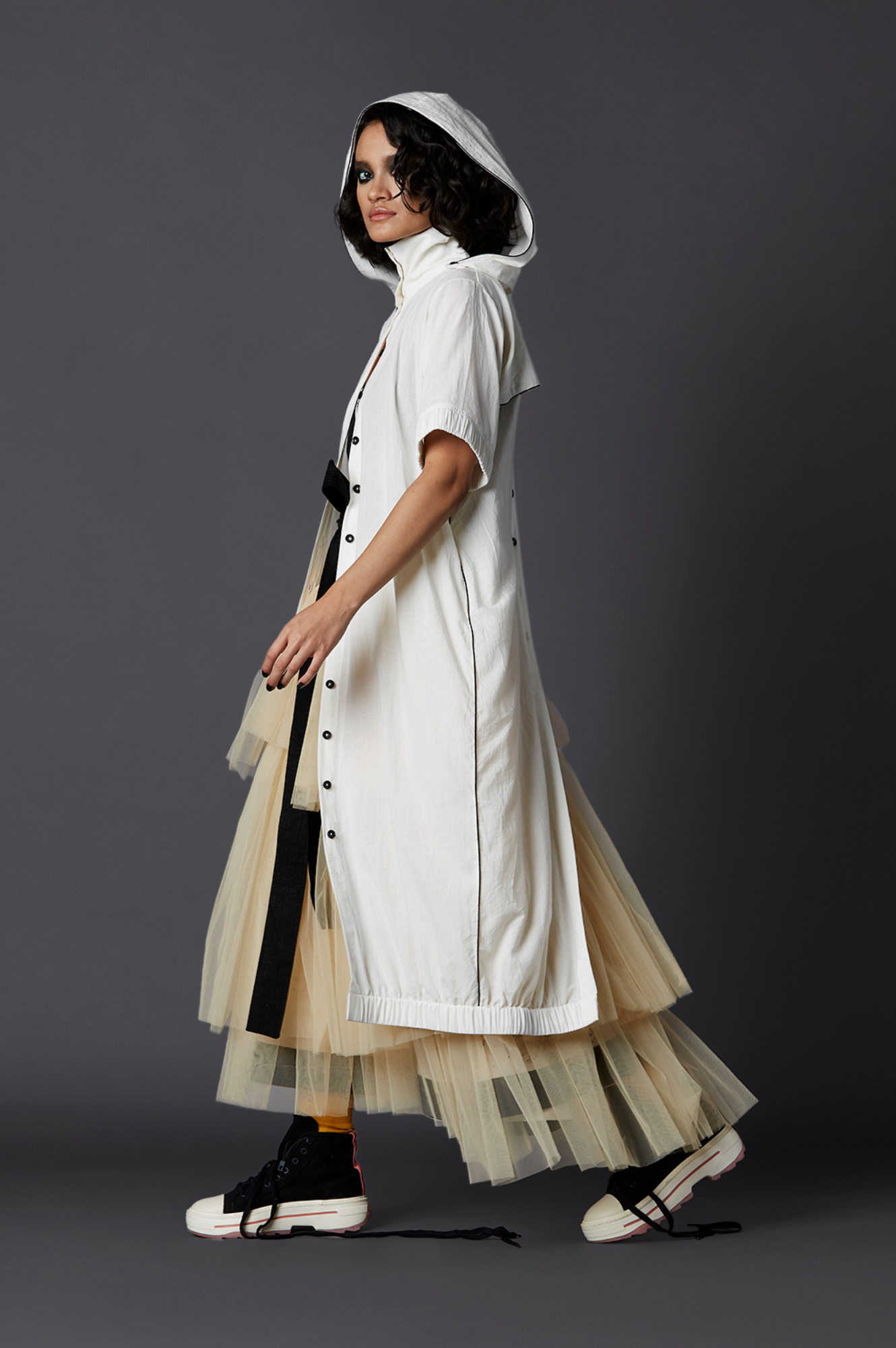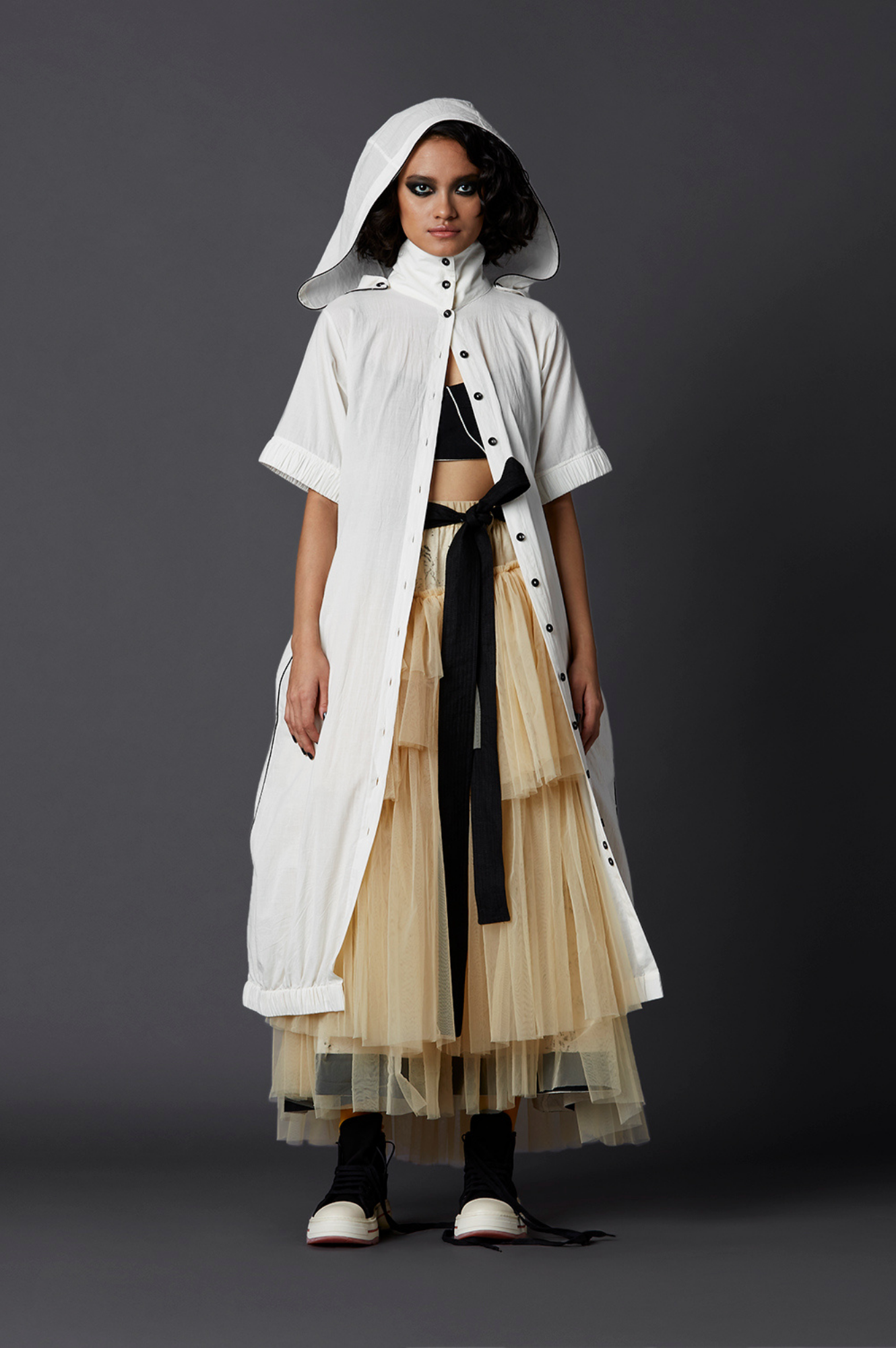 The Gladiator Shirt has a high collar, detachable hood and button down plackets on the front and back. Additional details include a back flap, elasticated hem and piping details.