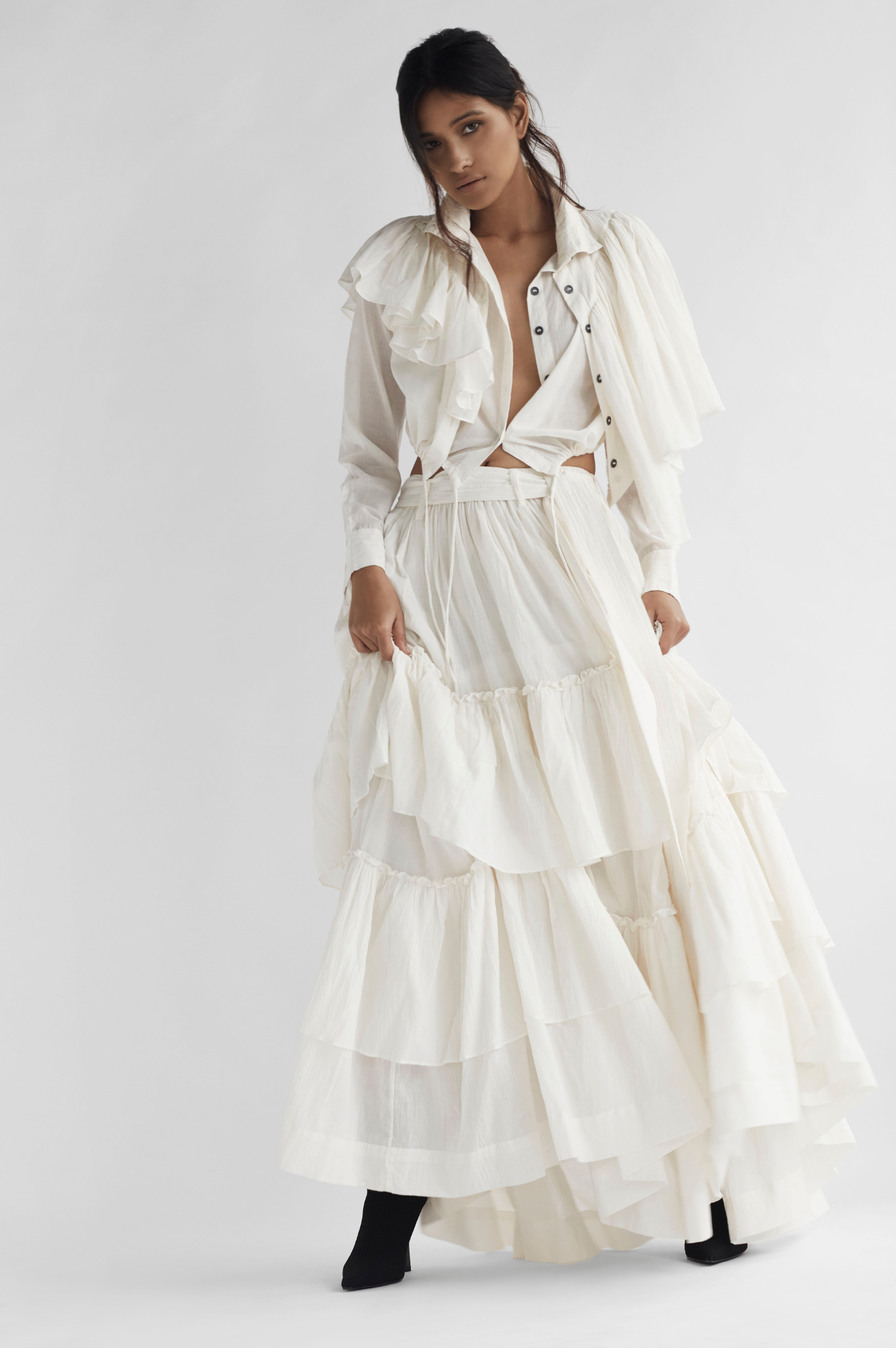Glory is a tiered frill skirt with an elasticated waistband, draped detail and a self colored belt.