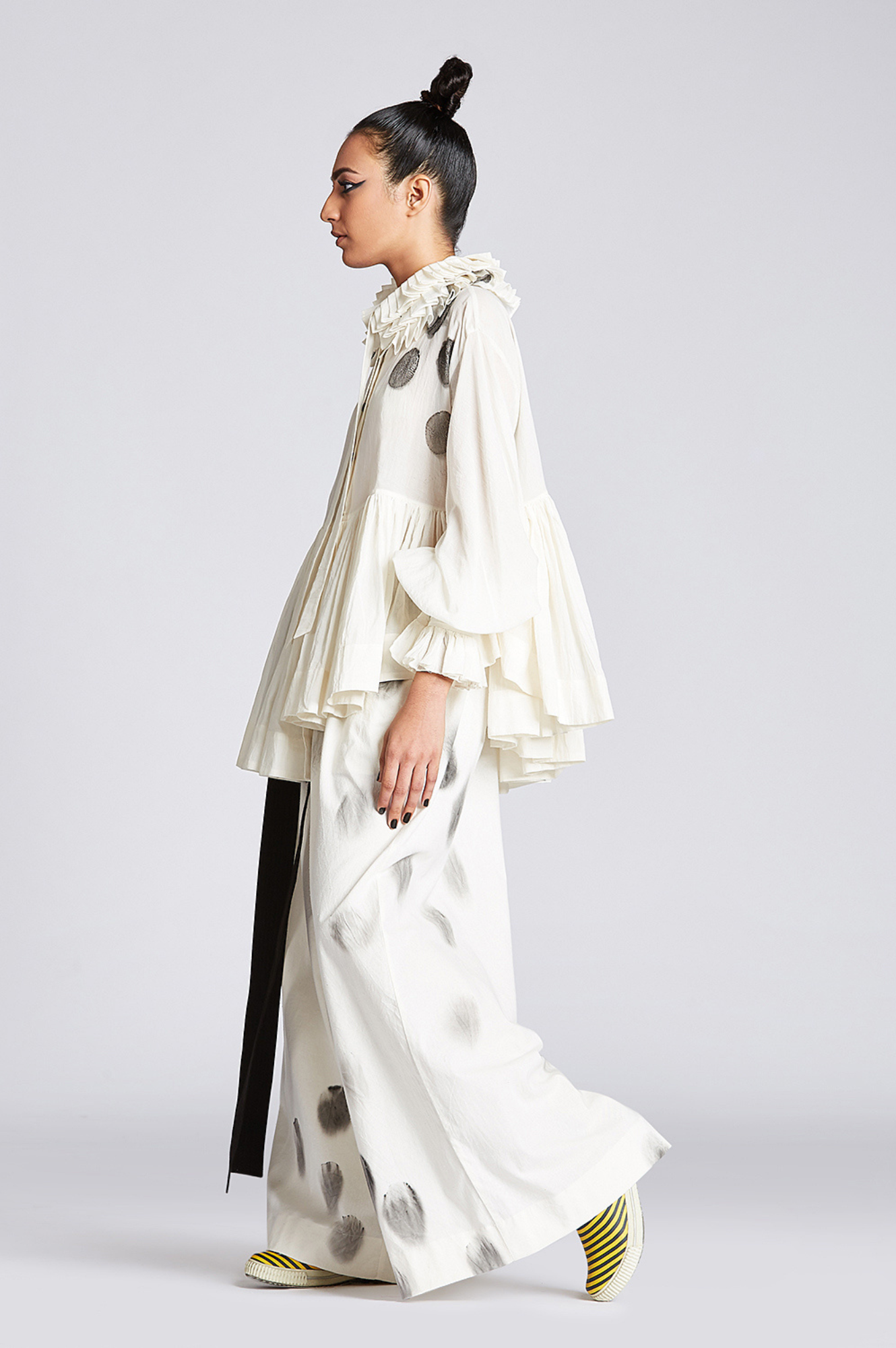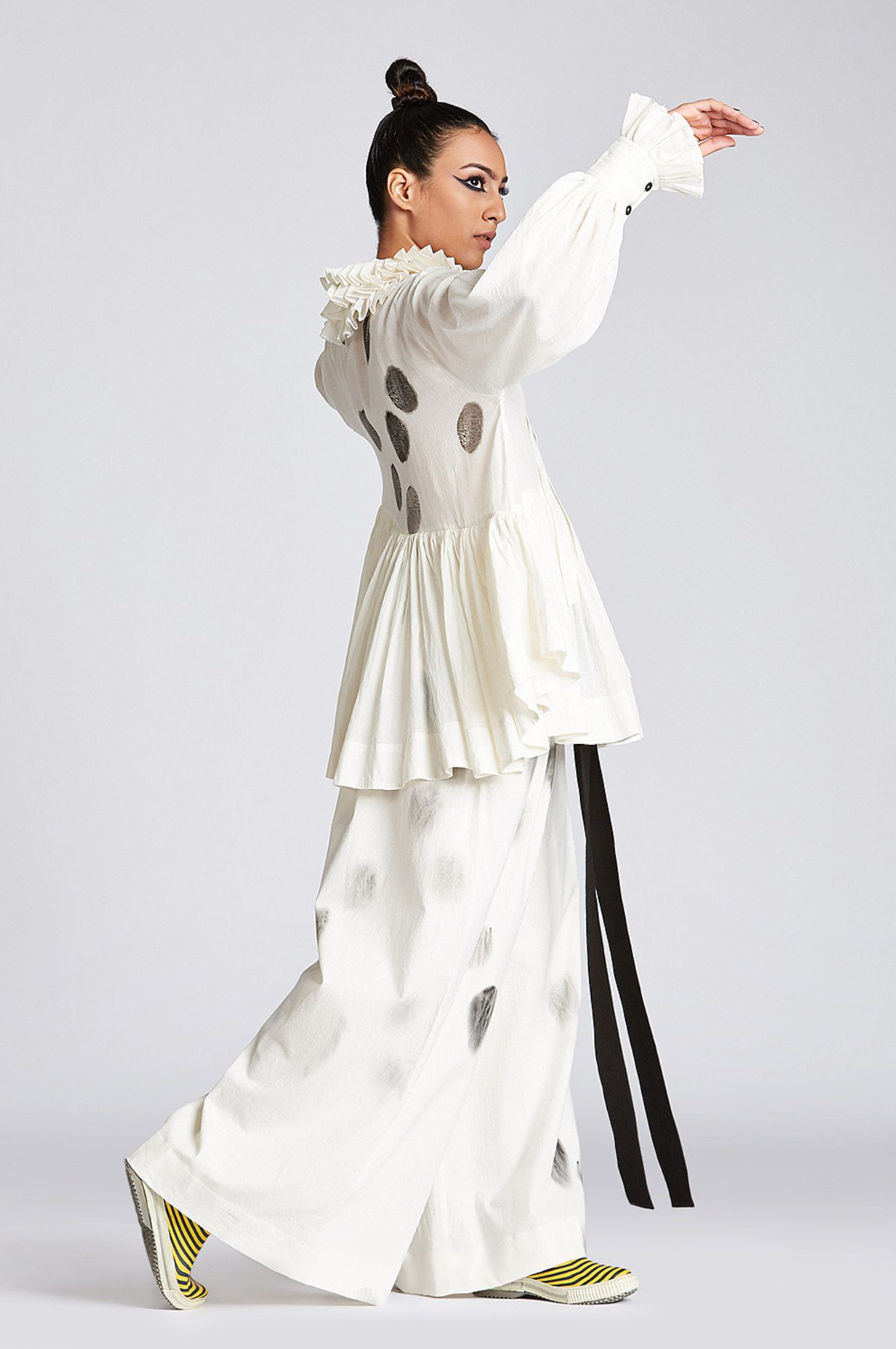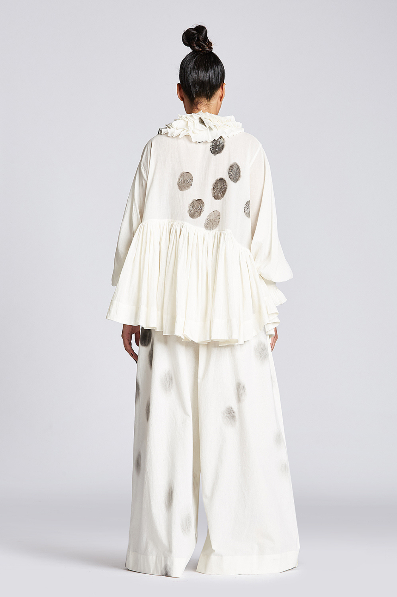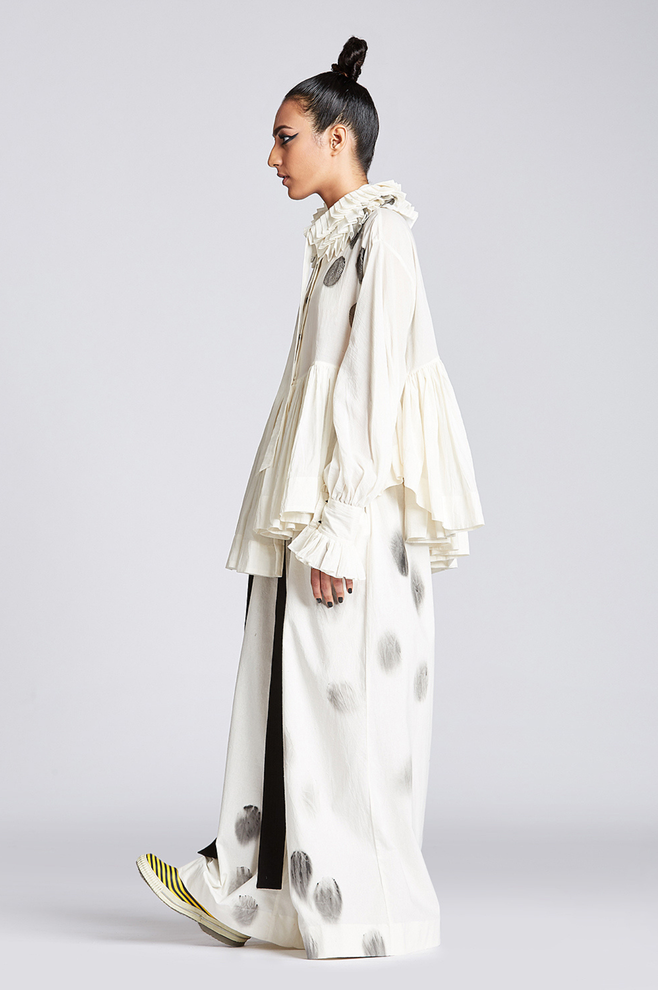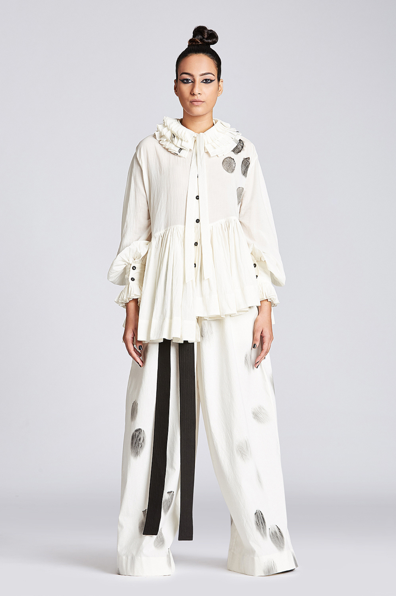 Irene is a hand painted shirt that features a detachable frill collar, bishop sleeves with frill cuff and front button down placket.