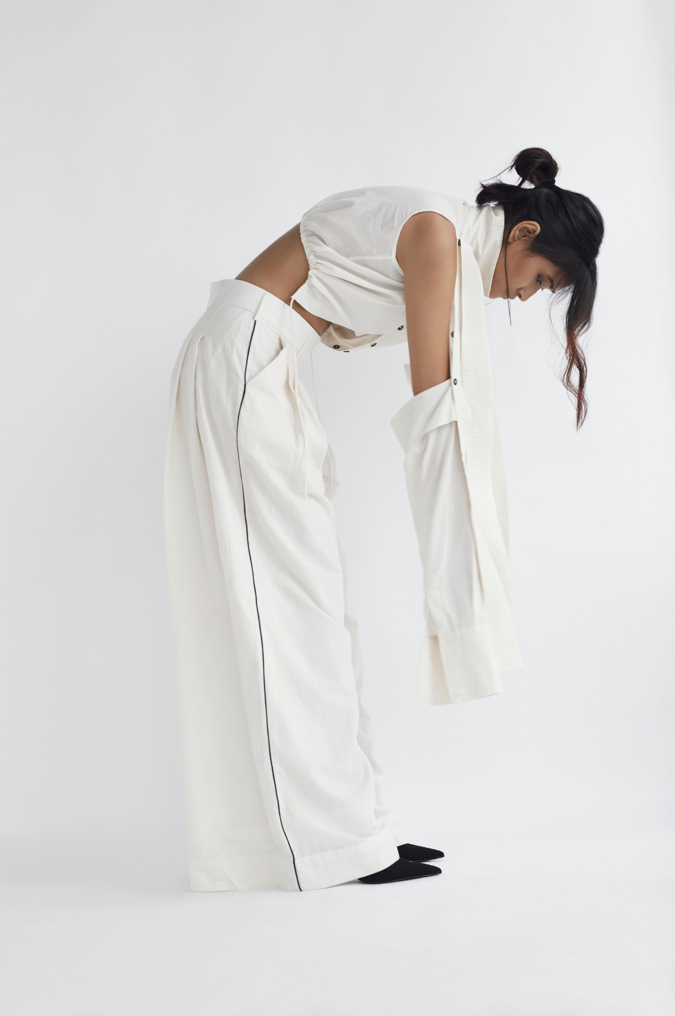 Jane is a pair of double pleated trousers that have side pockets, piping details at the sides and a belt at the waist.