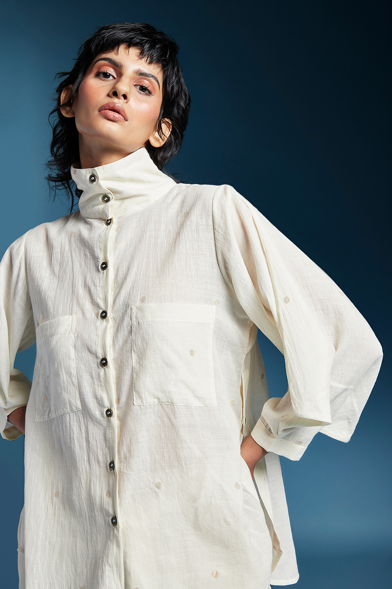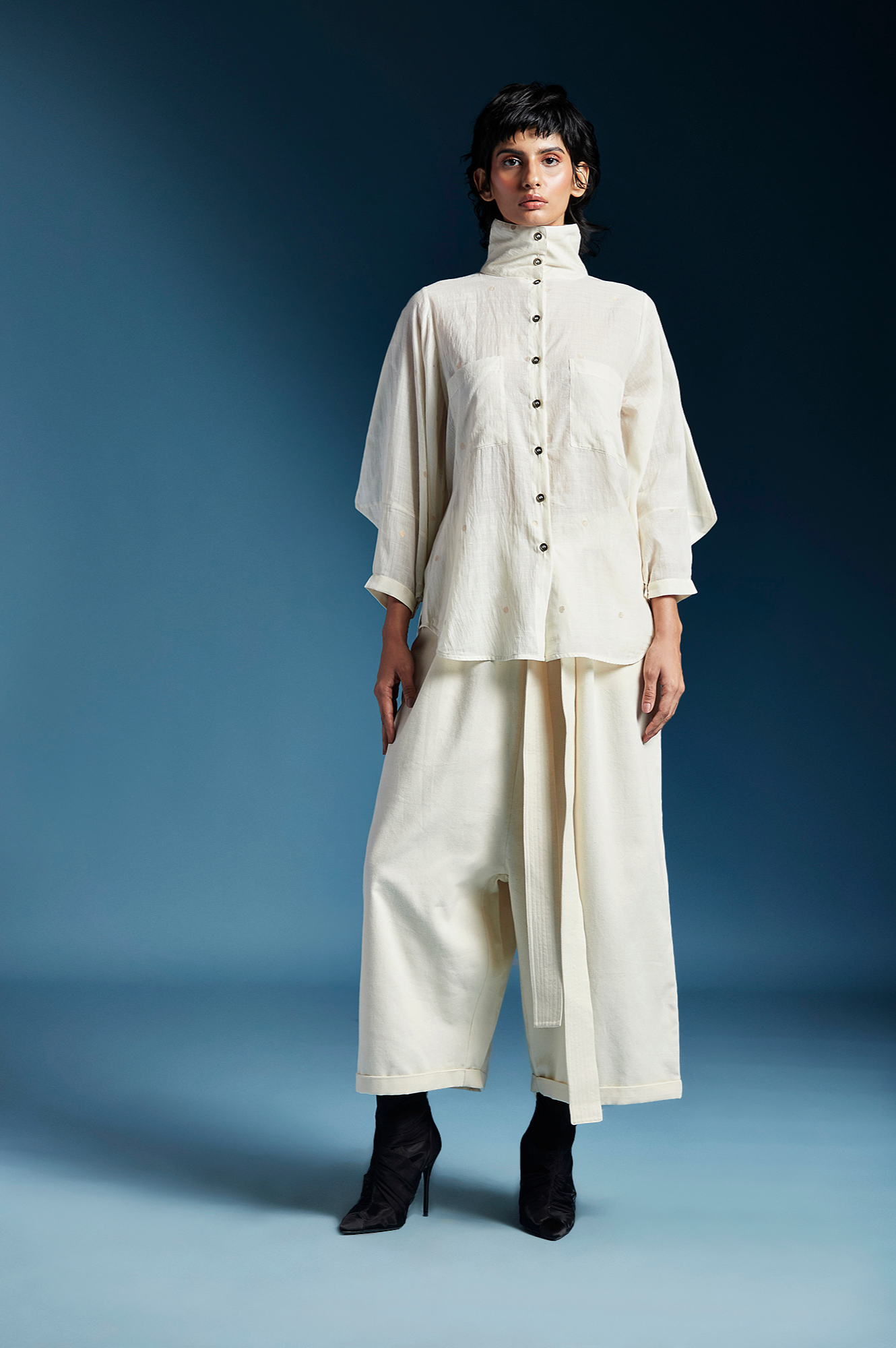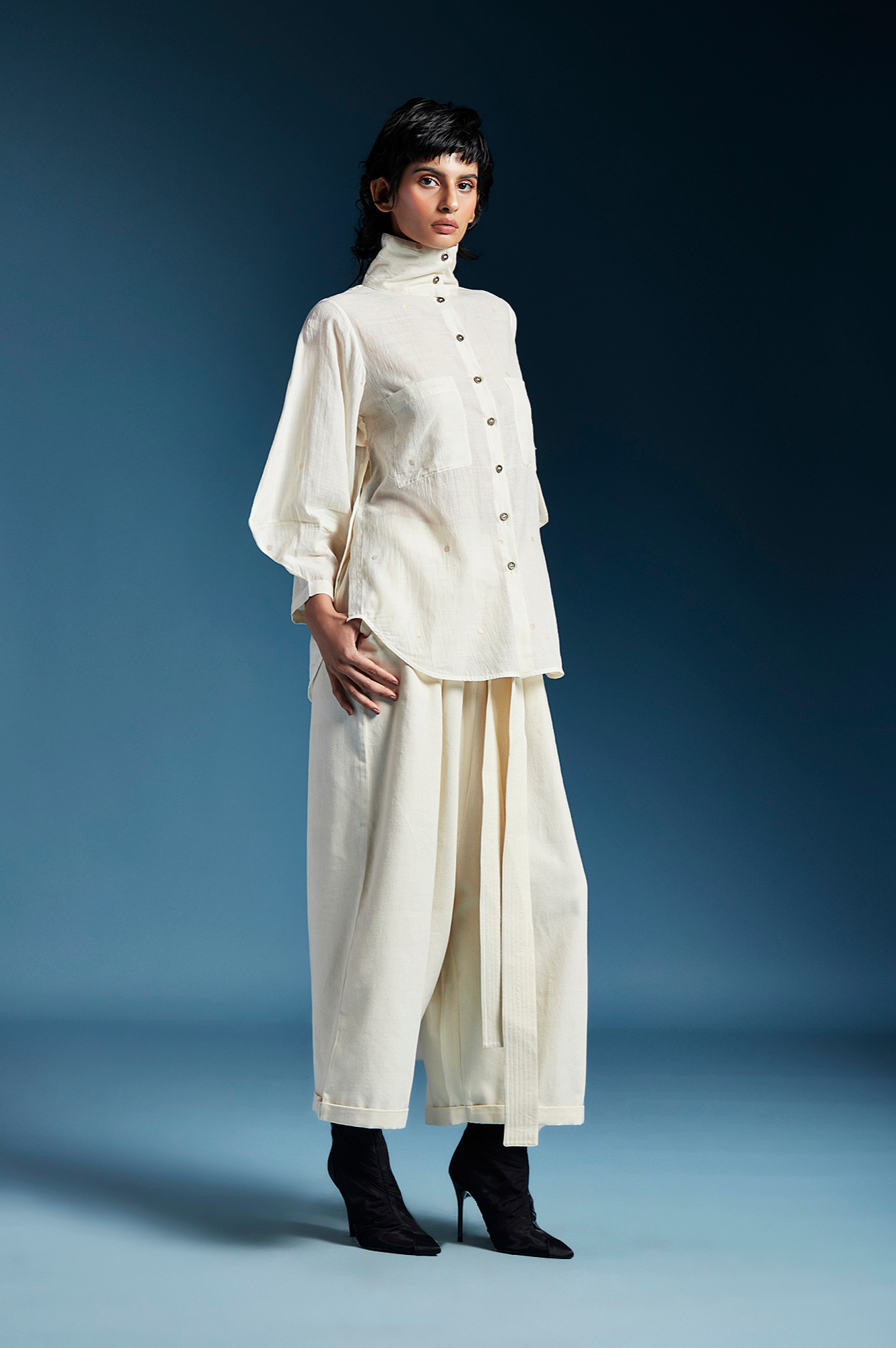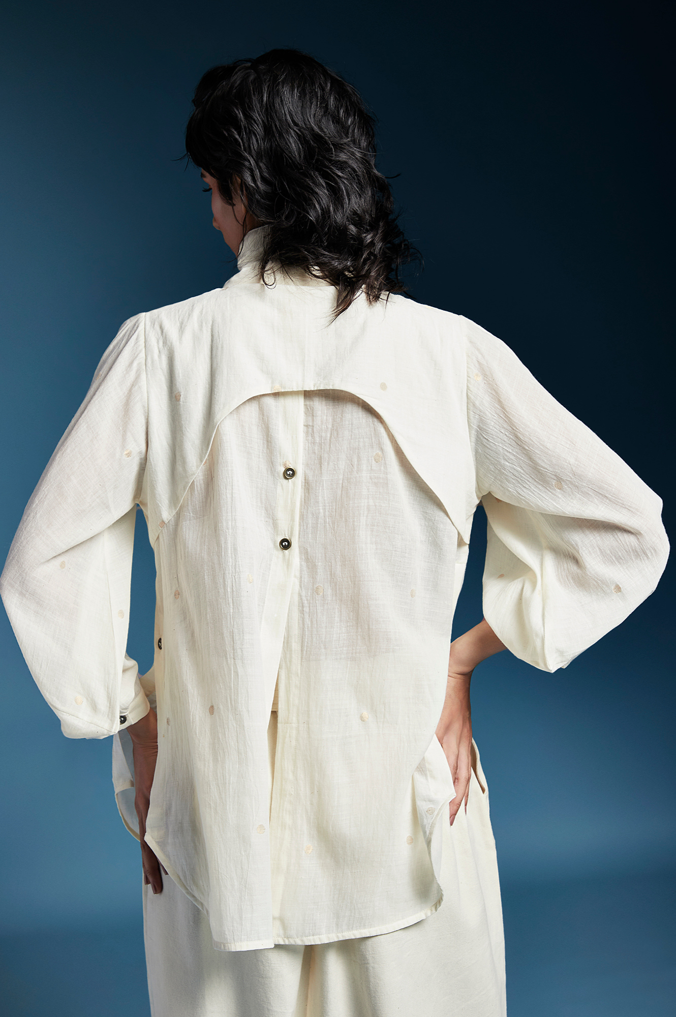 The Jennie shirt features a high collar, lantern sleeves, front button placket and curved back flap with button placket.