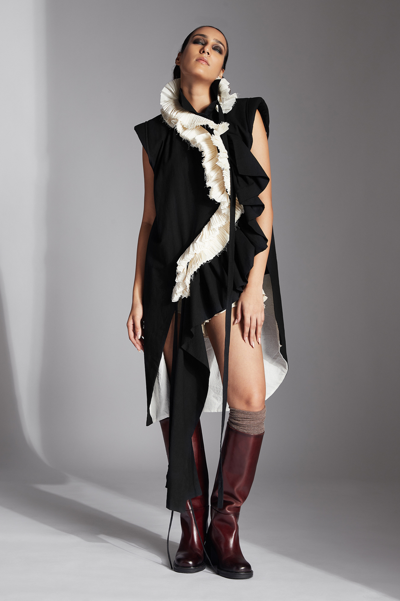 Kathy jacket exhibits a sleevesless wrap around jacket style with a curve placket featuring contrasting pleated frills on the front, collar and shoulder pad detail.