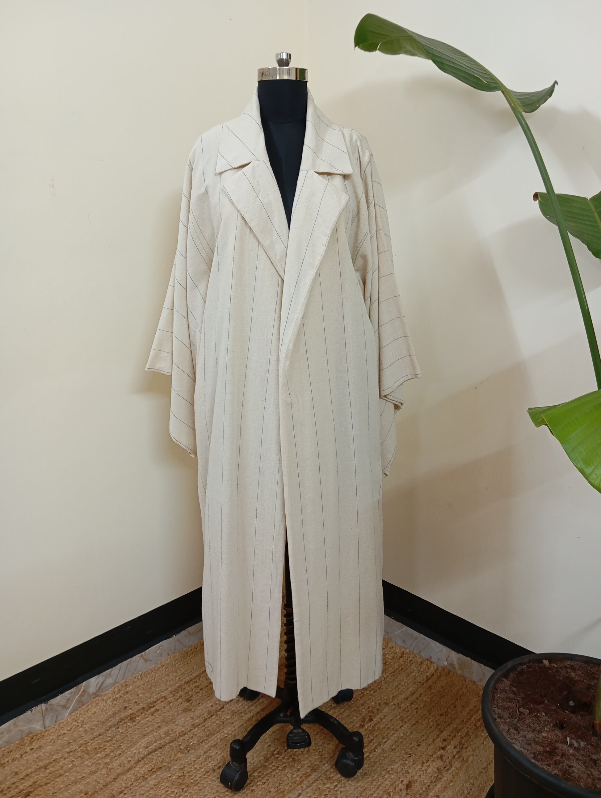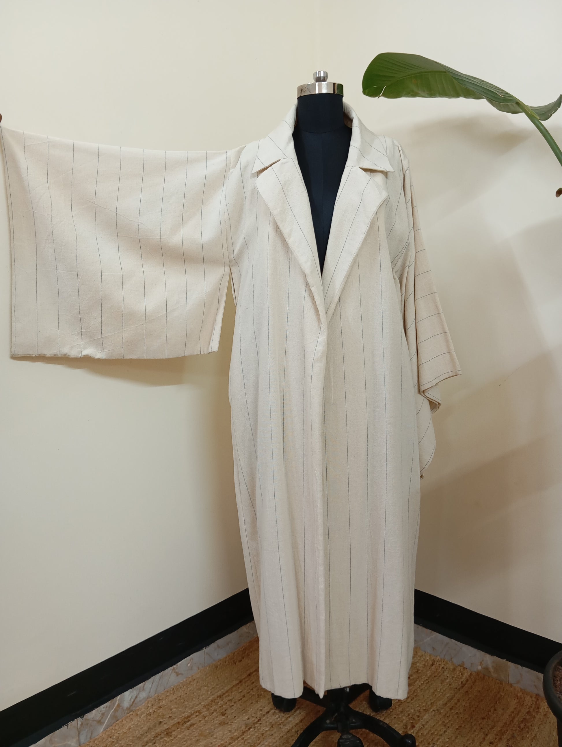 The Knox jacket features kimono sleeves, a wide notch collar and side pockets. Additionally, it has a pleats at the back.
