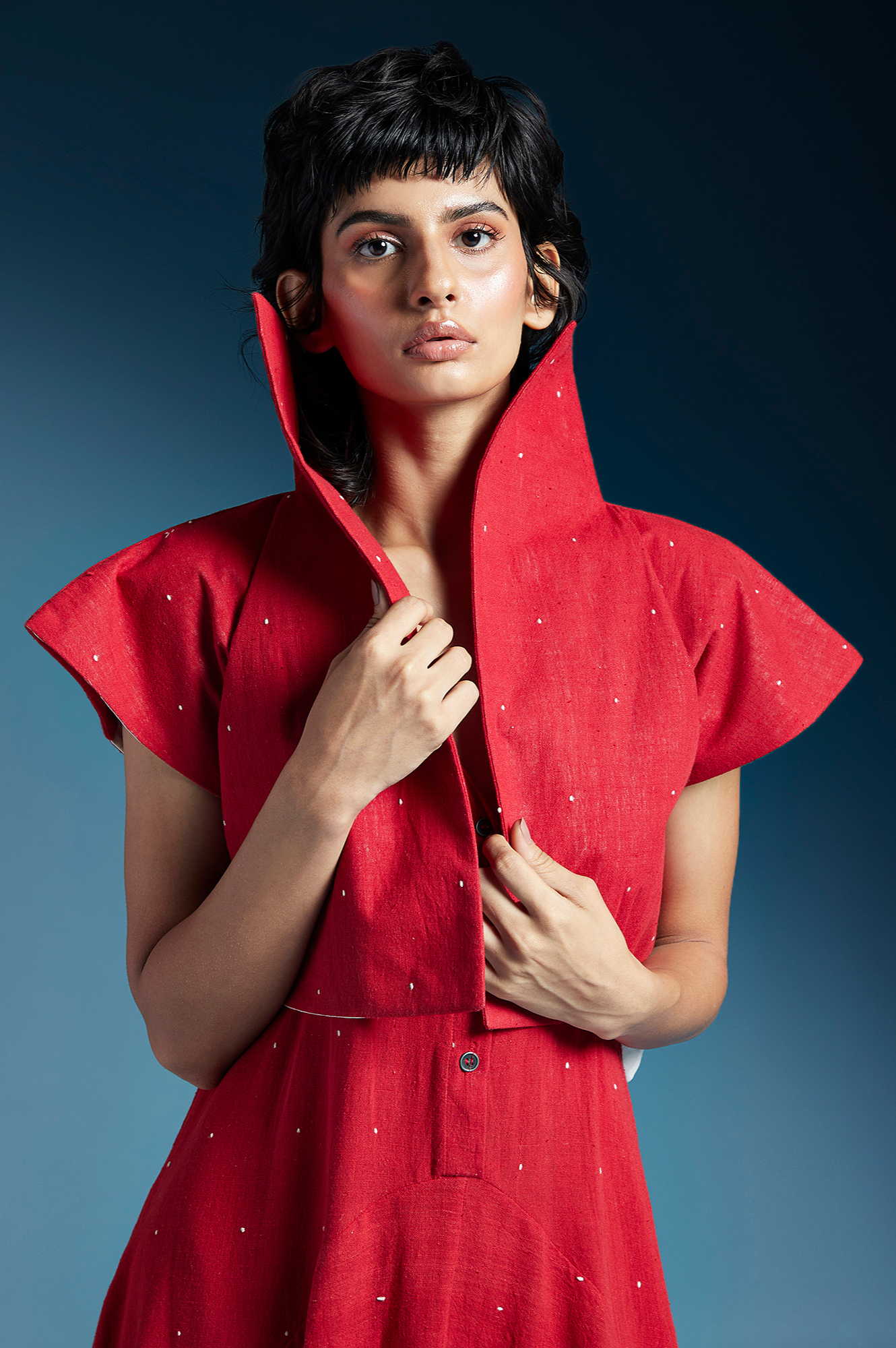 The Lou Jacket features a high collar, cap sleeves, back yoke and back placket.
