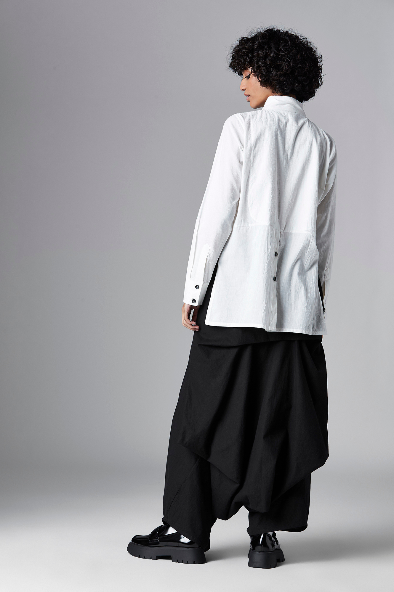 The Mika shirt features a stand collar, curved front button placket and curved hem at the front. Additionally, it features narrow sleeves and a half button-down placket at the back.