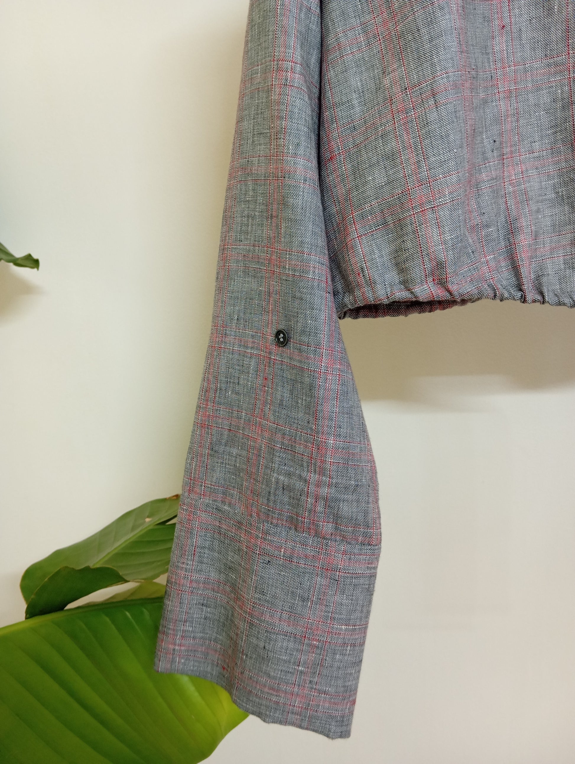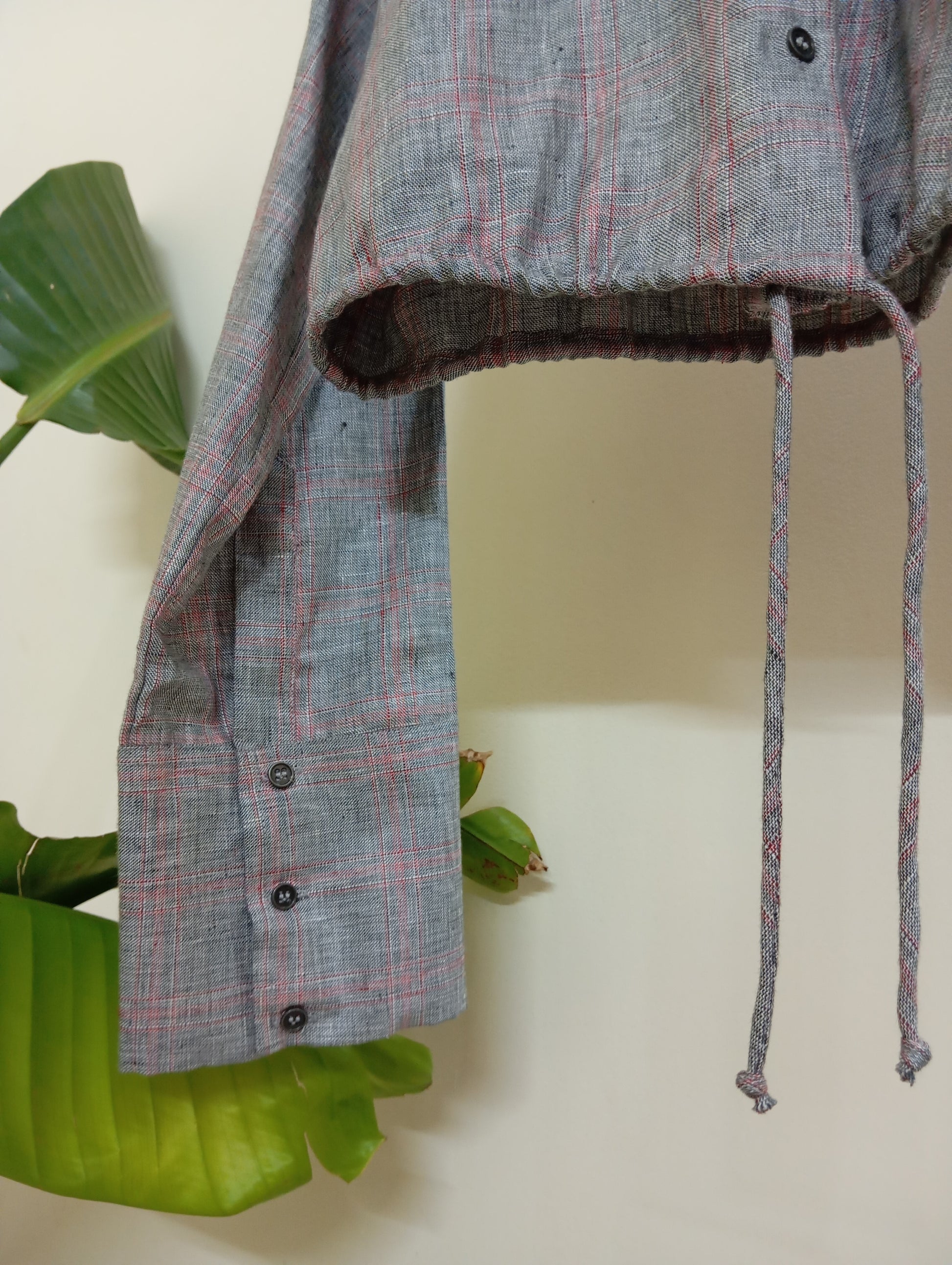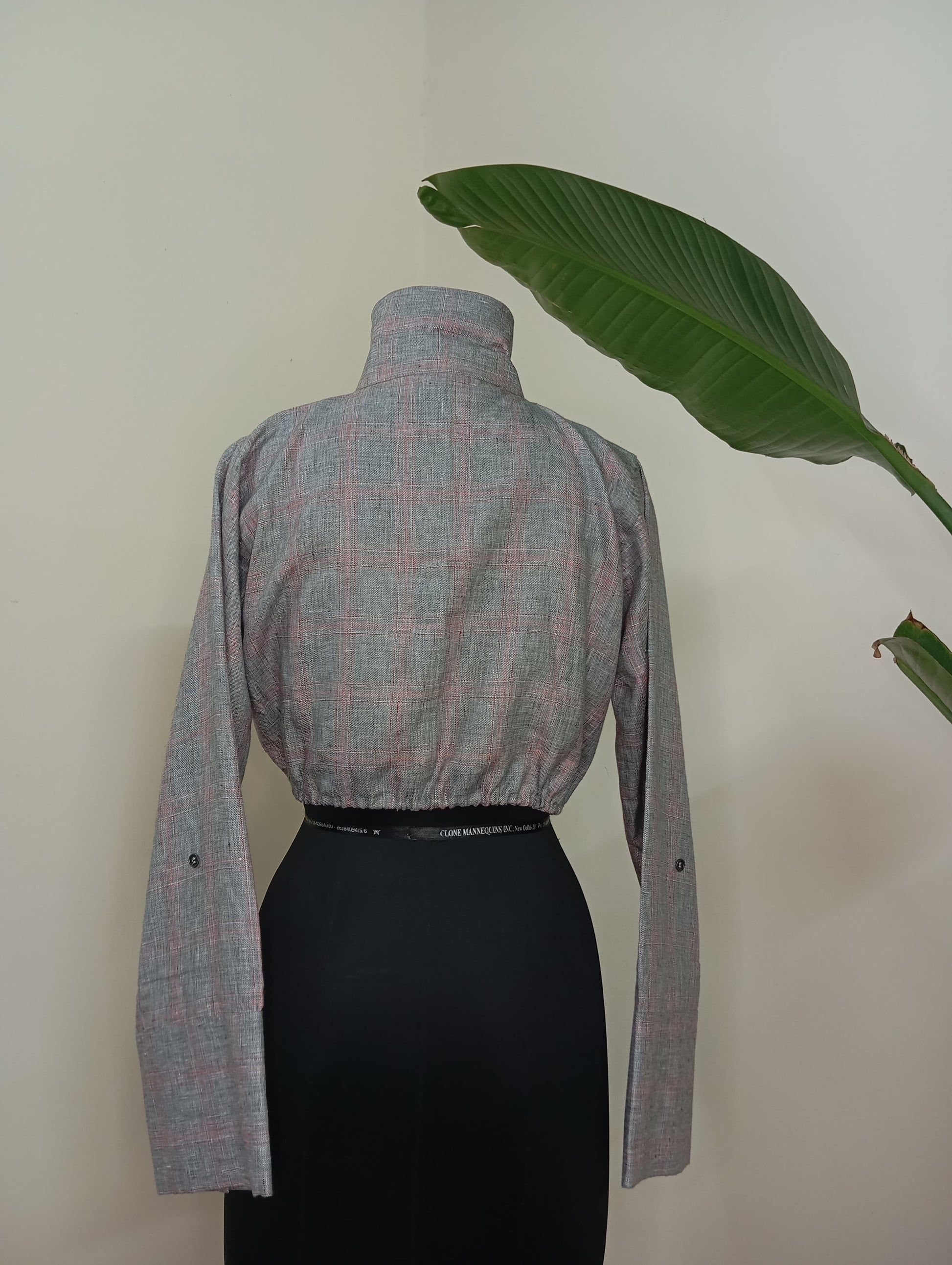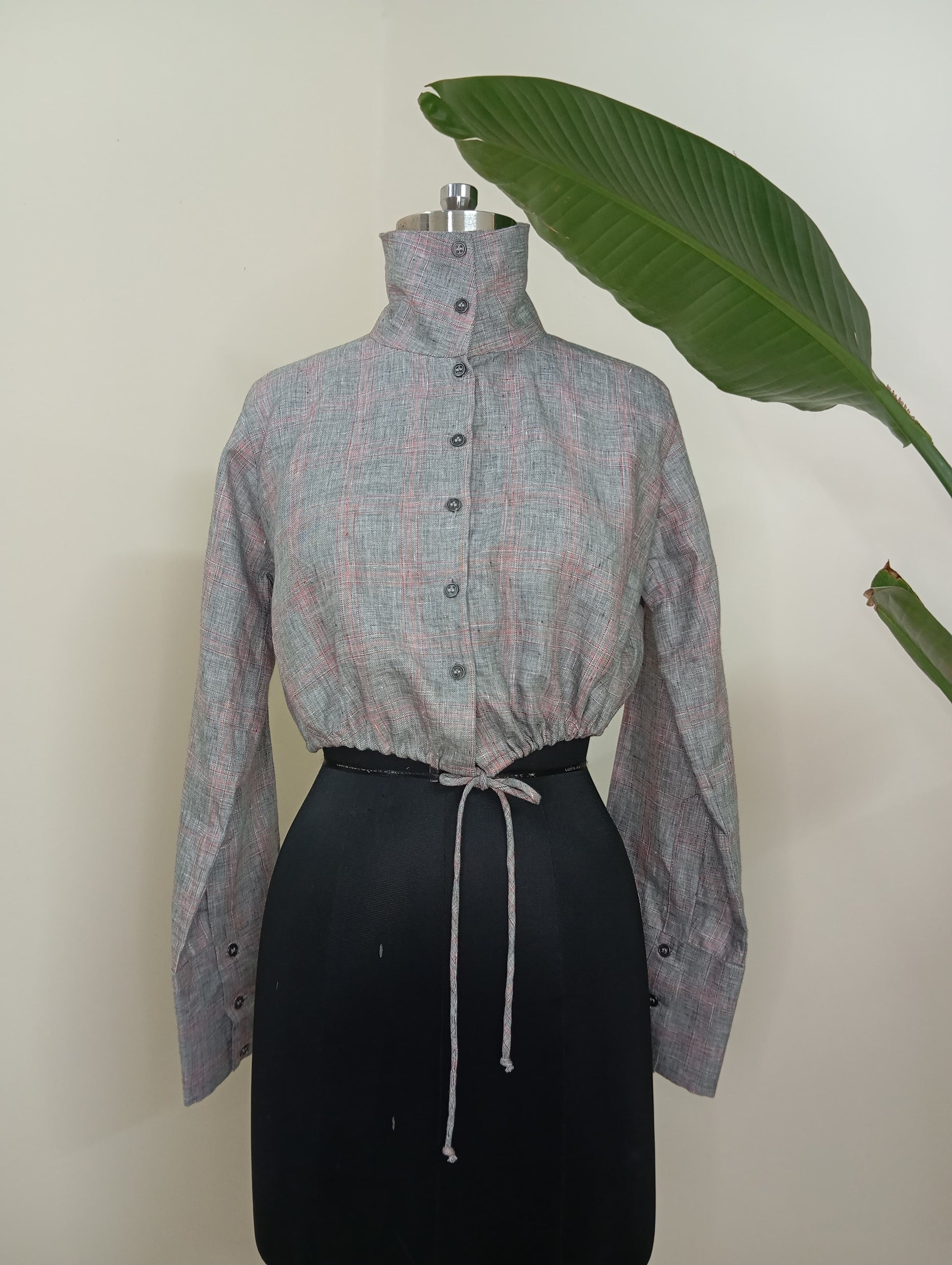 Crop Shirt with high collar, straight sleeves and drawstring at hem.