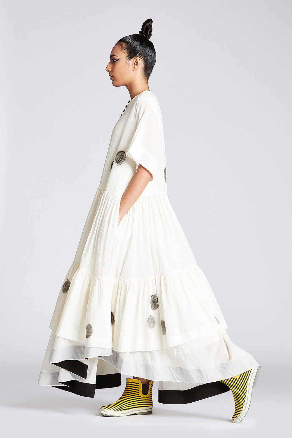 Miyuki is a painted long Frill Dress that features a round neck, half front button down placket and in seam pockets.
