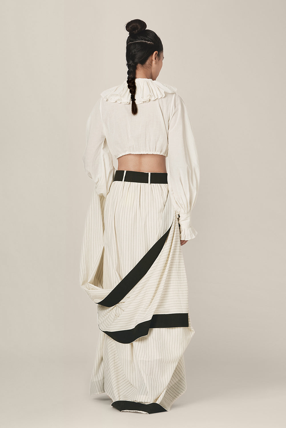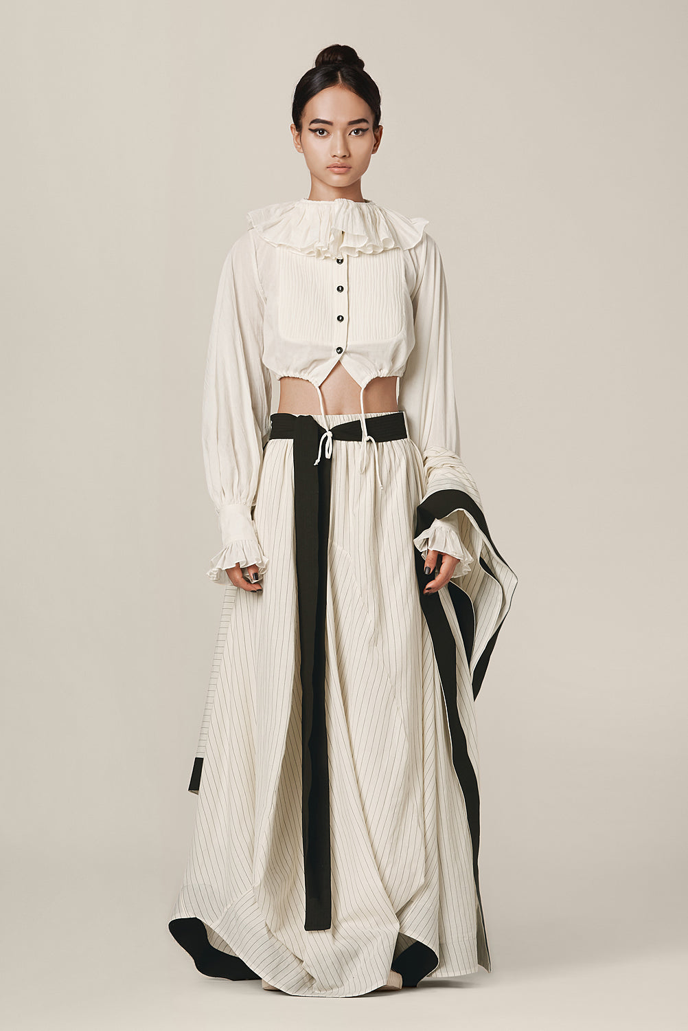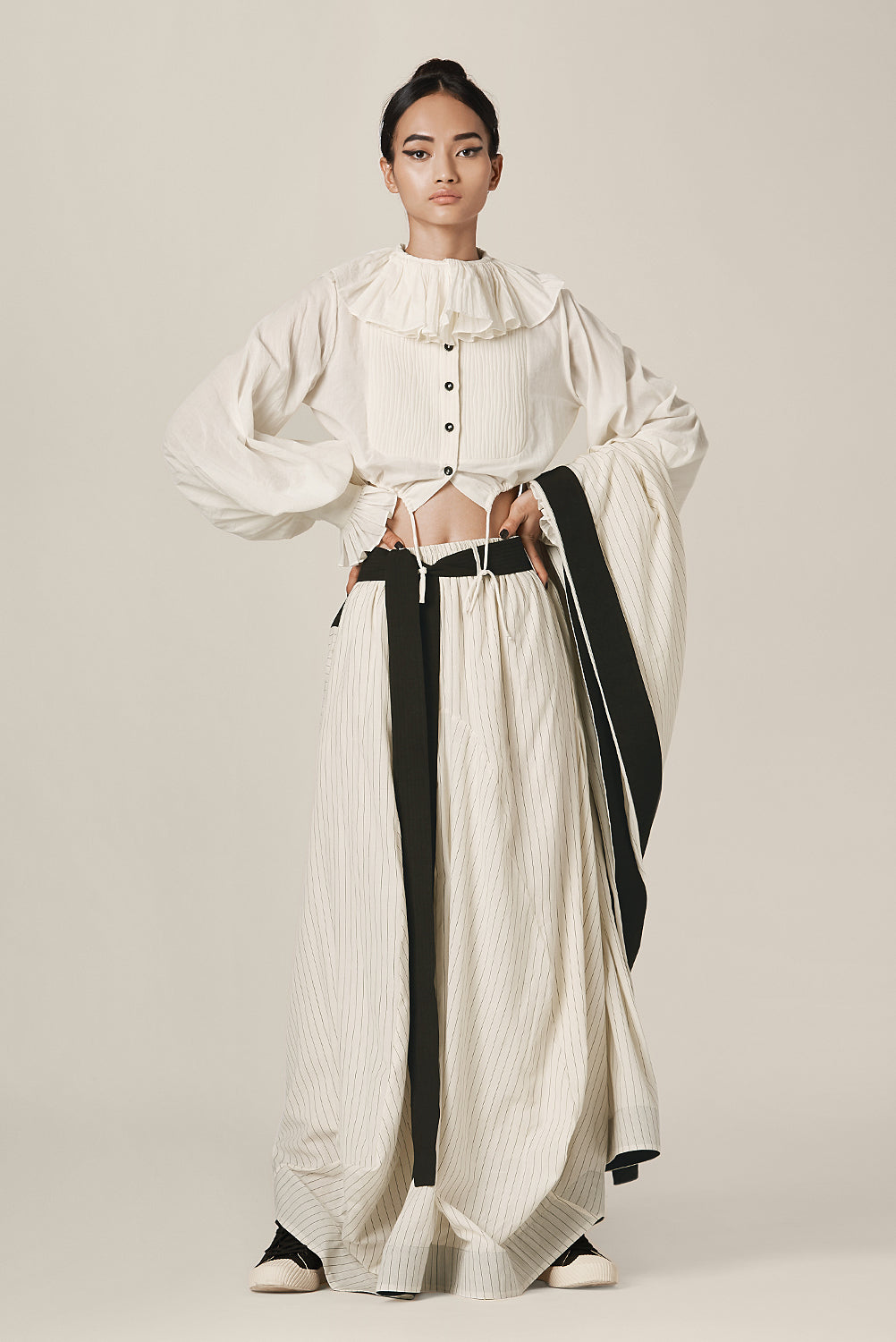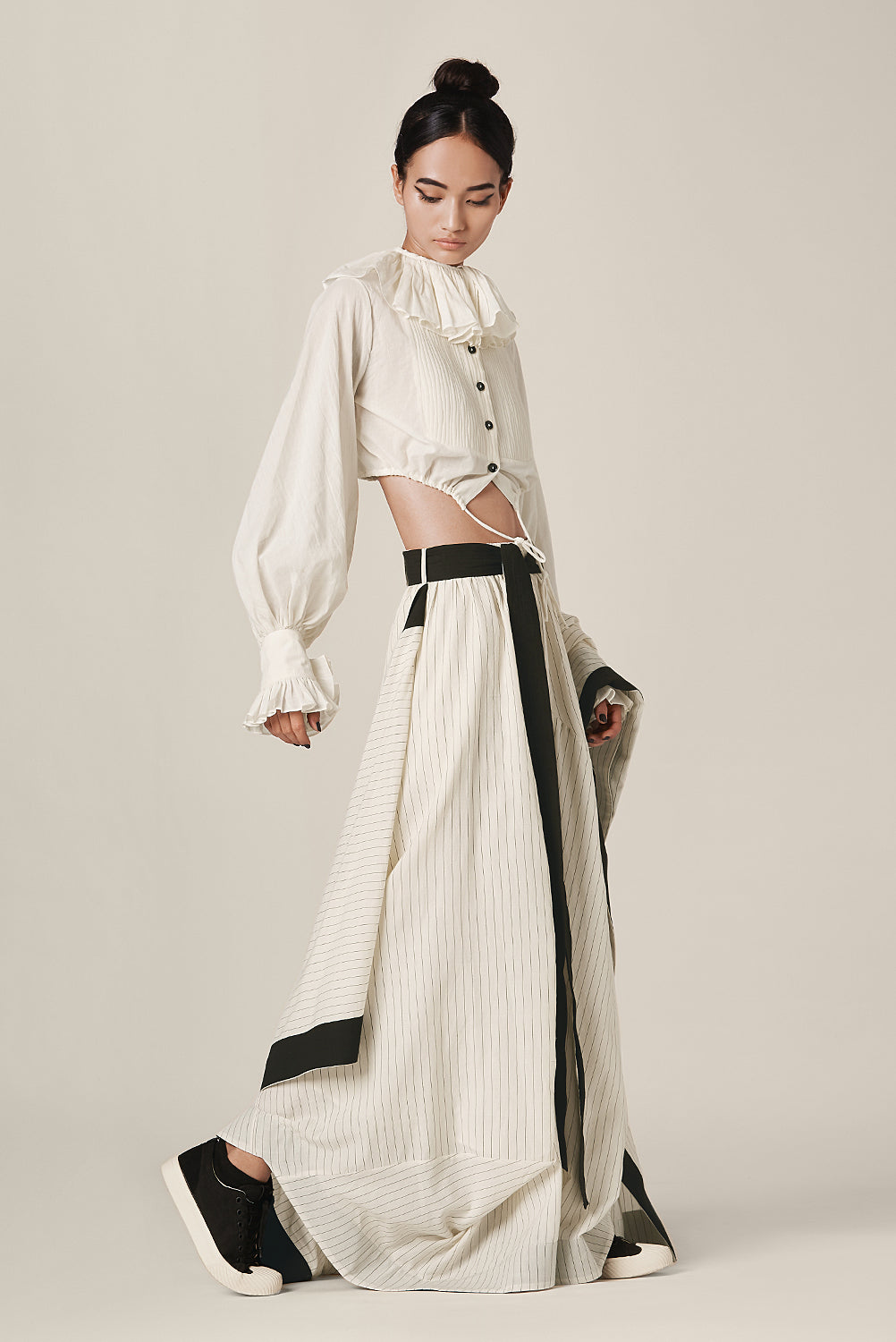 Ophelia Shirt features a frill collar, exaggerated bishop sleeves with ruffled cuff and drawstrings at the hem.