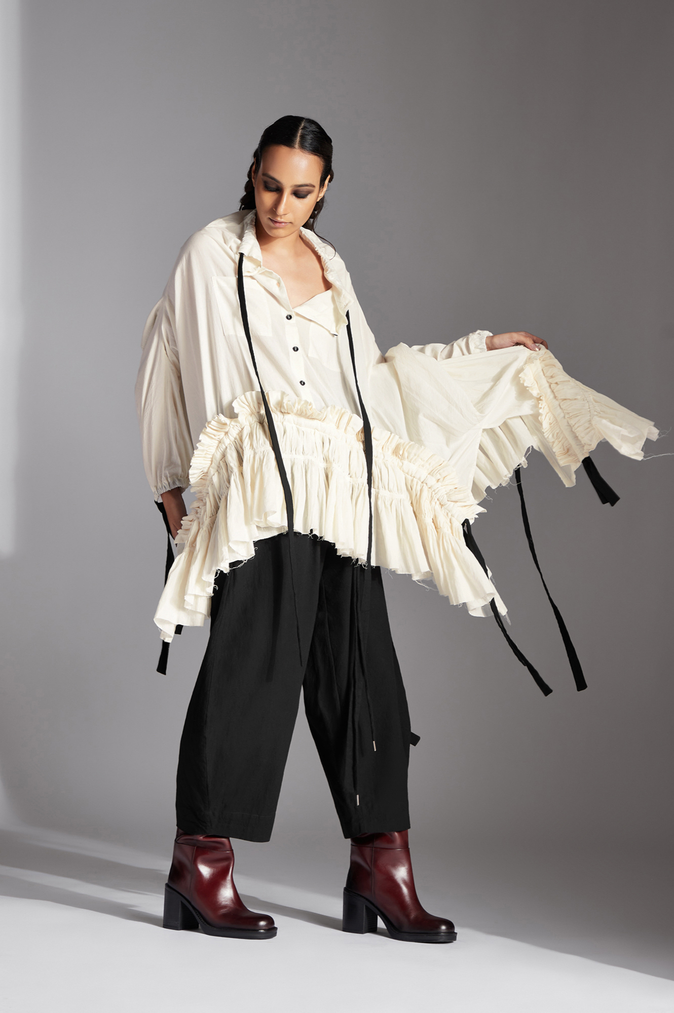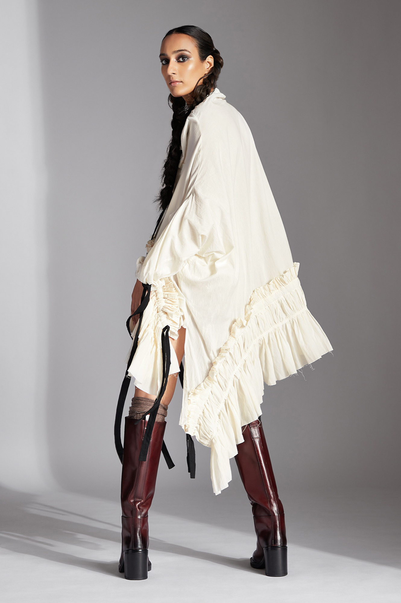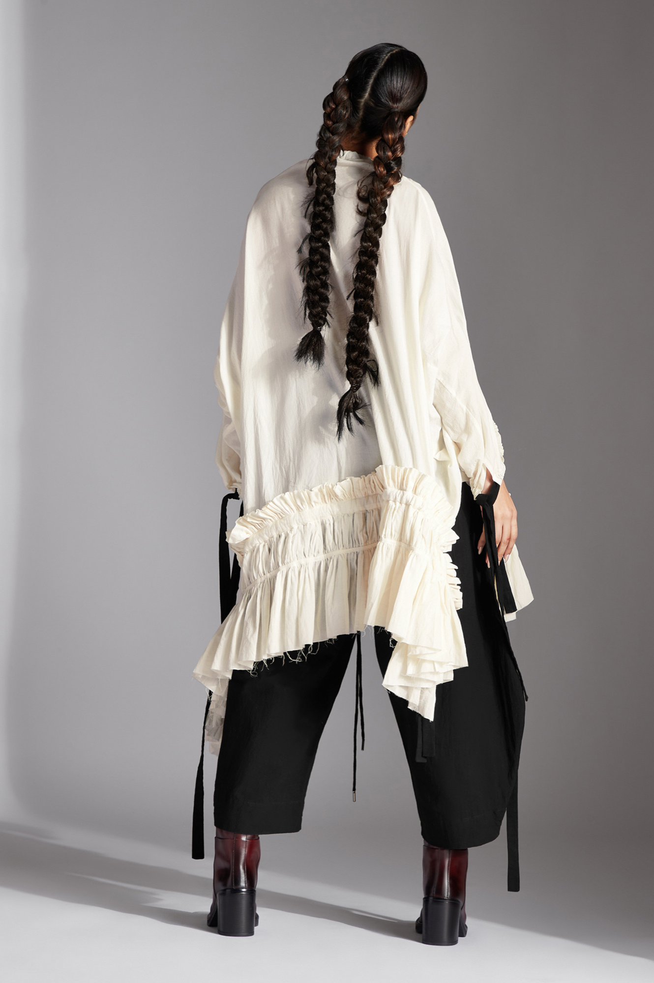 Deconstructed top which features a half front button down placket, extended high collar with adjustable straps, adjustable smocked frills on the front and back and side slits for ease.