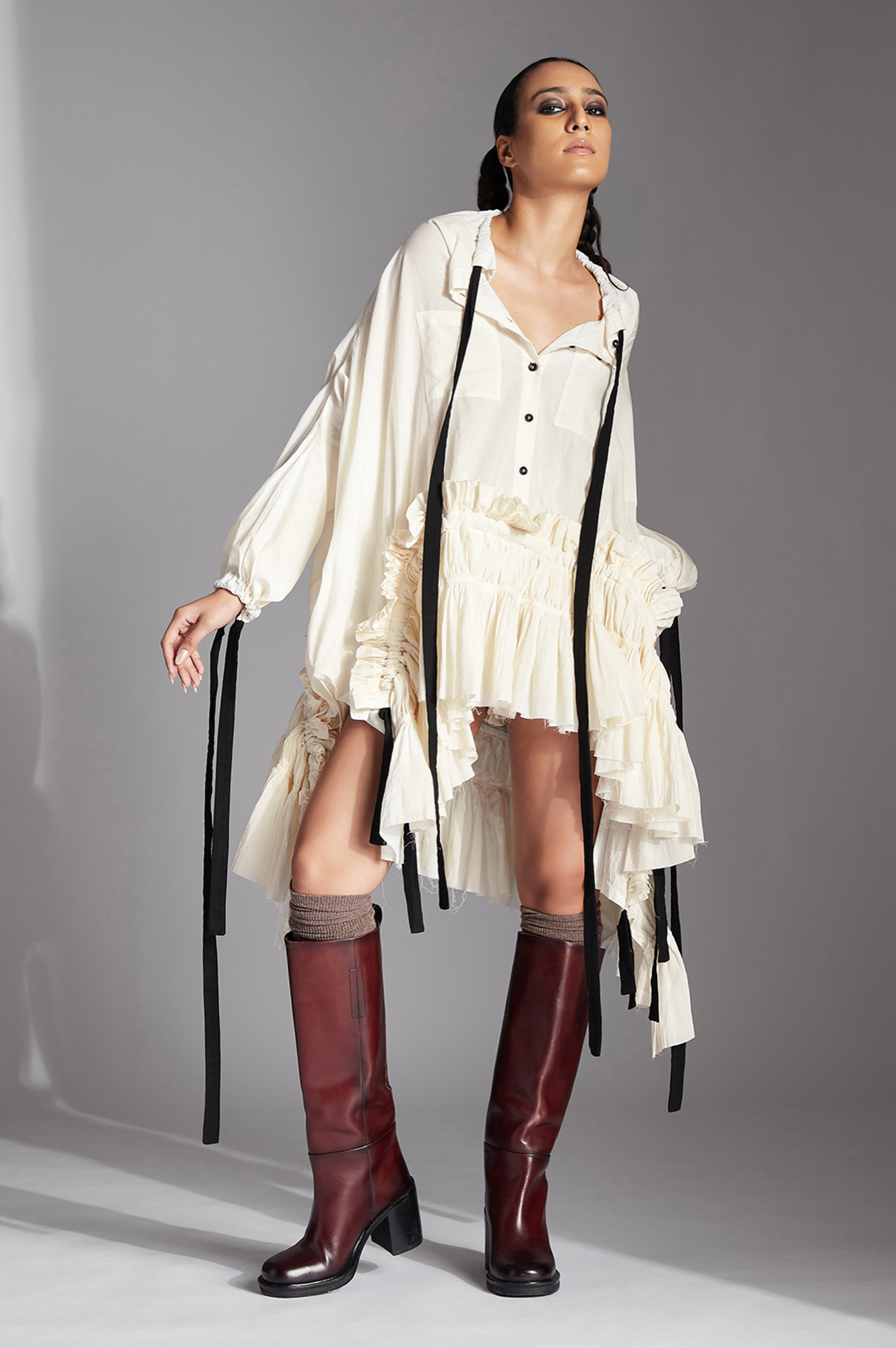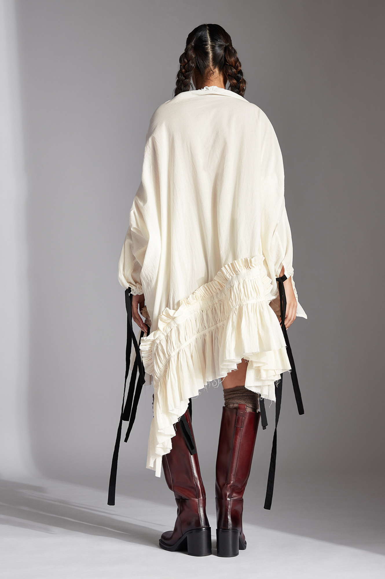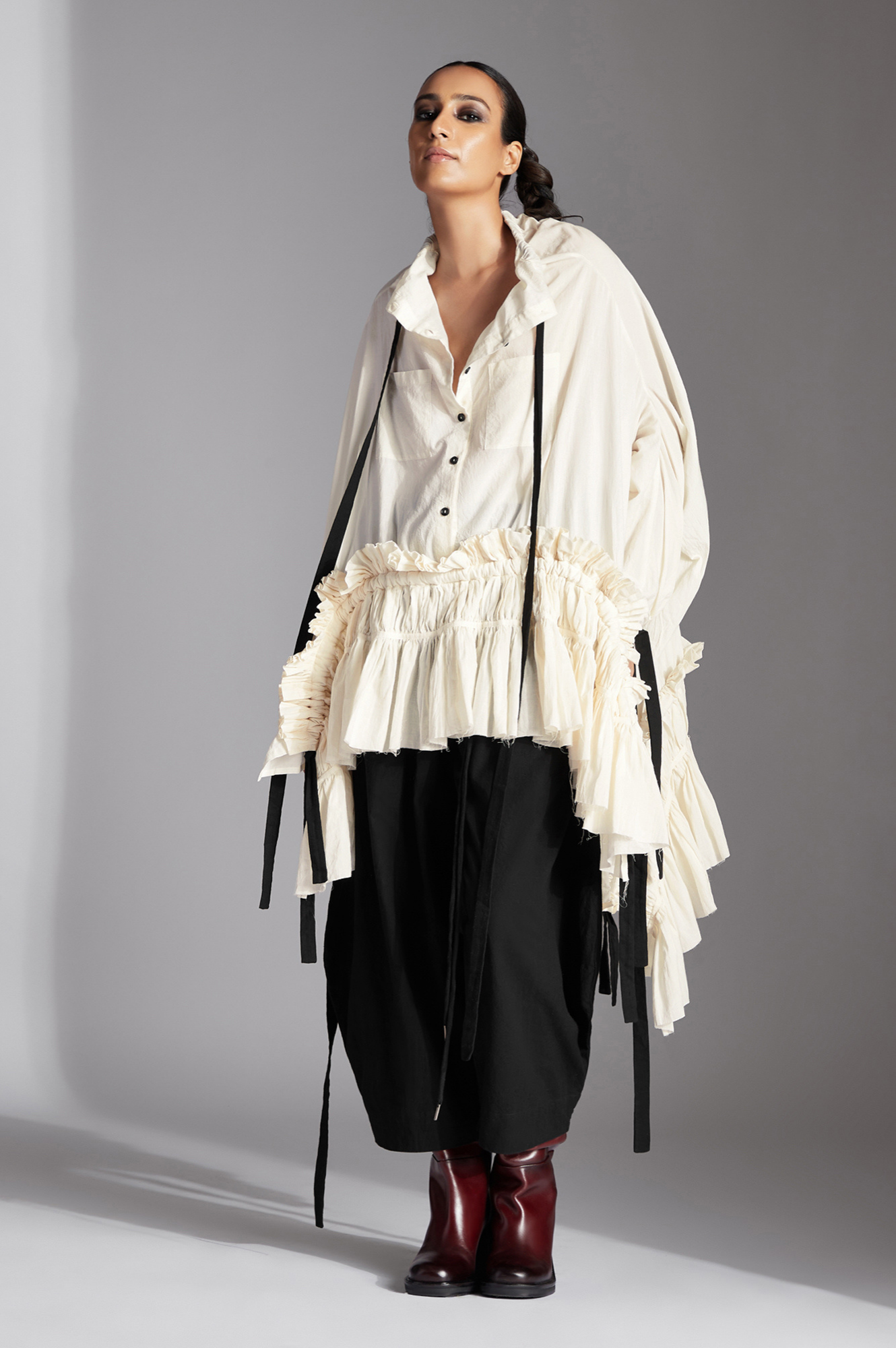 Deconstructed top which features a half front button down placket, extended high collar with adjustable straps, adjustable smocked frills on the front and back and side slits for ease.