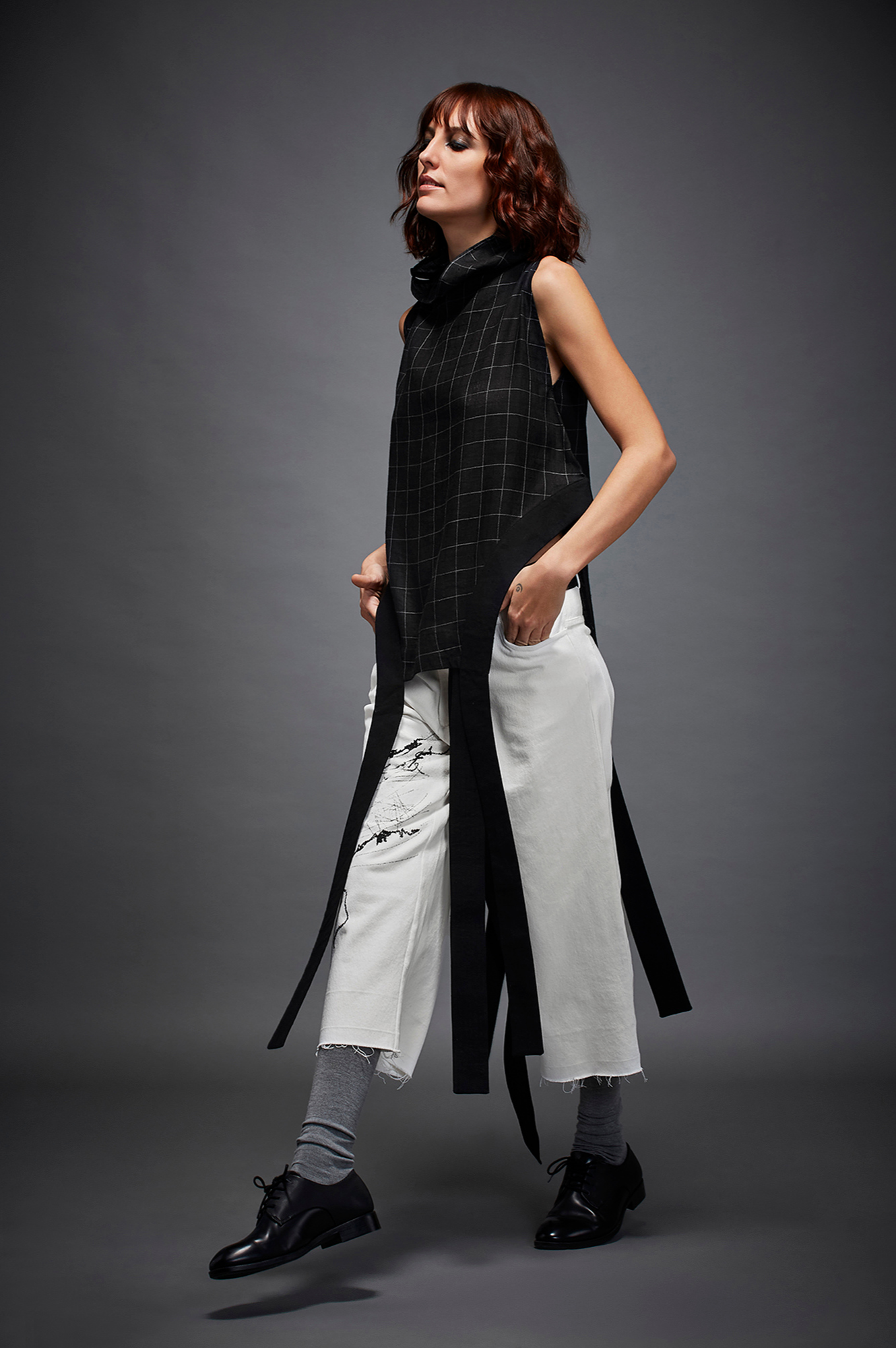 Our Ramona Top features a high collar with loop / button fastening and side curved slits with a contrast belt detail.