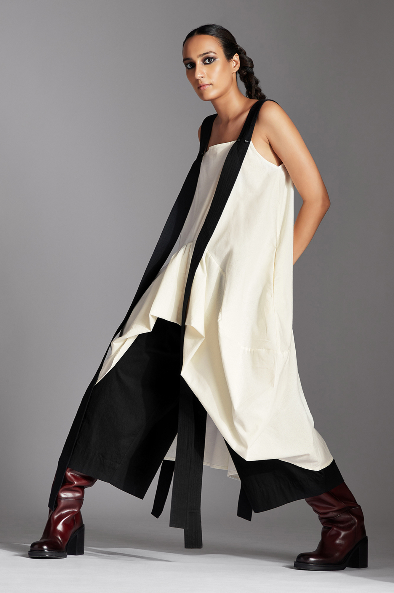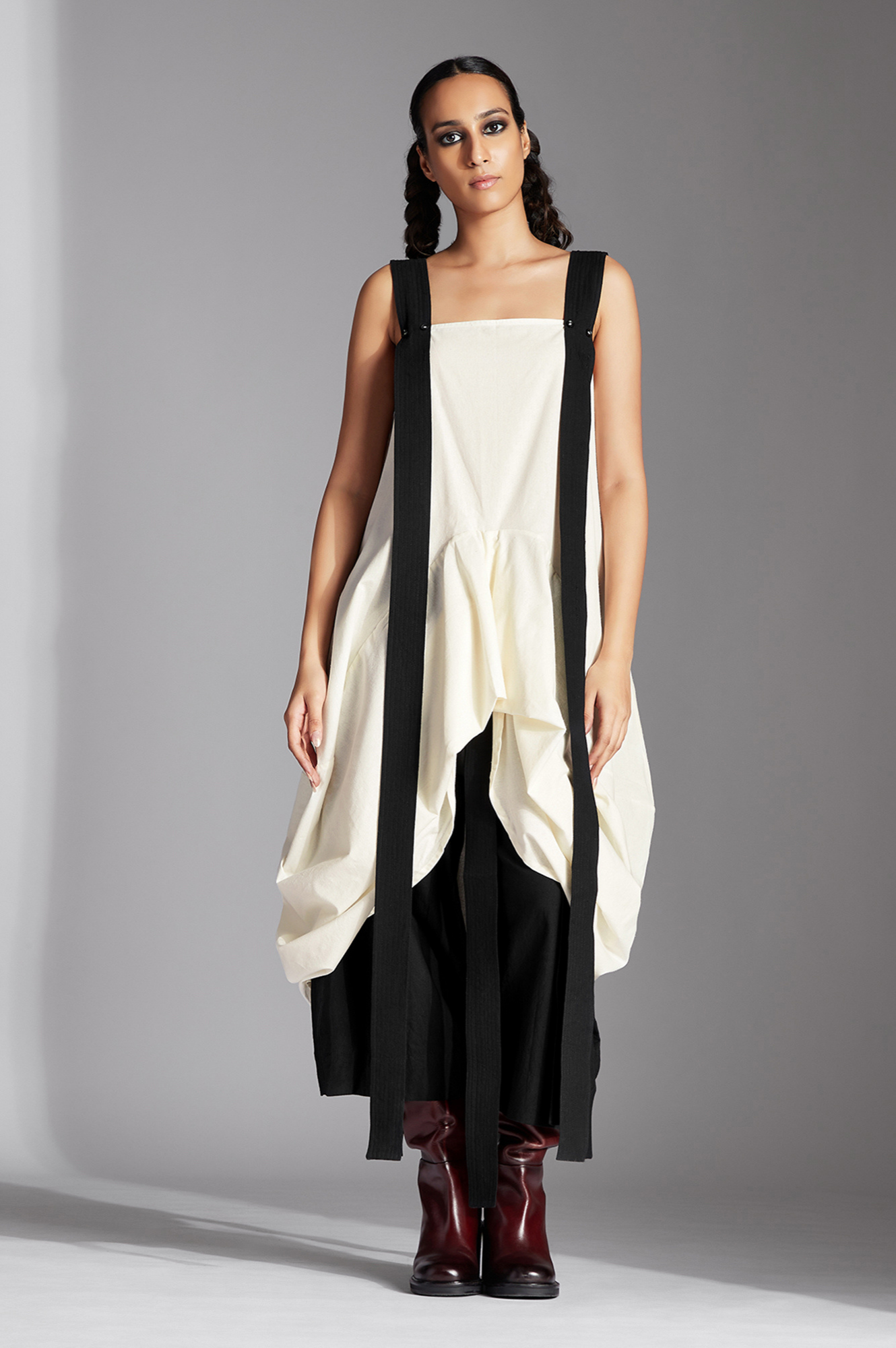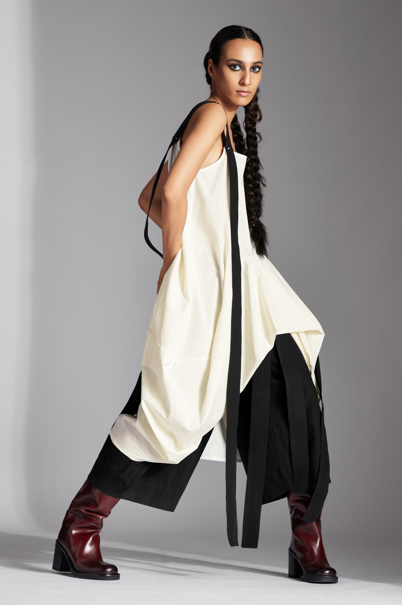 The Reni top follows a high-low deconstructed style with contrast adjustable pinafore straps and side pockets.