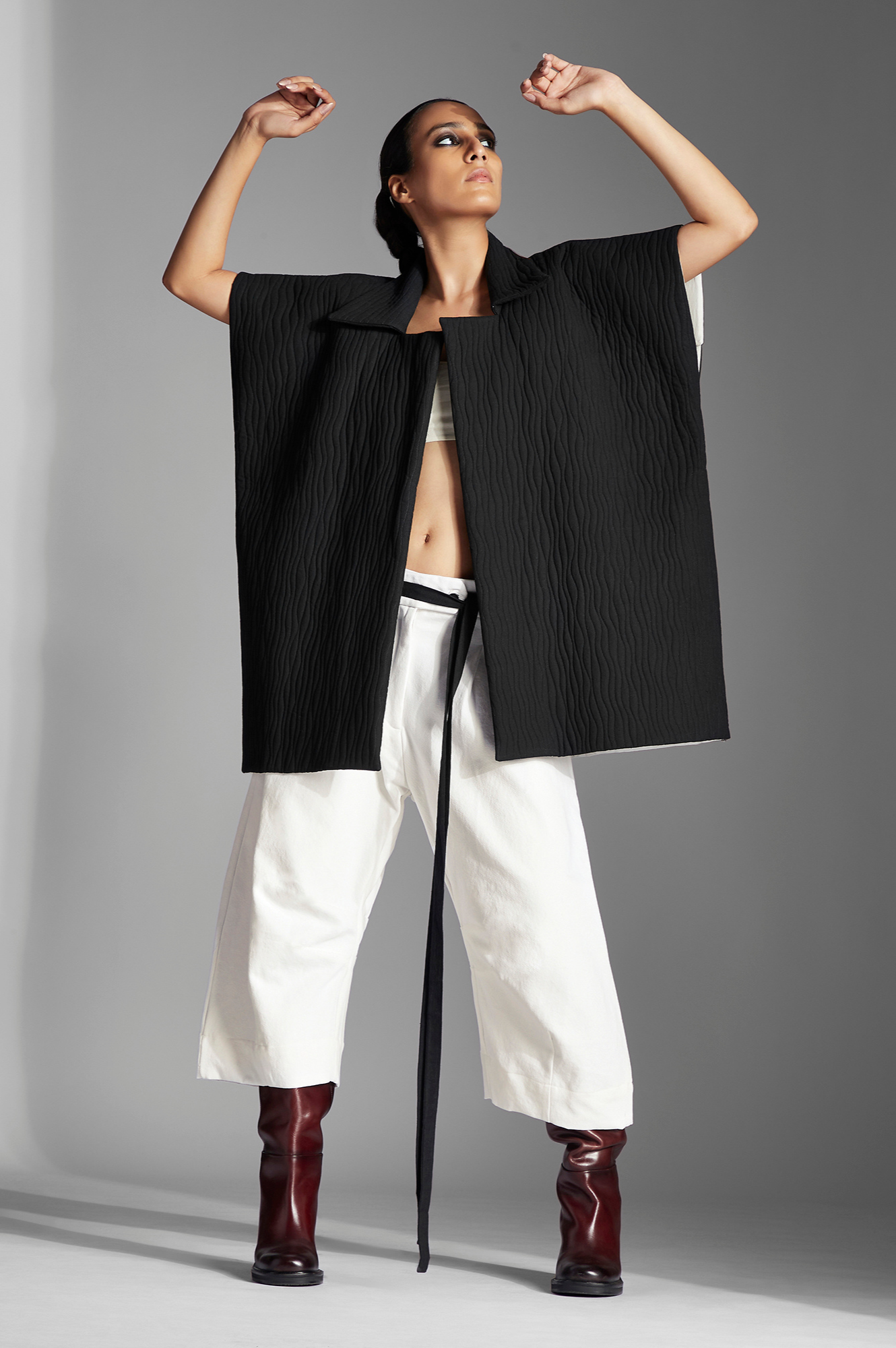 The Rov Jacket has a quilted body and exhibits an oversized silhouette with notched collar, contrasting belt detail at the collar and back and side pockets.