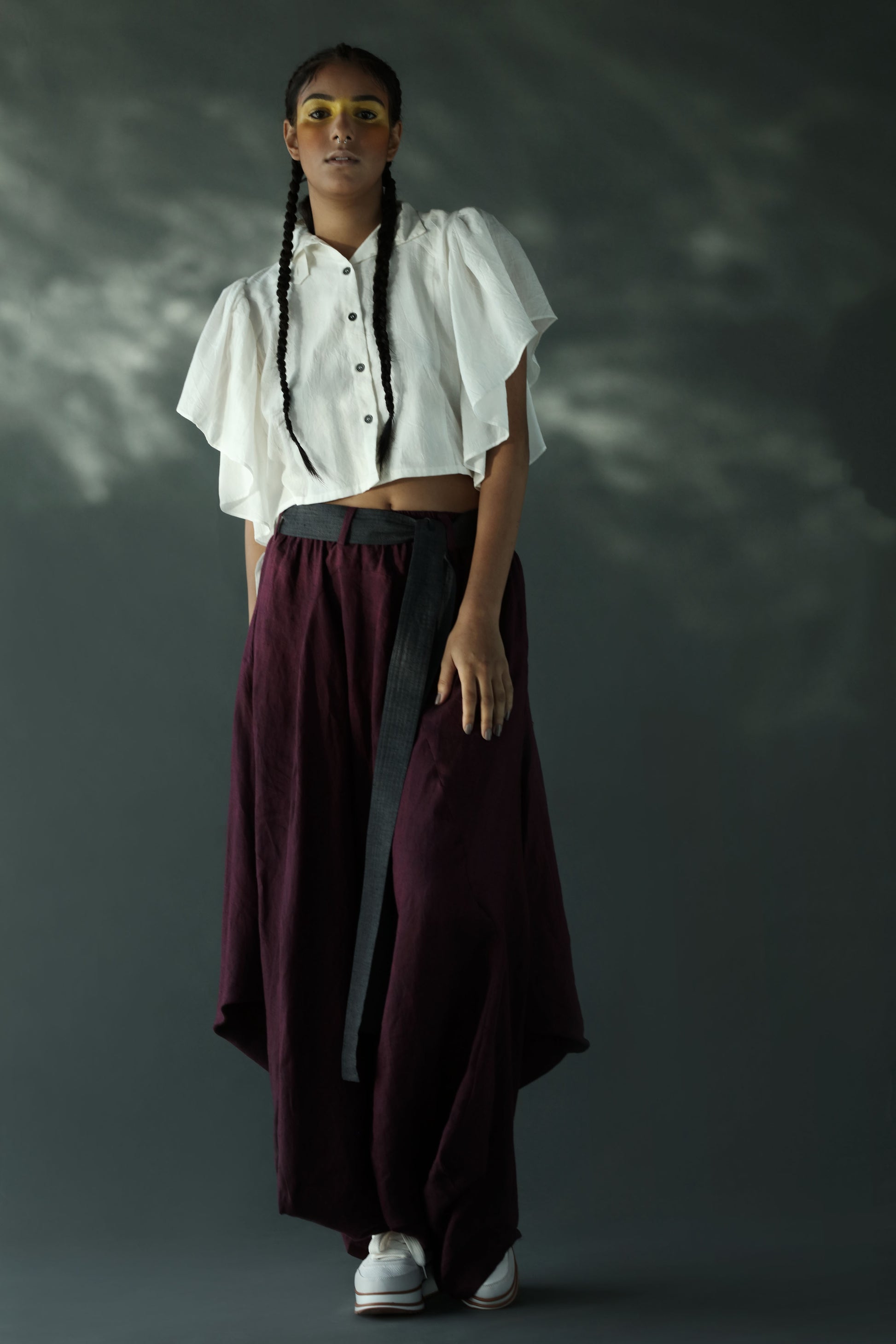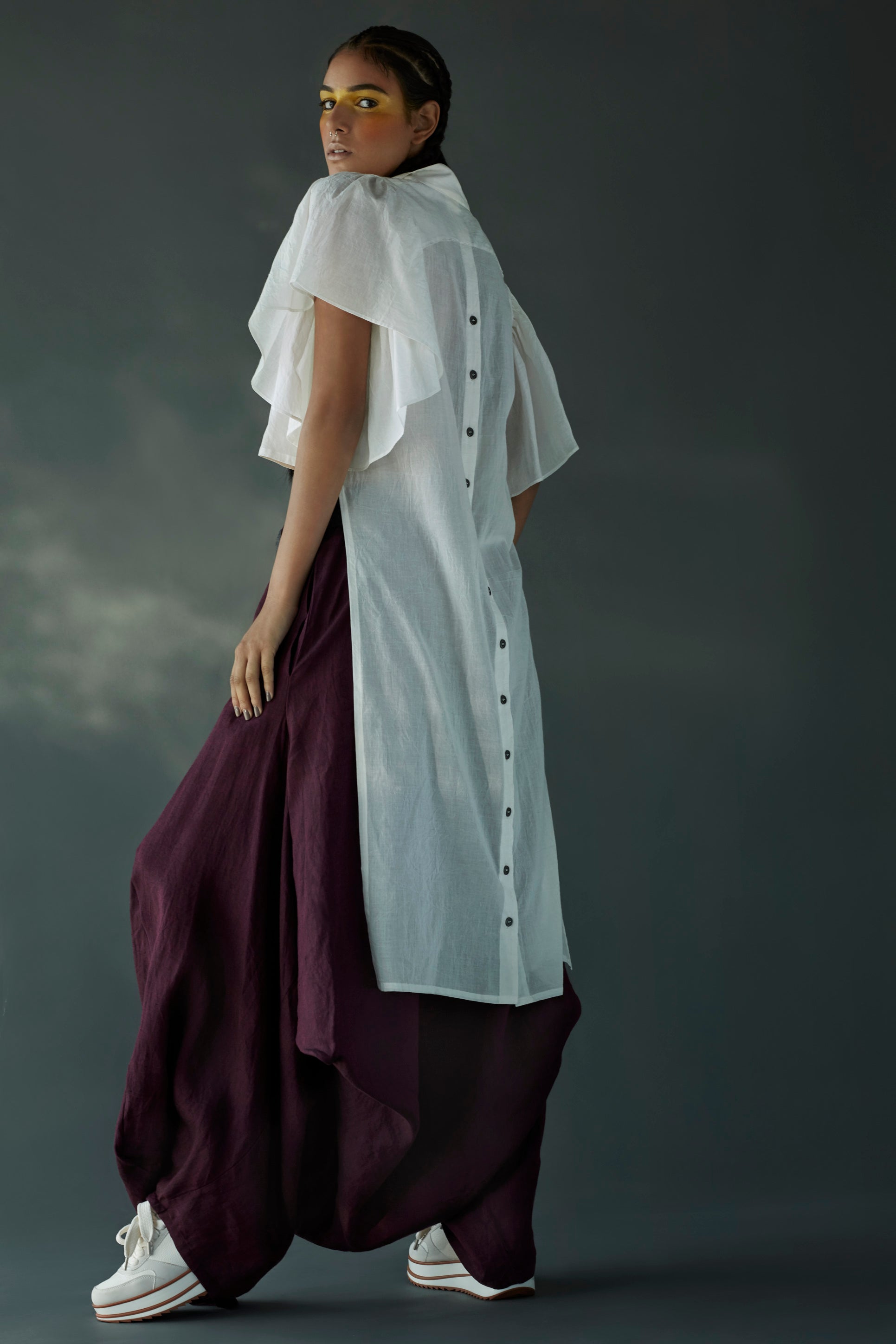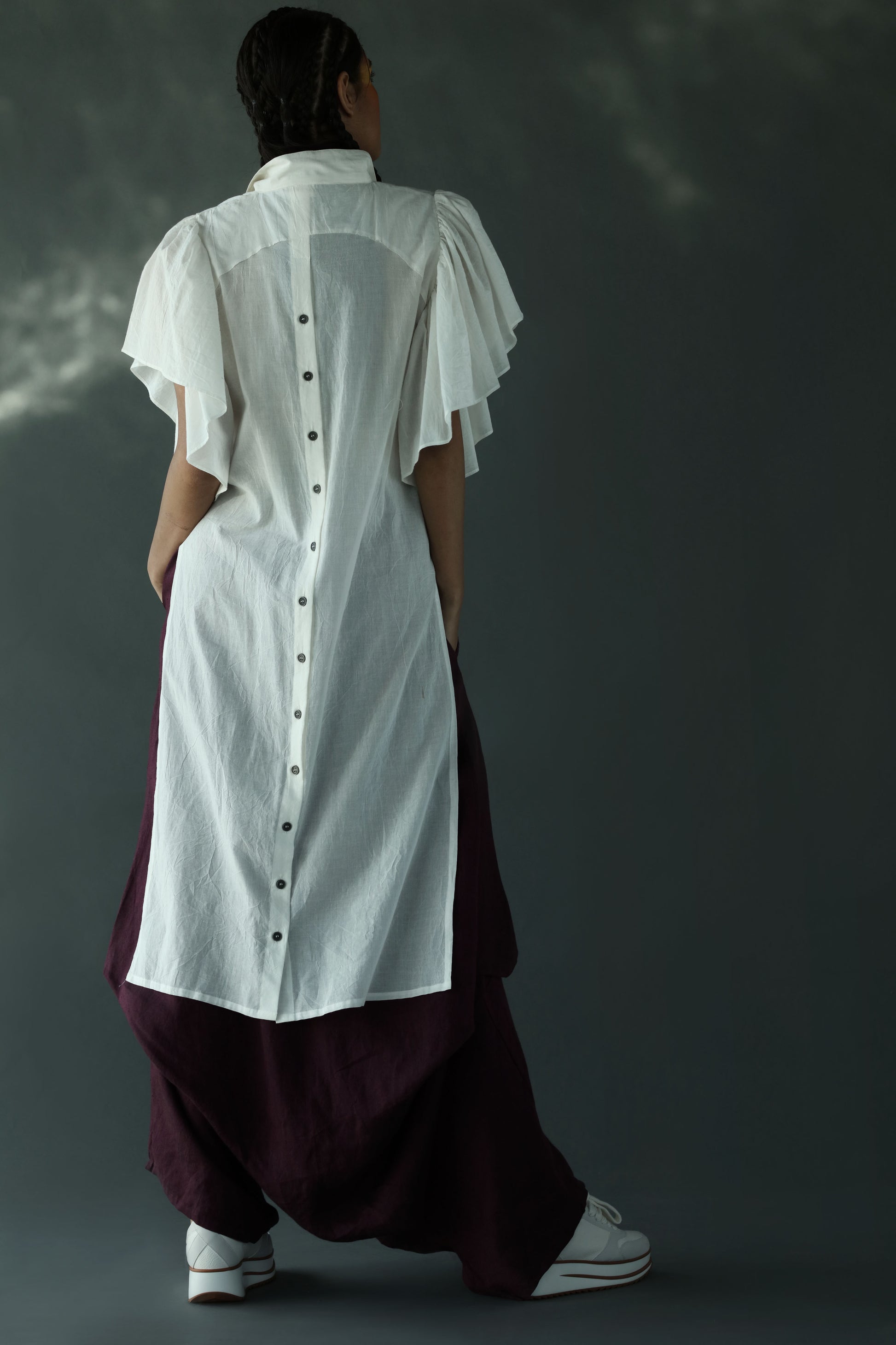 The Sepher Shirt follows a High Low style and has a bandhgala collar, a front yoke, circular frill sleeves and has a U-shaped yoke with buttons at the back.