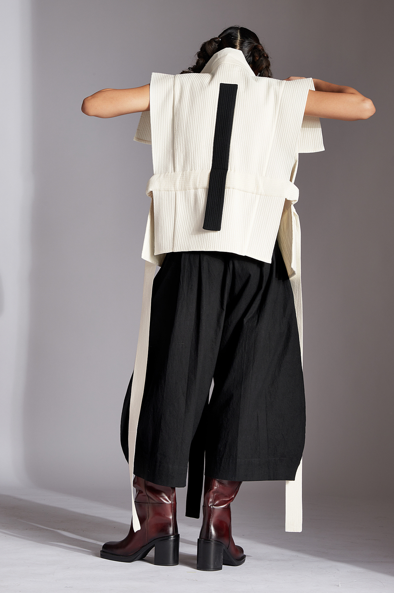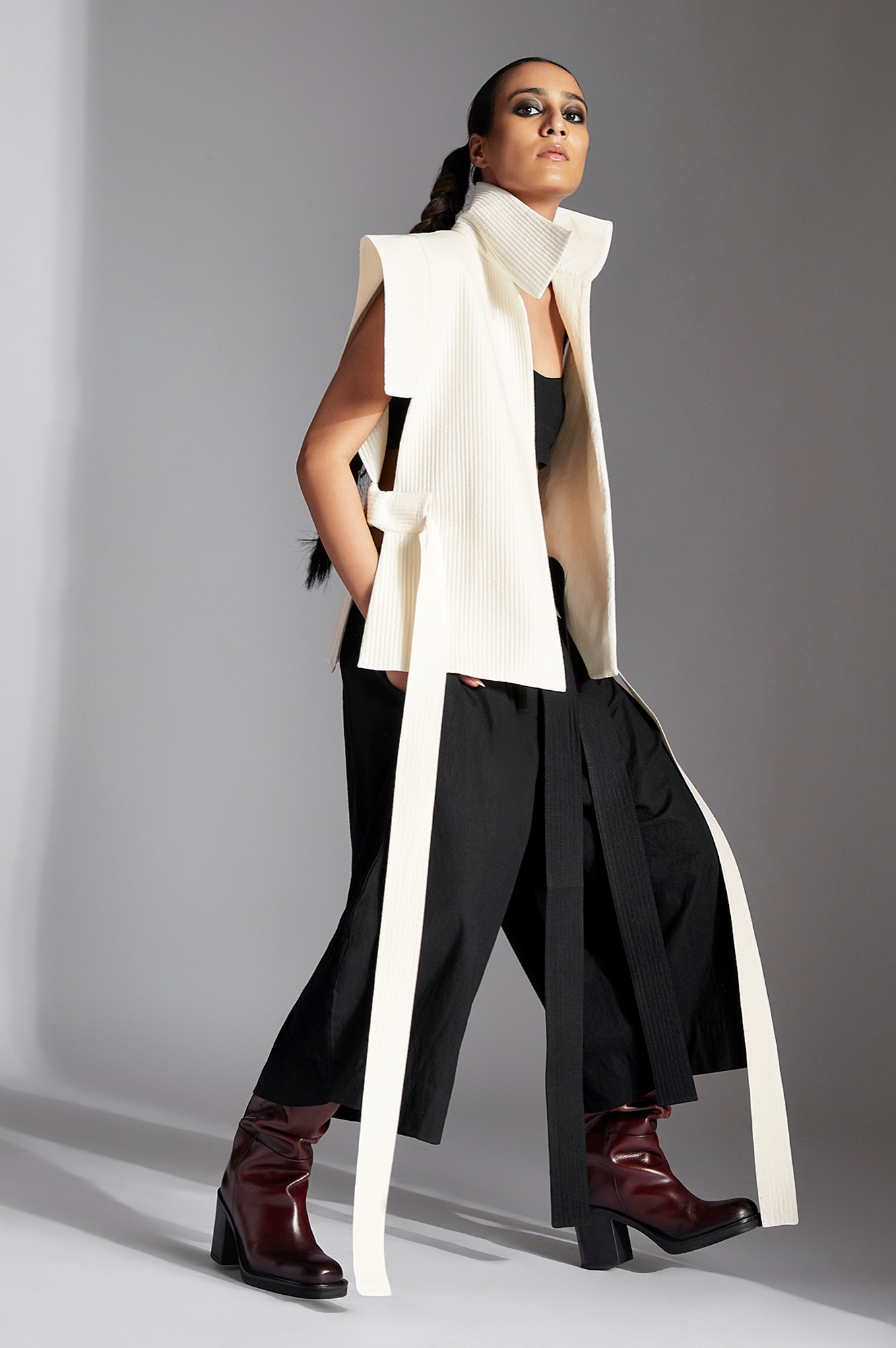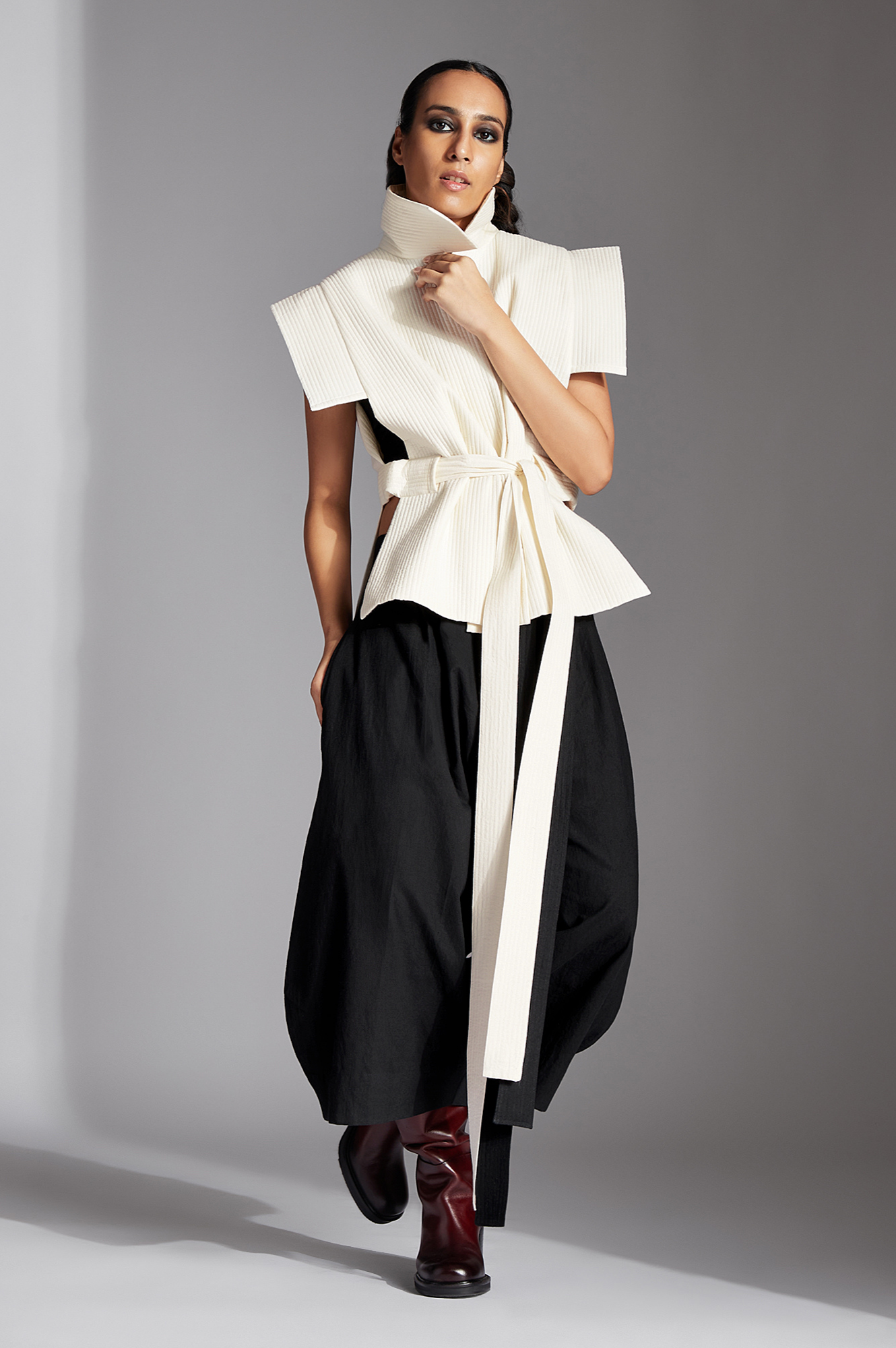 Sora is a mid-length quilted jacket with extended high collar, shoulder extensions, contrasting back detail and a belt to clinch the waist.