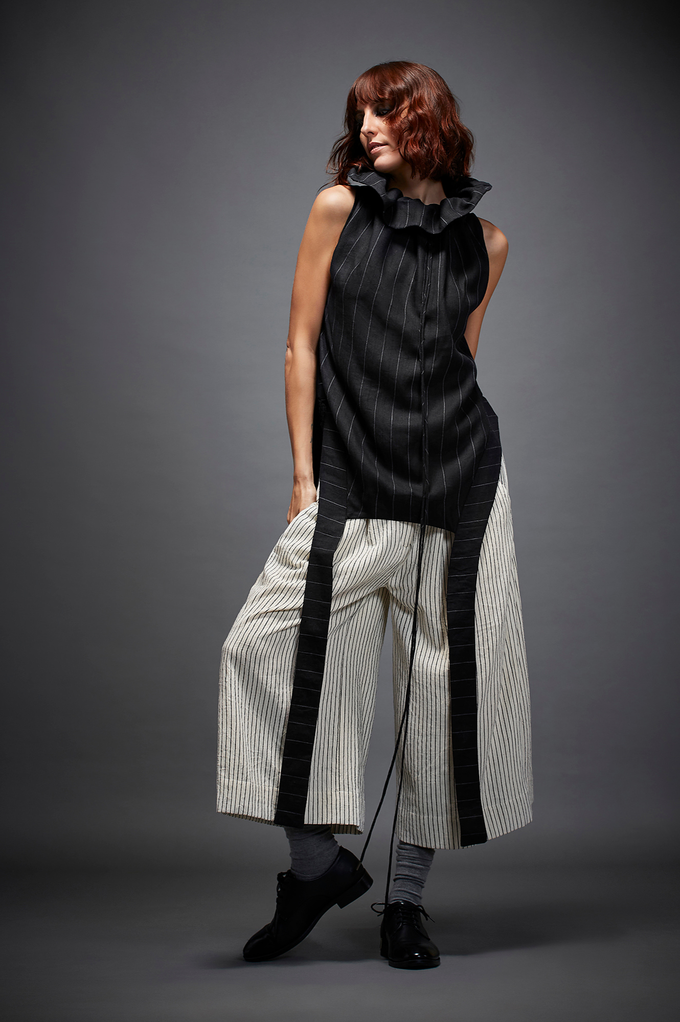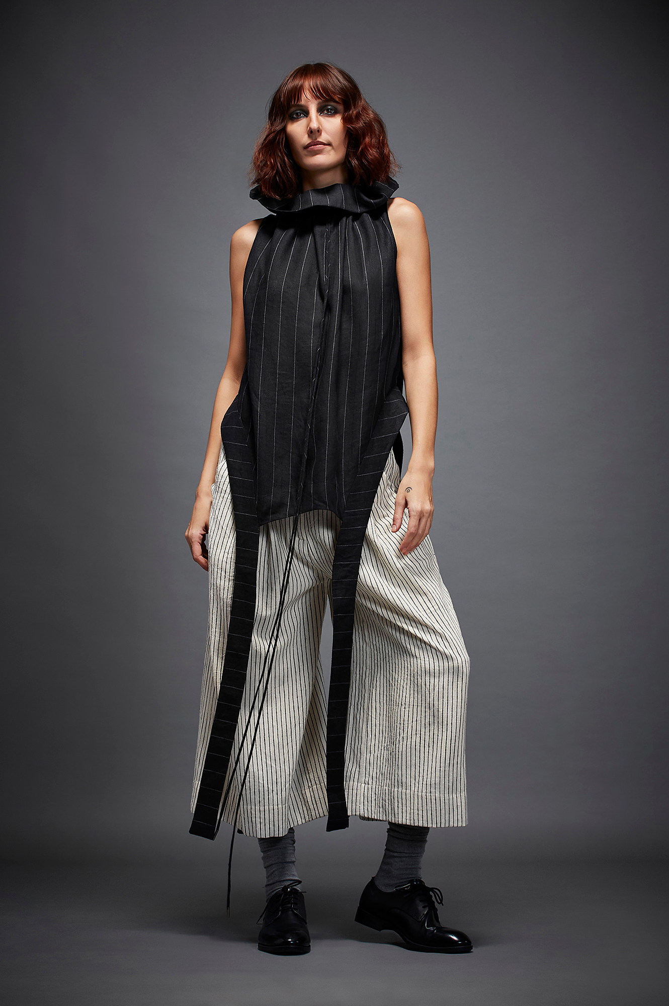 Sylvie features a frill collar with drawstring making the neck adjustable and side curved slits with a belt.