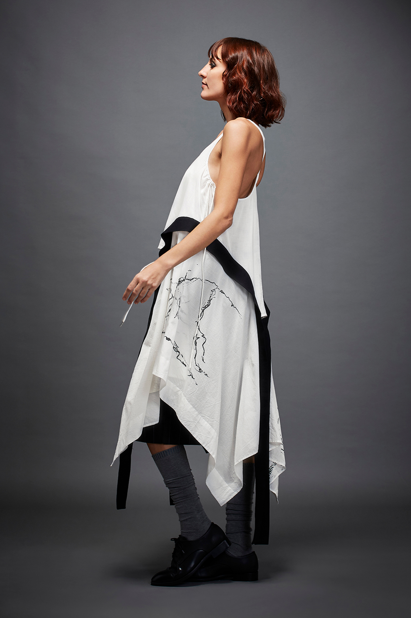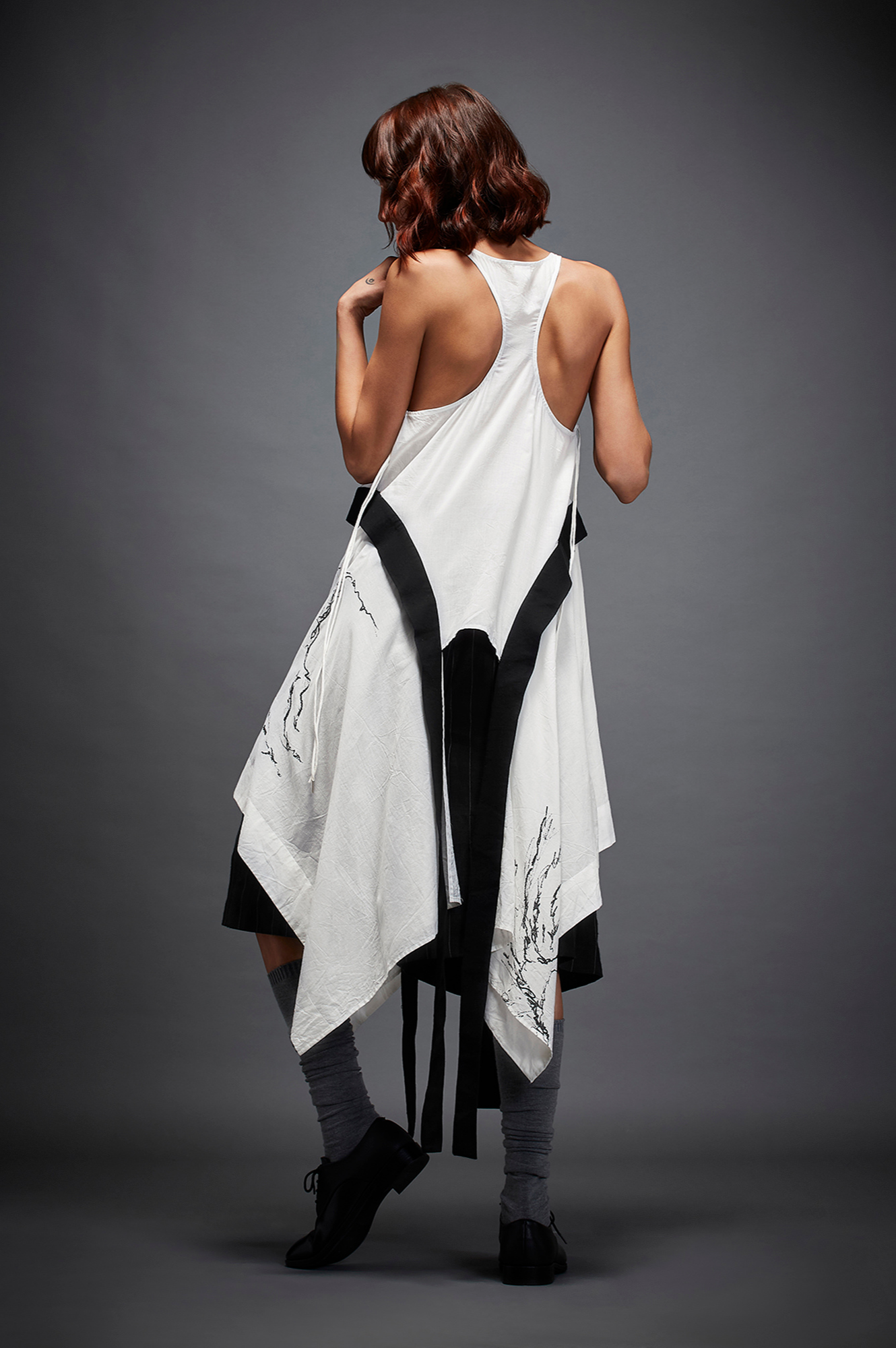 Trinity is printed racerback top that features a round neck and hanging panels with belts on both sides.
