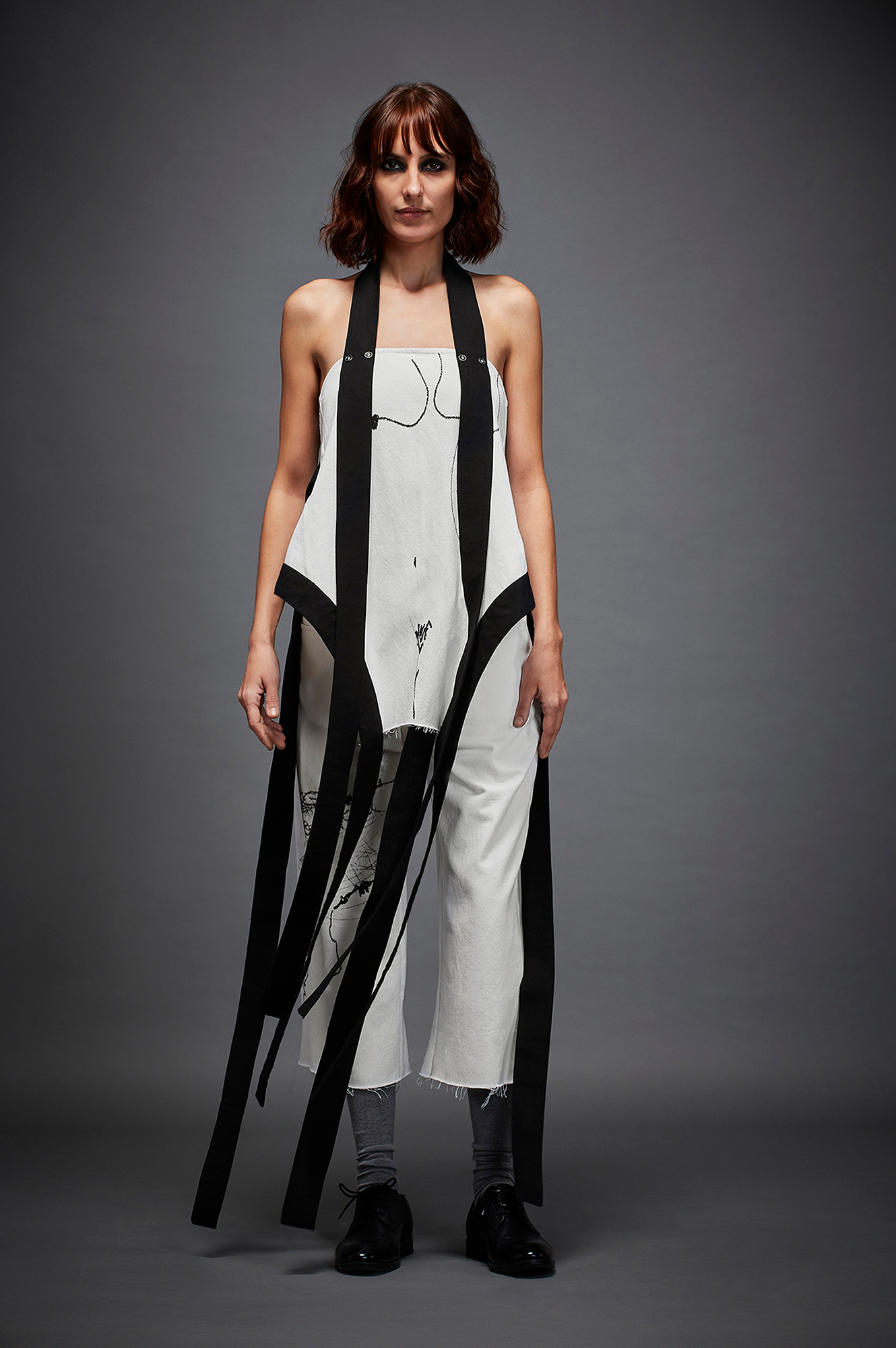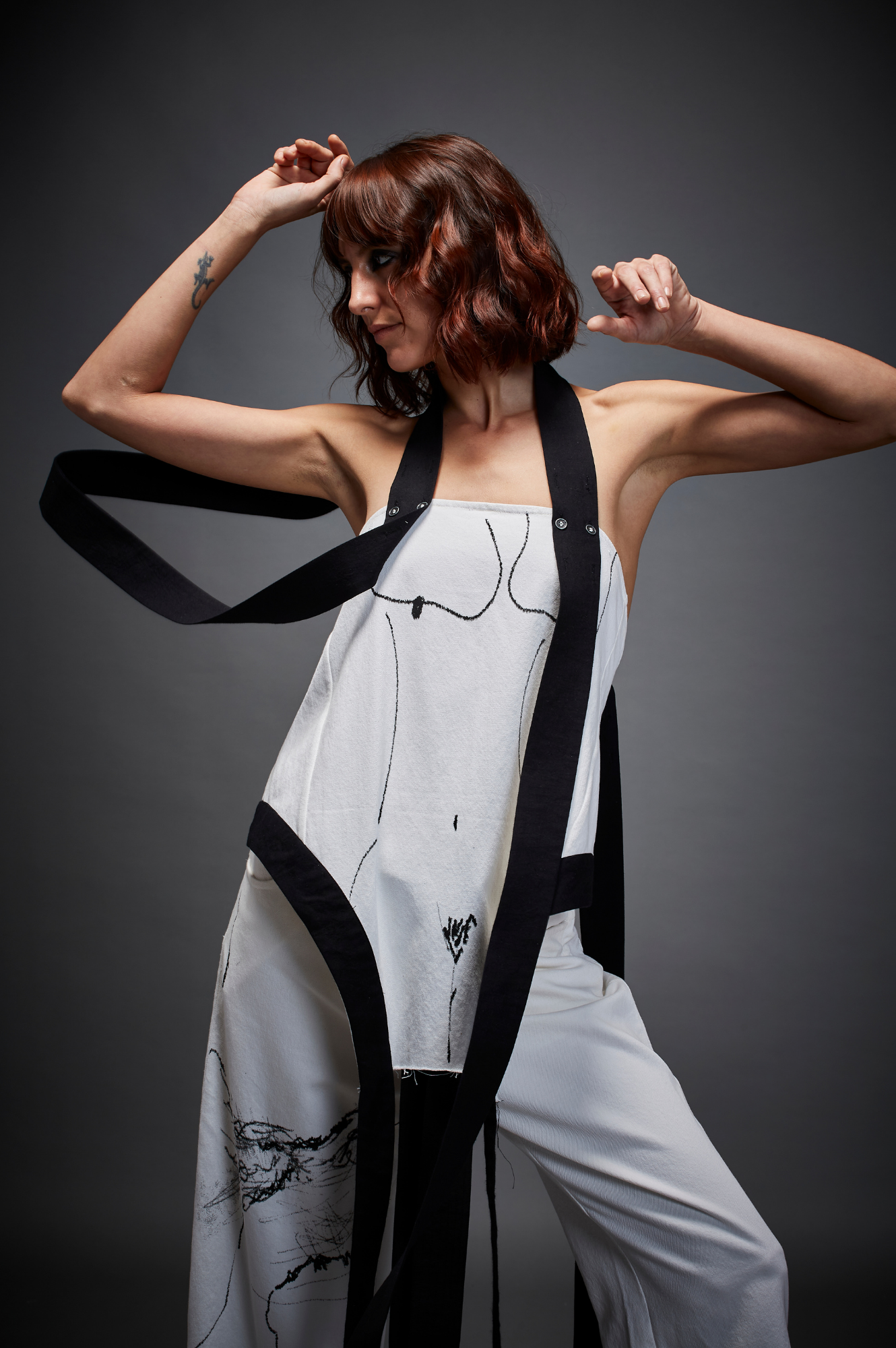 Valora is printed alterneck top that is backless and features a round neck and hanging panels with belts on both sides.