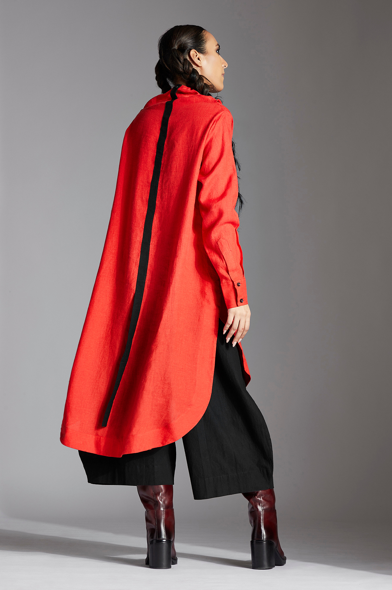 The Zale shirt exhibits a high-low style with extended high collar, narrow full sleeves and contrast back detail.